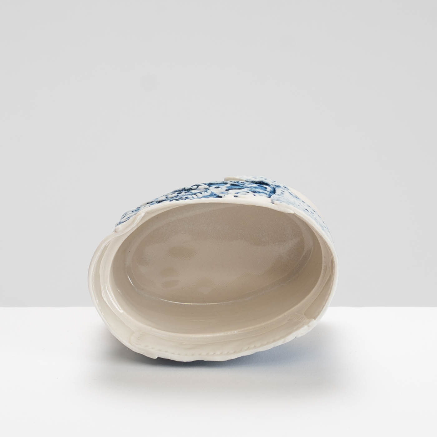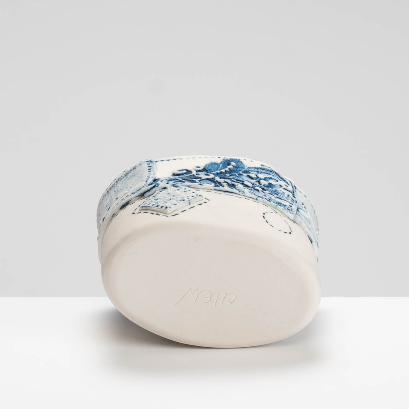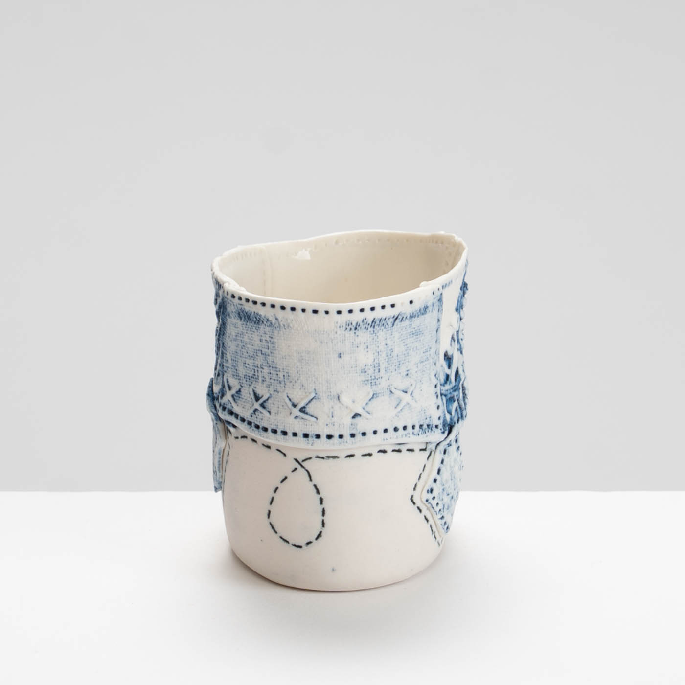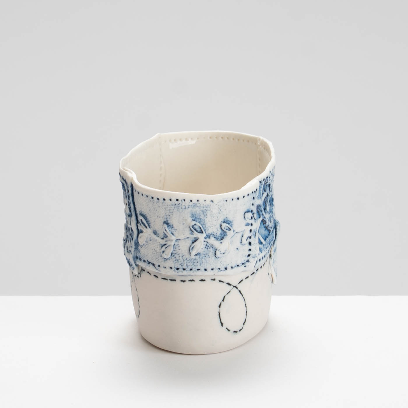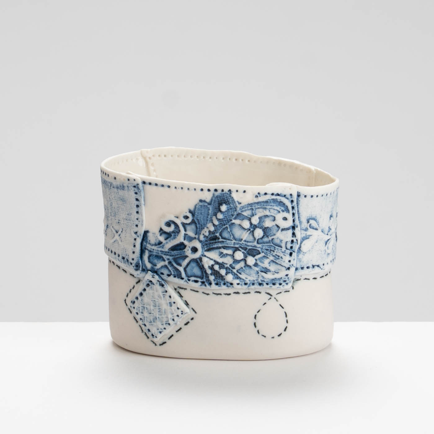 This vessel is hand-built in porcelain. It is decorated with impressed textiles, sgraffito, and marks drawn with oxides and underglaze colours.