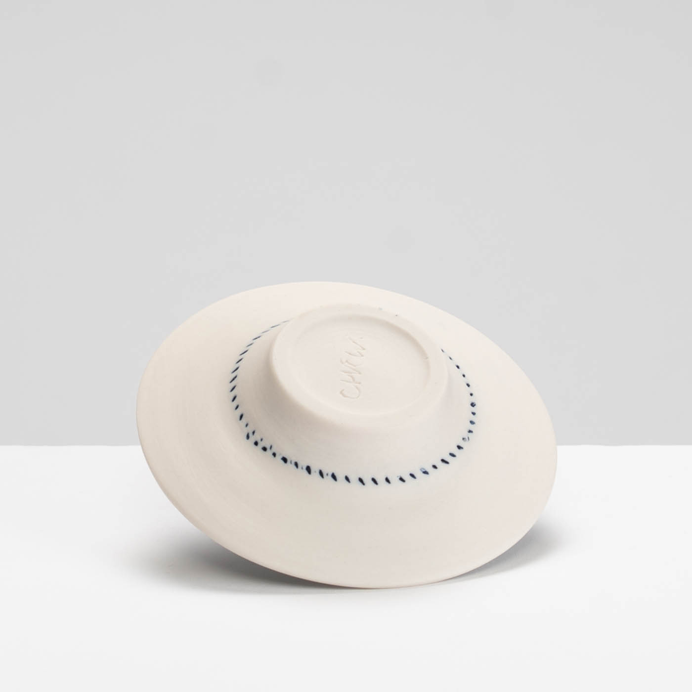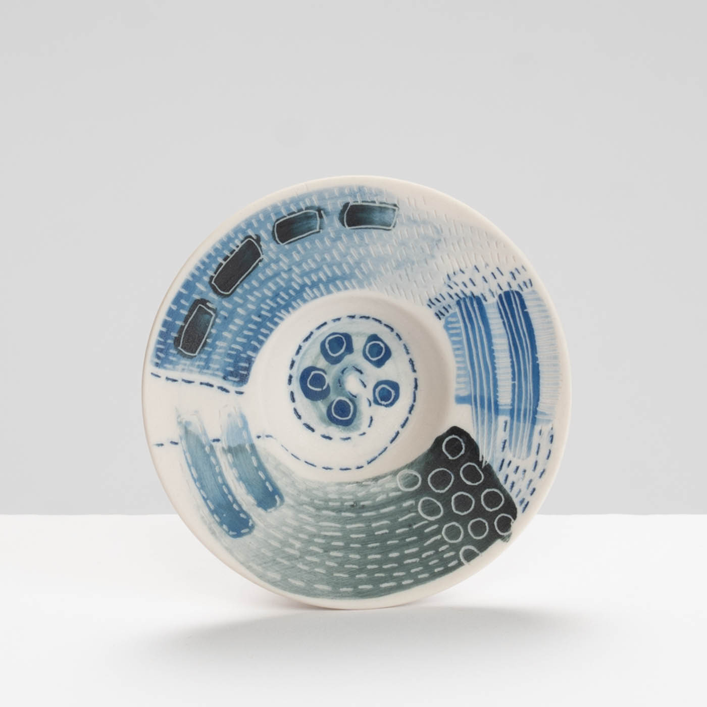 This dish is wheel thrown in porcelain. It is decorated with a variety of resist techniques, sgraffito and marks are drawn through oxides and underglaze colours.