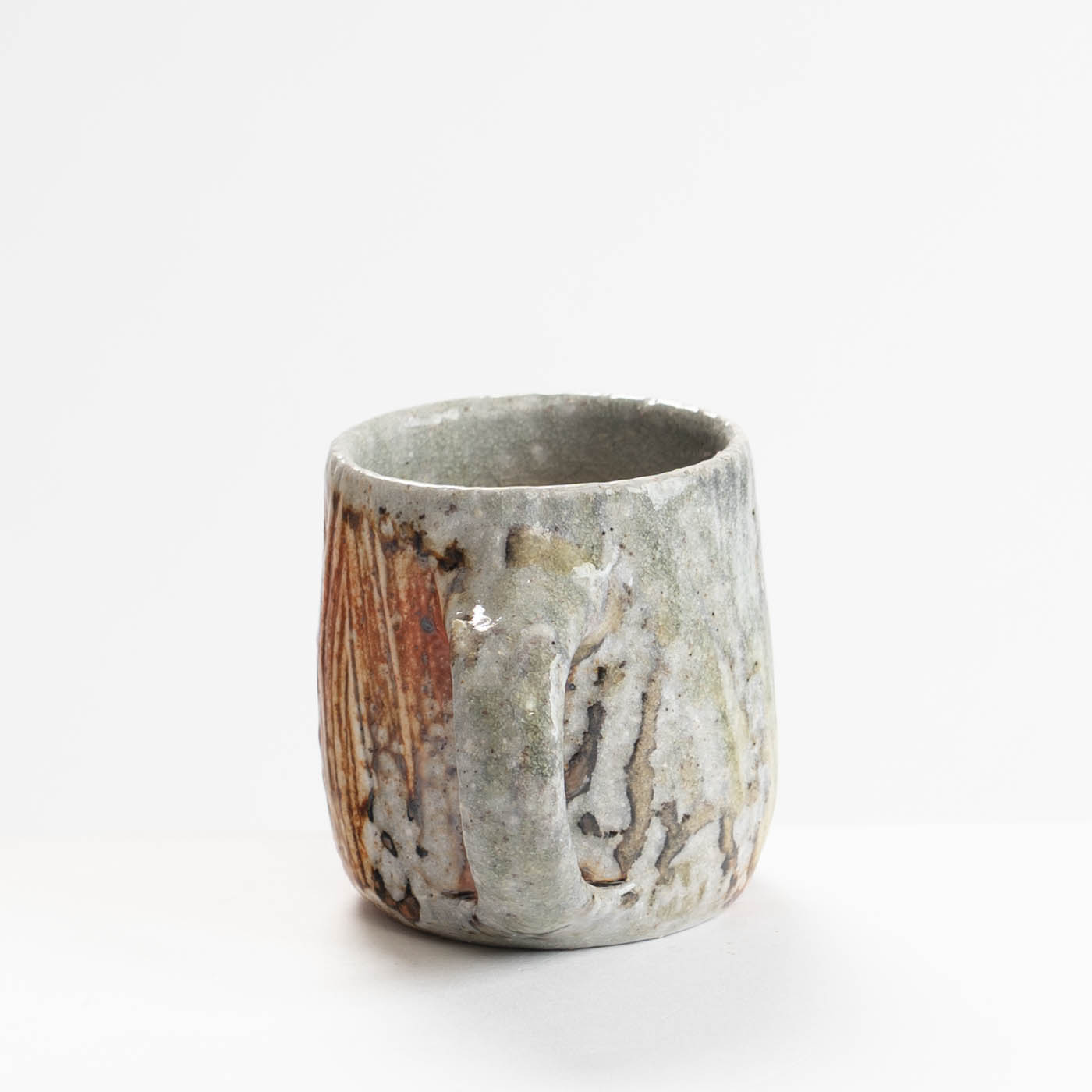 This stoneware cup is wheel-thrown and decorated with slip. It is soda fired, giving richness of colour and highlighting texture.