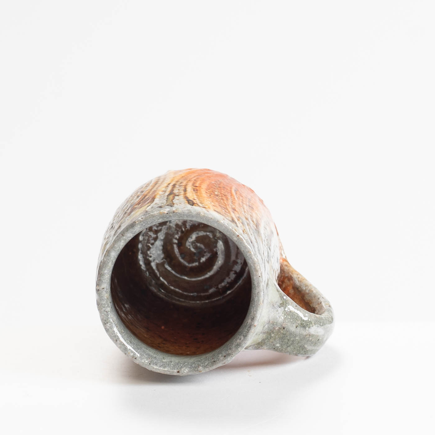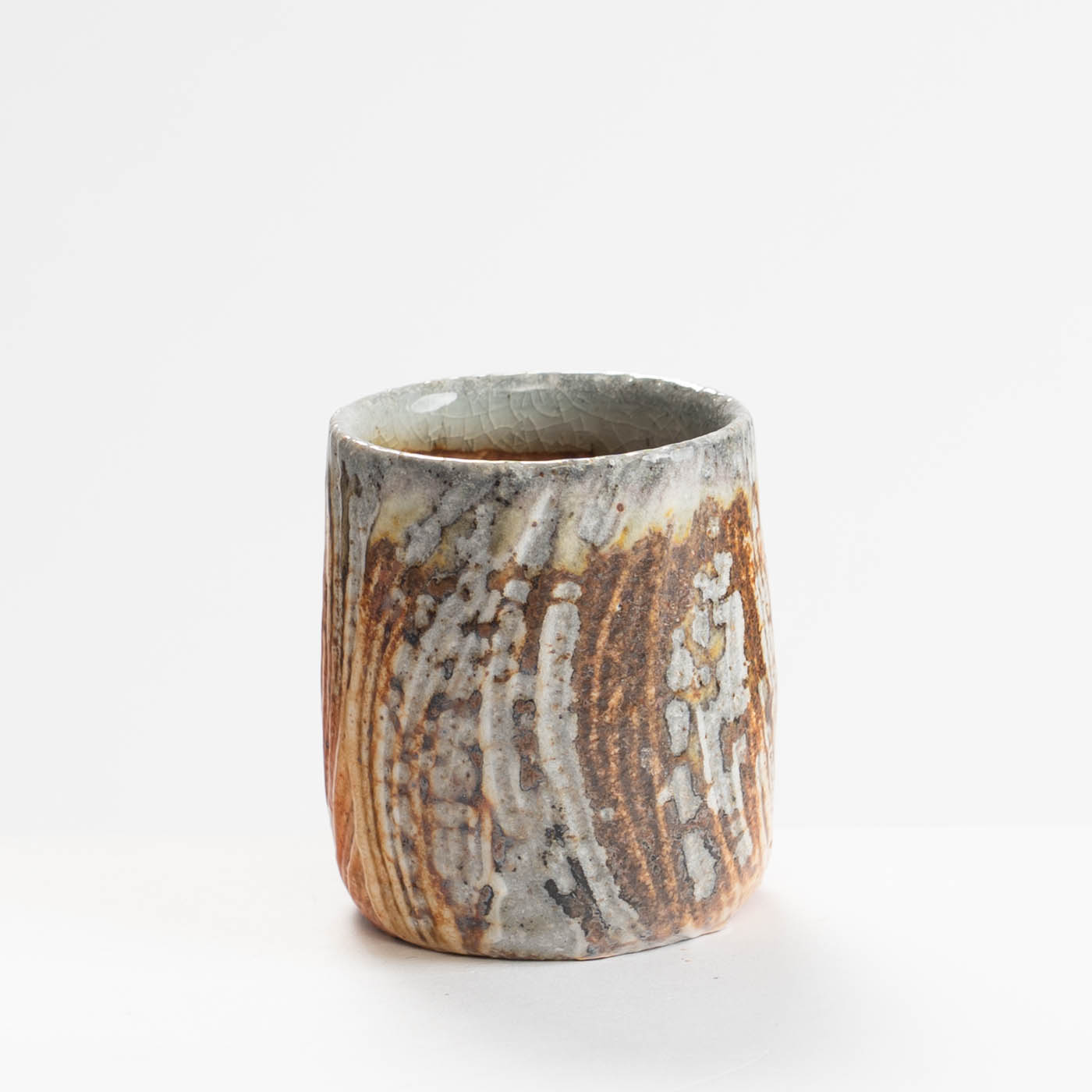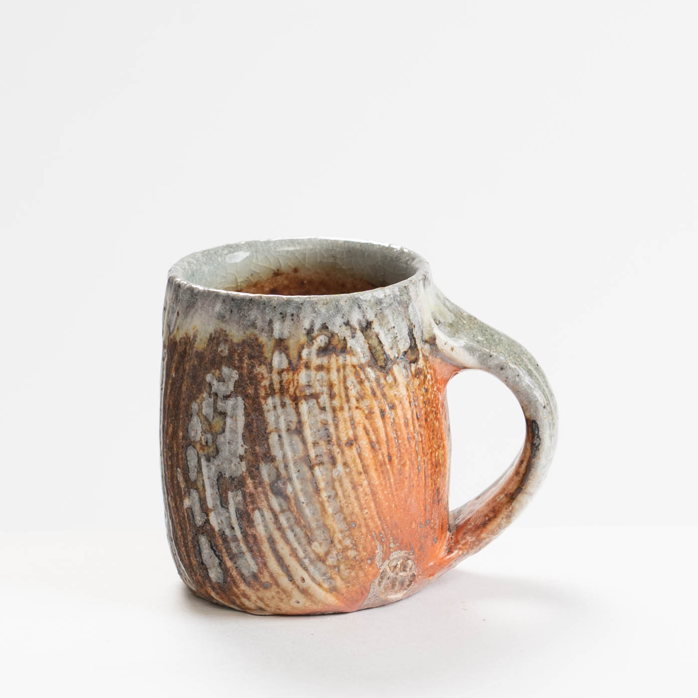 This stoneware cup is wheel-thrown and decorated with slip. It is soda fired, giving richness of colour and highlighting texture.