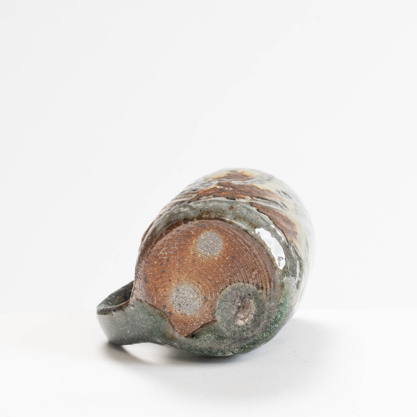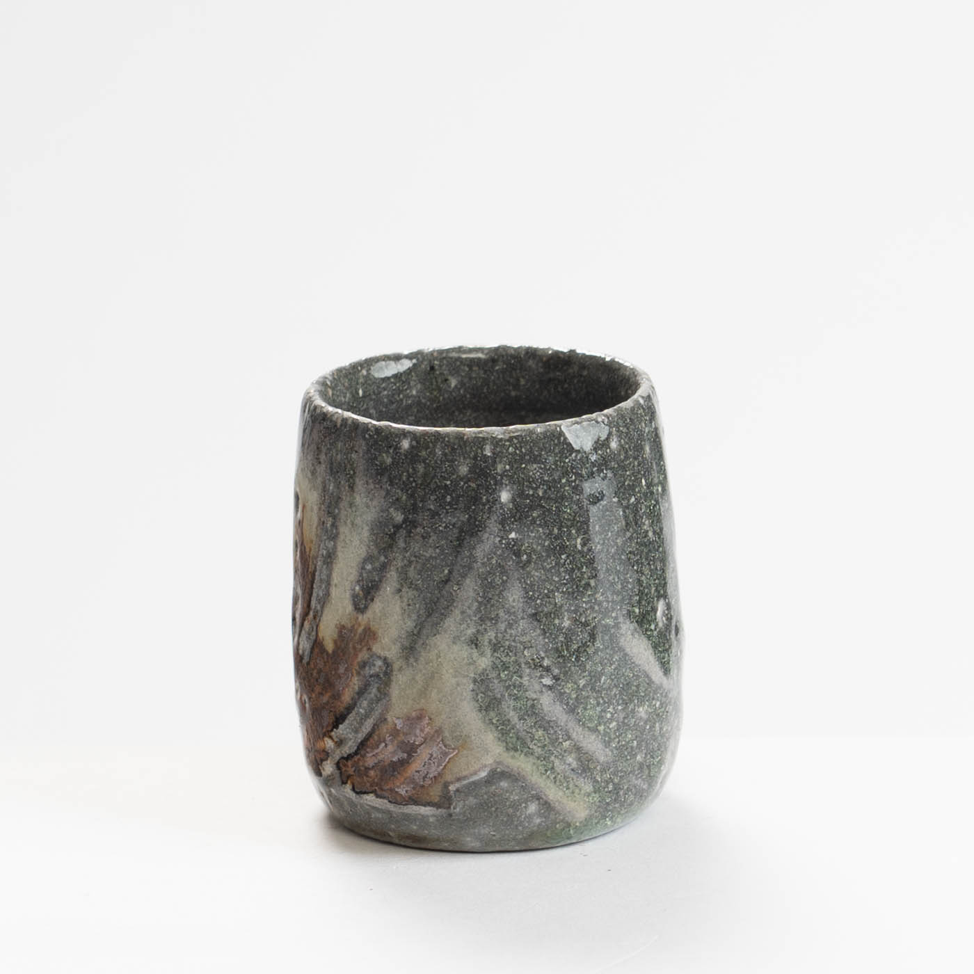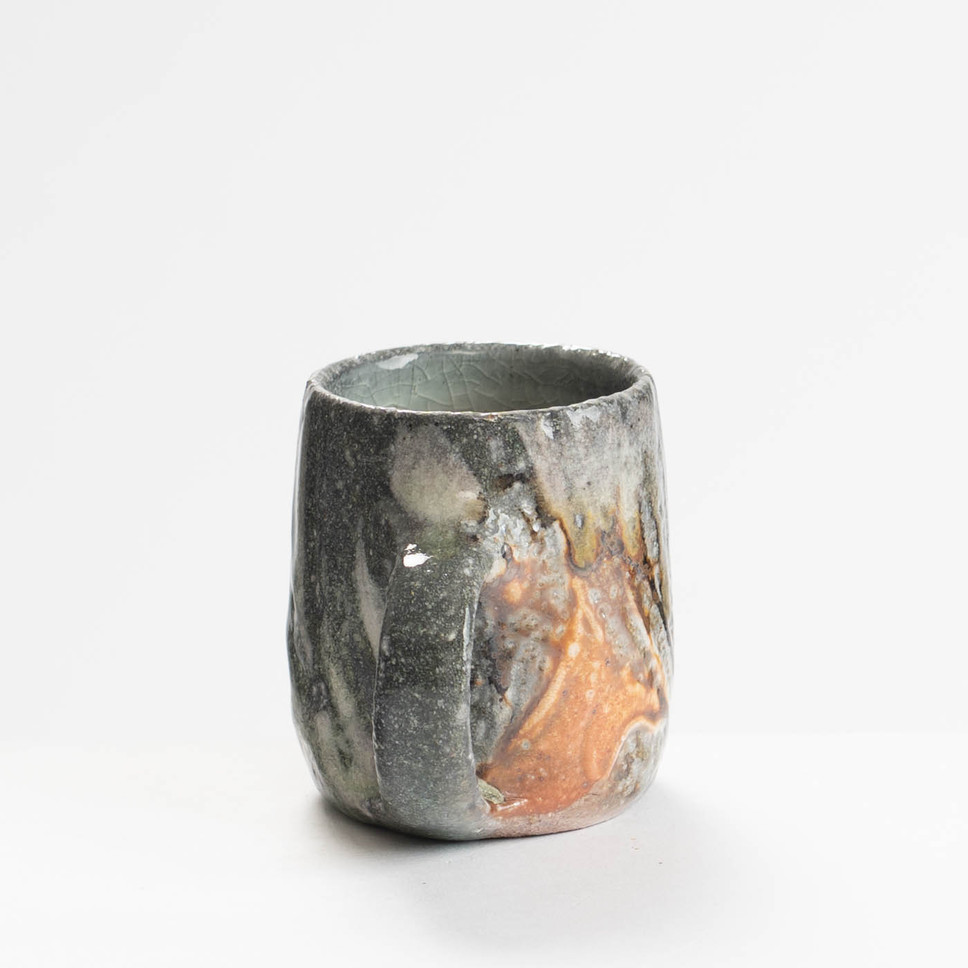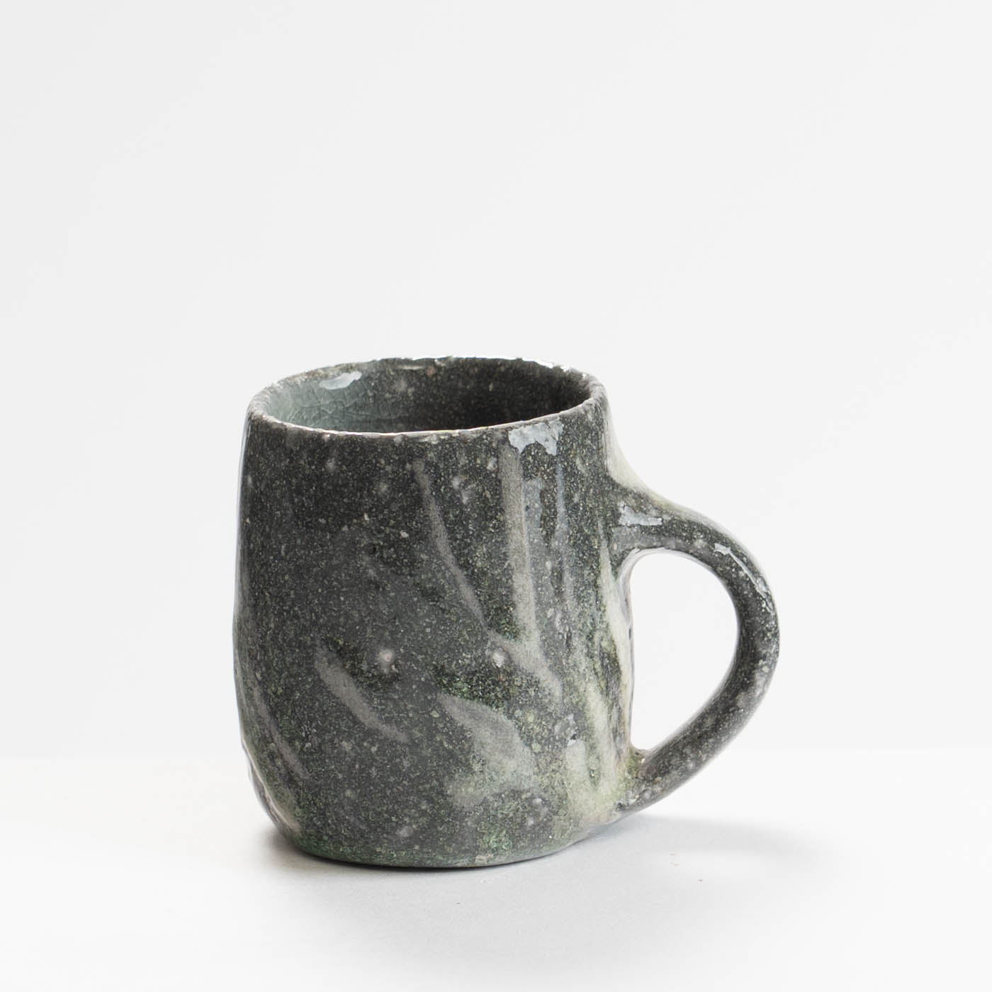This stoneware cup is wheel-thrown and decorated with slip. It is soda fired, giving richness of colour and highlighting texture.