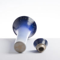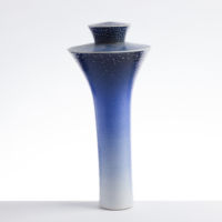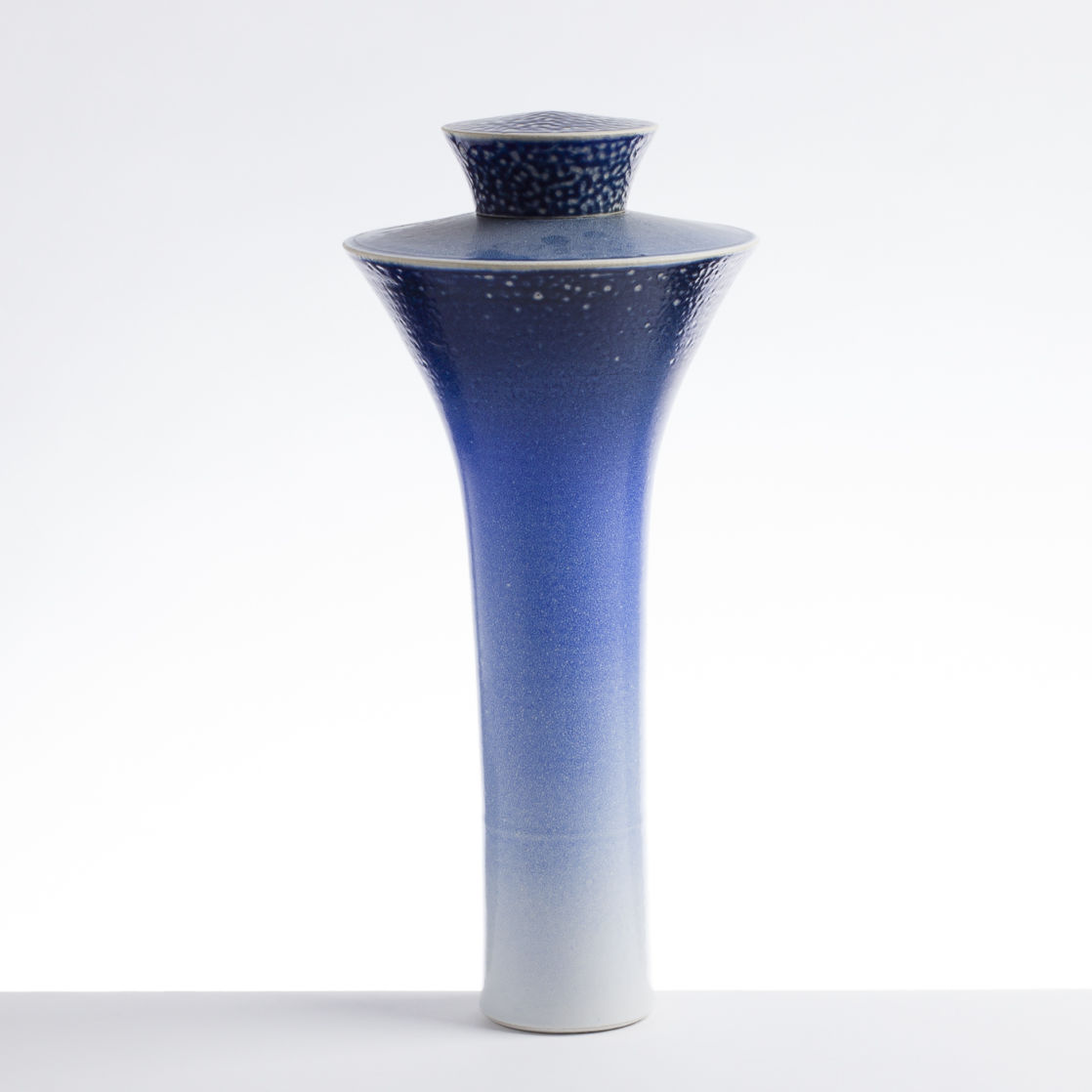 This elegant lidded jar is carefully thrown and constructed, and decorated in a bright blue salt glaze.