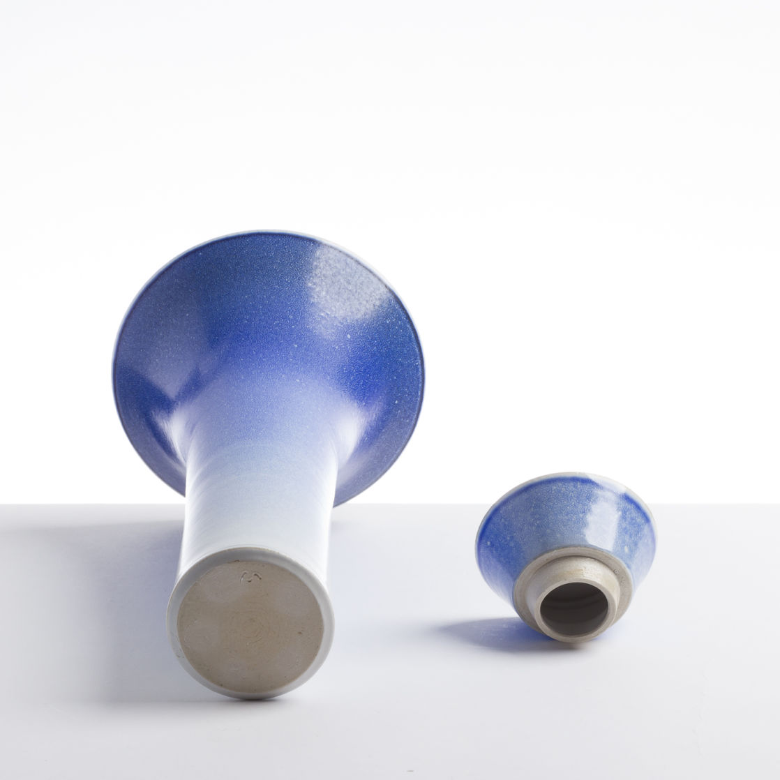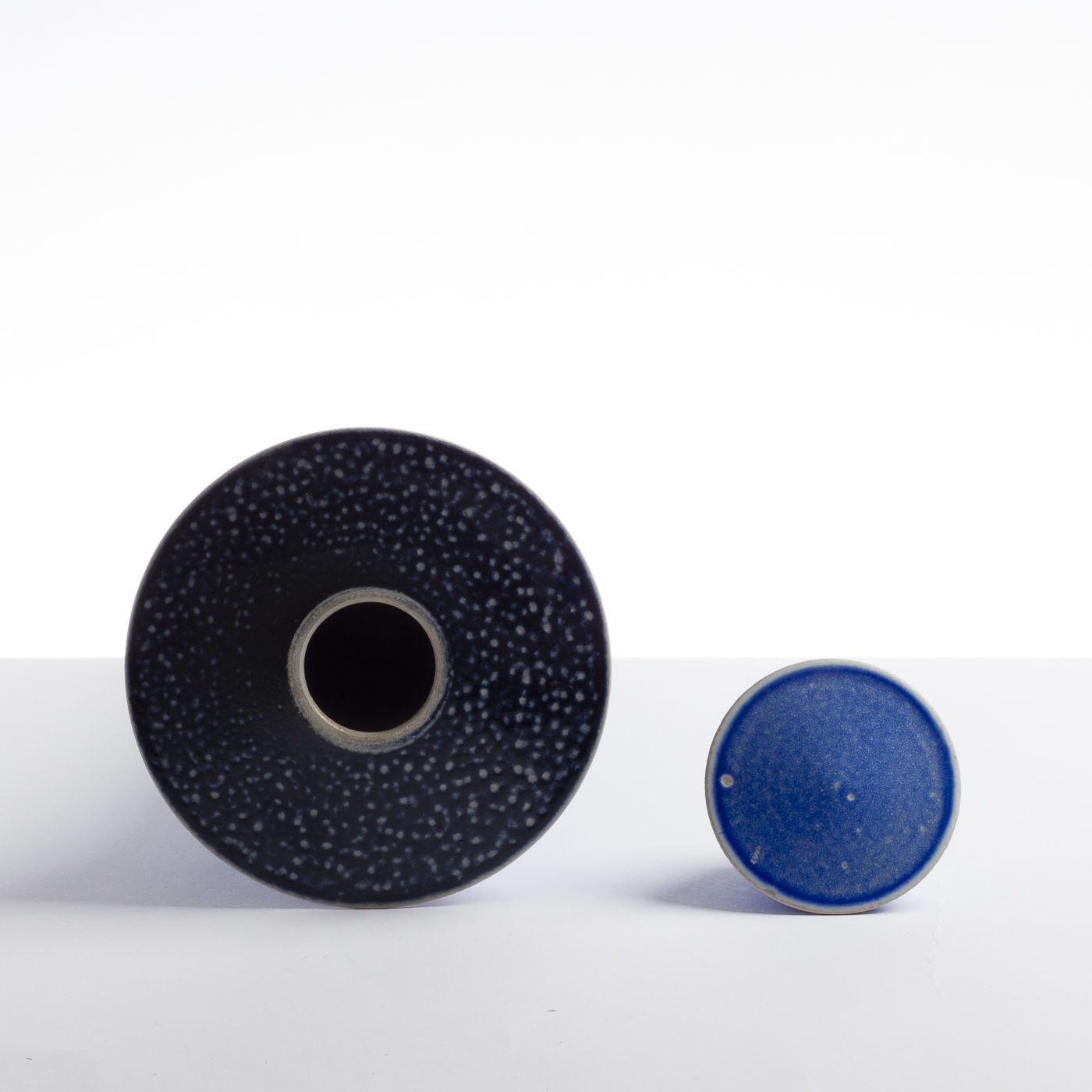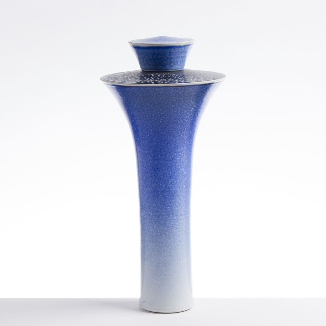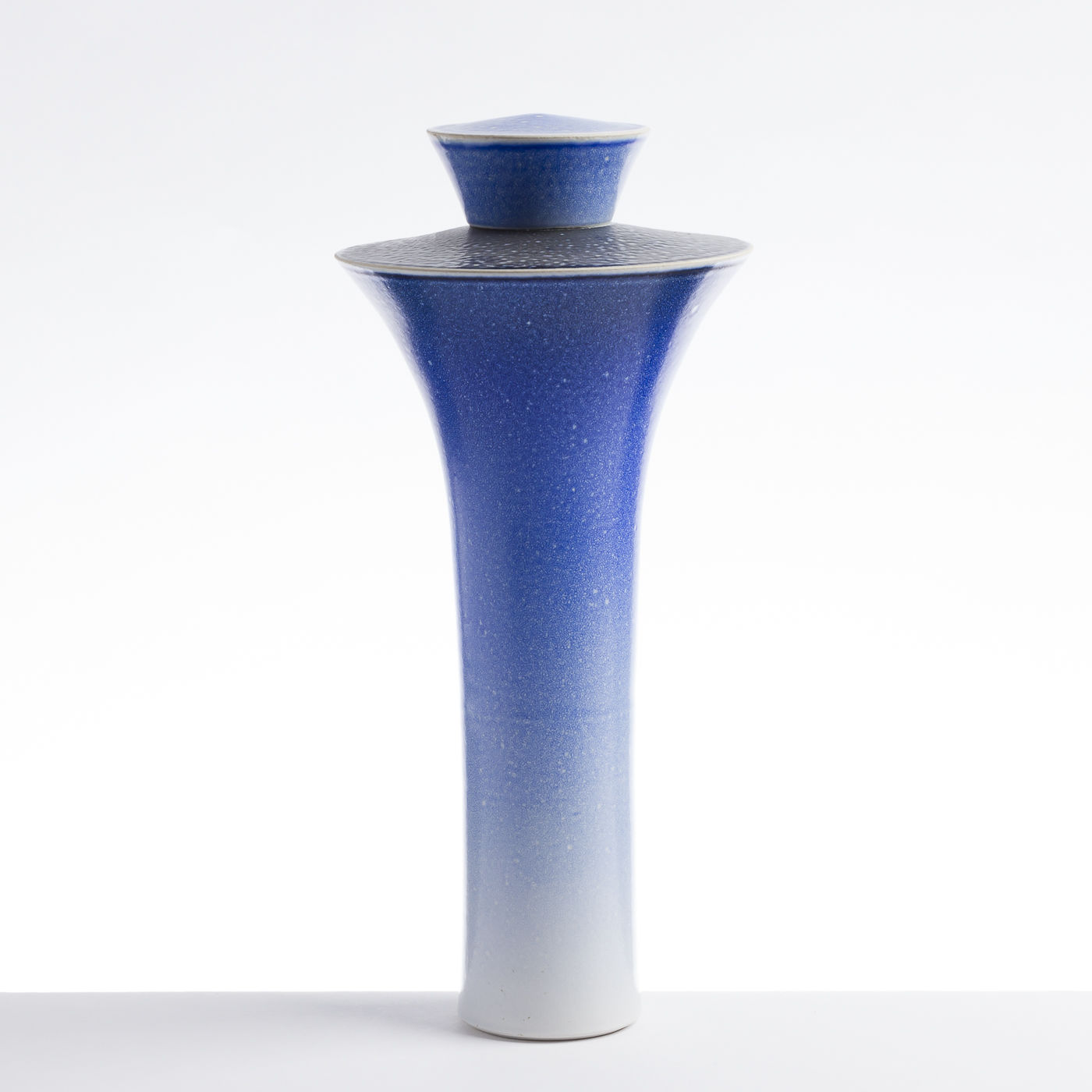 This elegant lidded jar is carefully thrown and constructed, and decorated in a bright blue salt glaze.