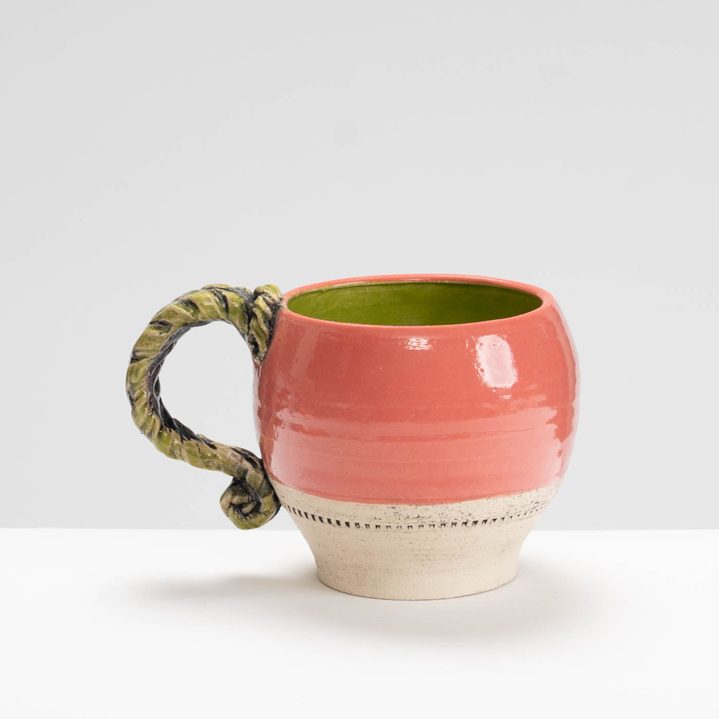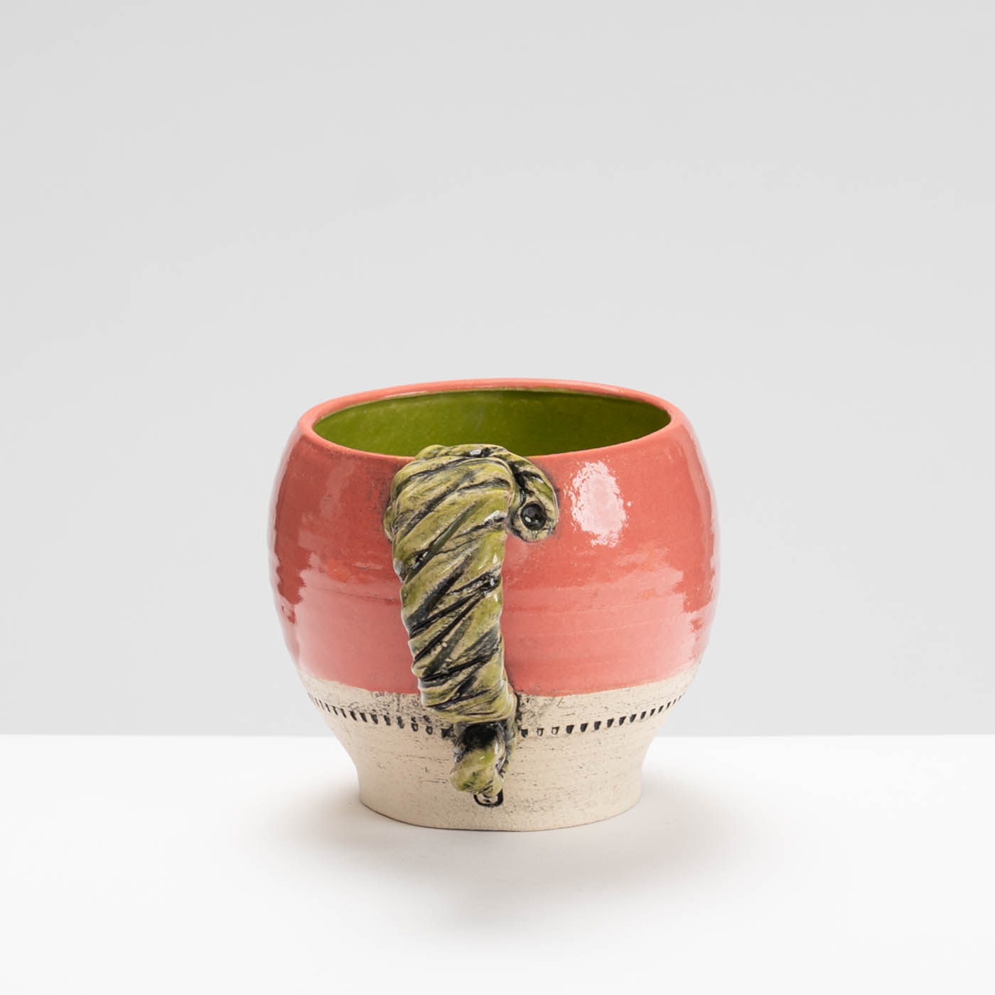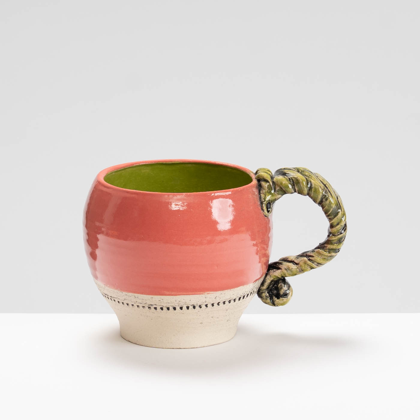 This mug is wheel-thrown in a grogged stoneware clay. The bright glaze colours contrasting with the bare clay are inspired the vivid and rugged terrain of a formative period of Lesley’s life in Australia. The decorative details are picked out with underglaze and reference ancient artefacts, period garden ornamentation and architecture.