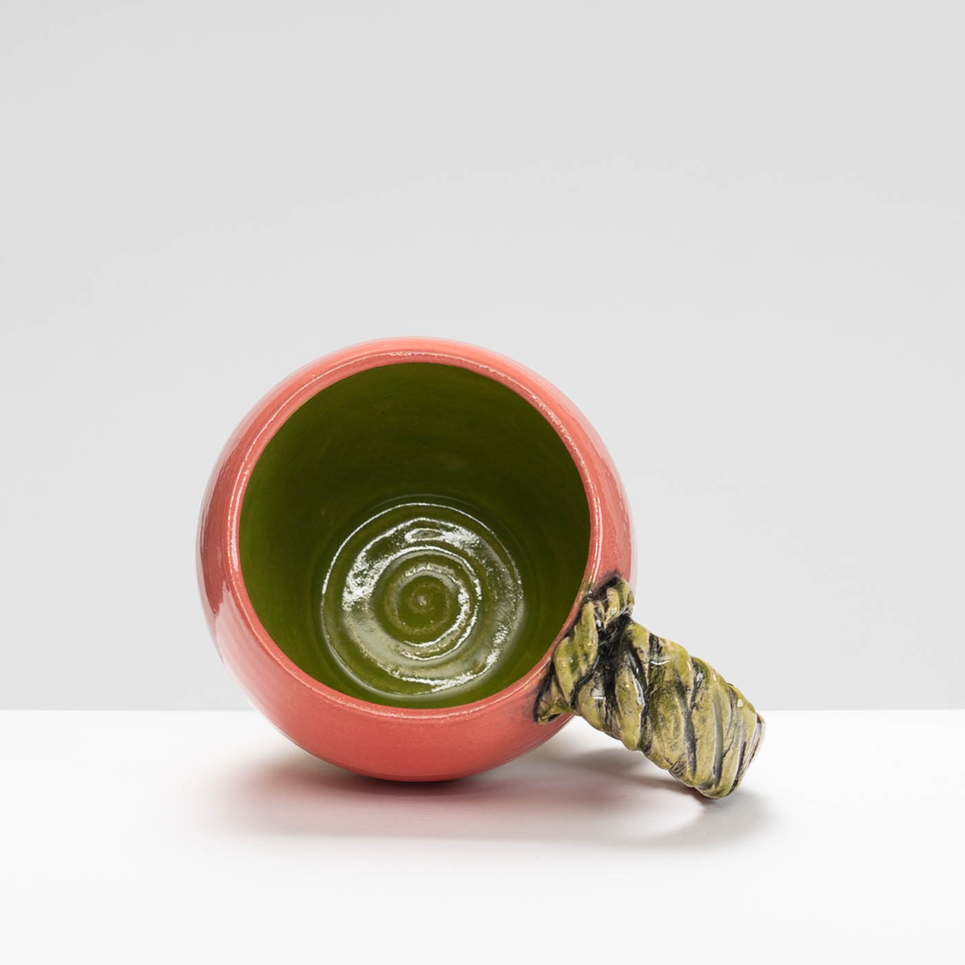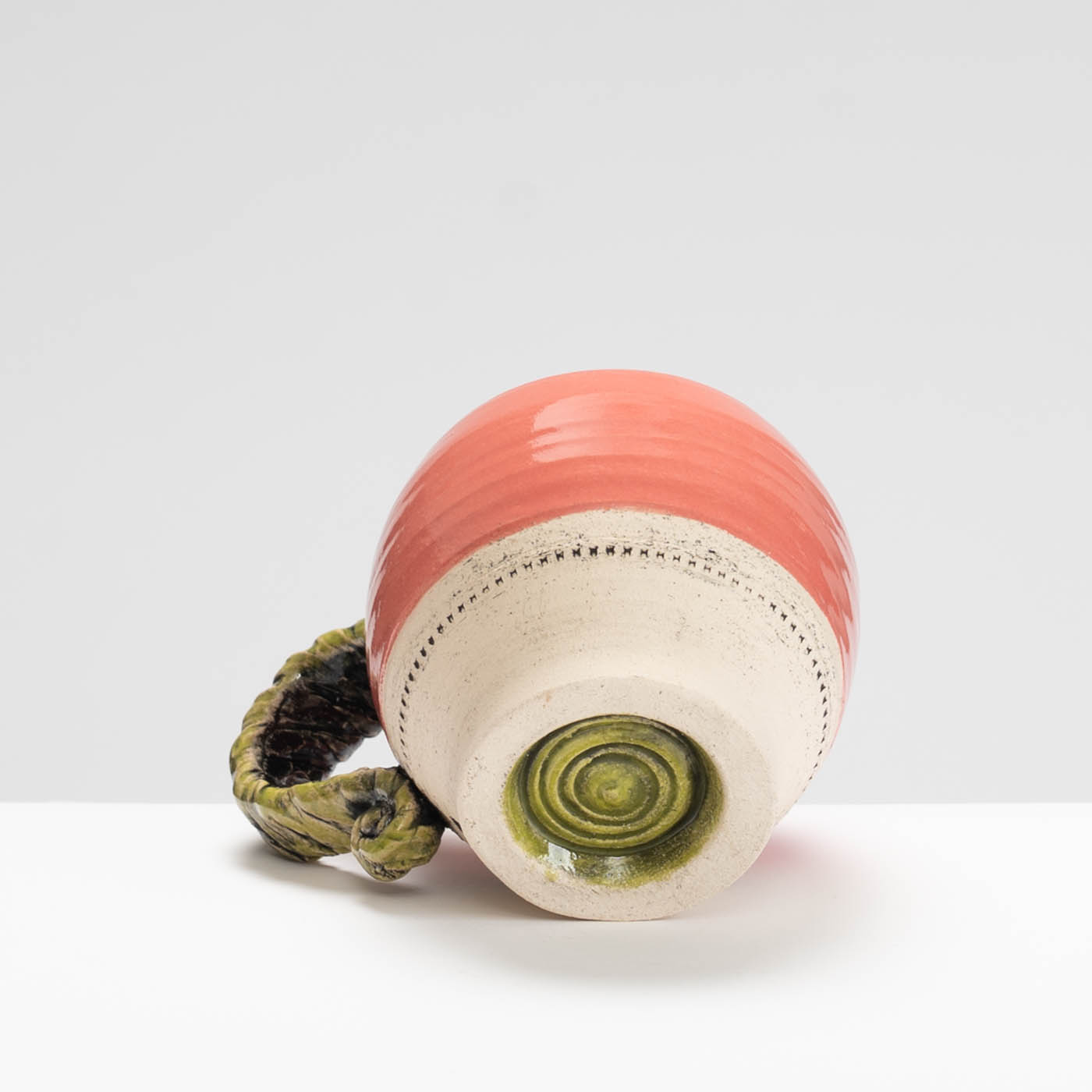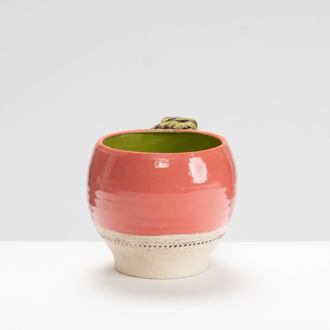 This mug is wheel-thrown in a grogged stoneware clay. The bright glaze colours contrasting with the bare clay are inspired the vivid and rugged terrain of a formative period of Lesley’s life in Australia. The decorative details are picked out with underglaze and reference ancient artefacts, period garden ornamentation and architecture.