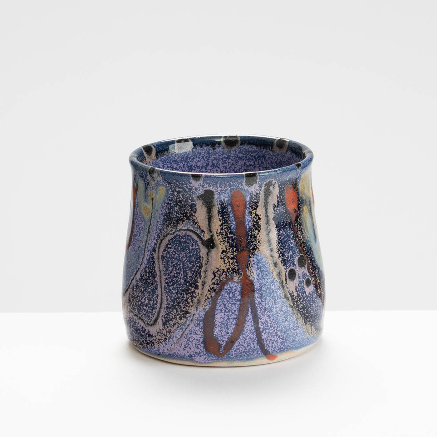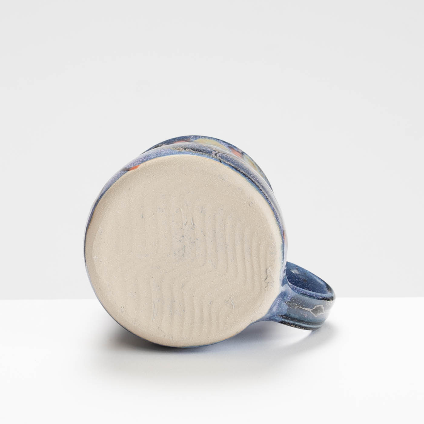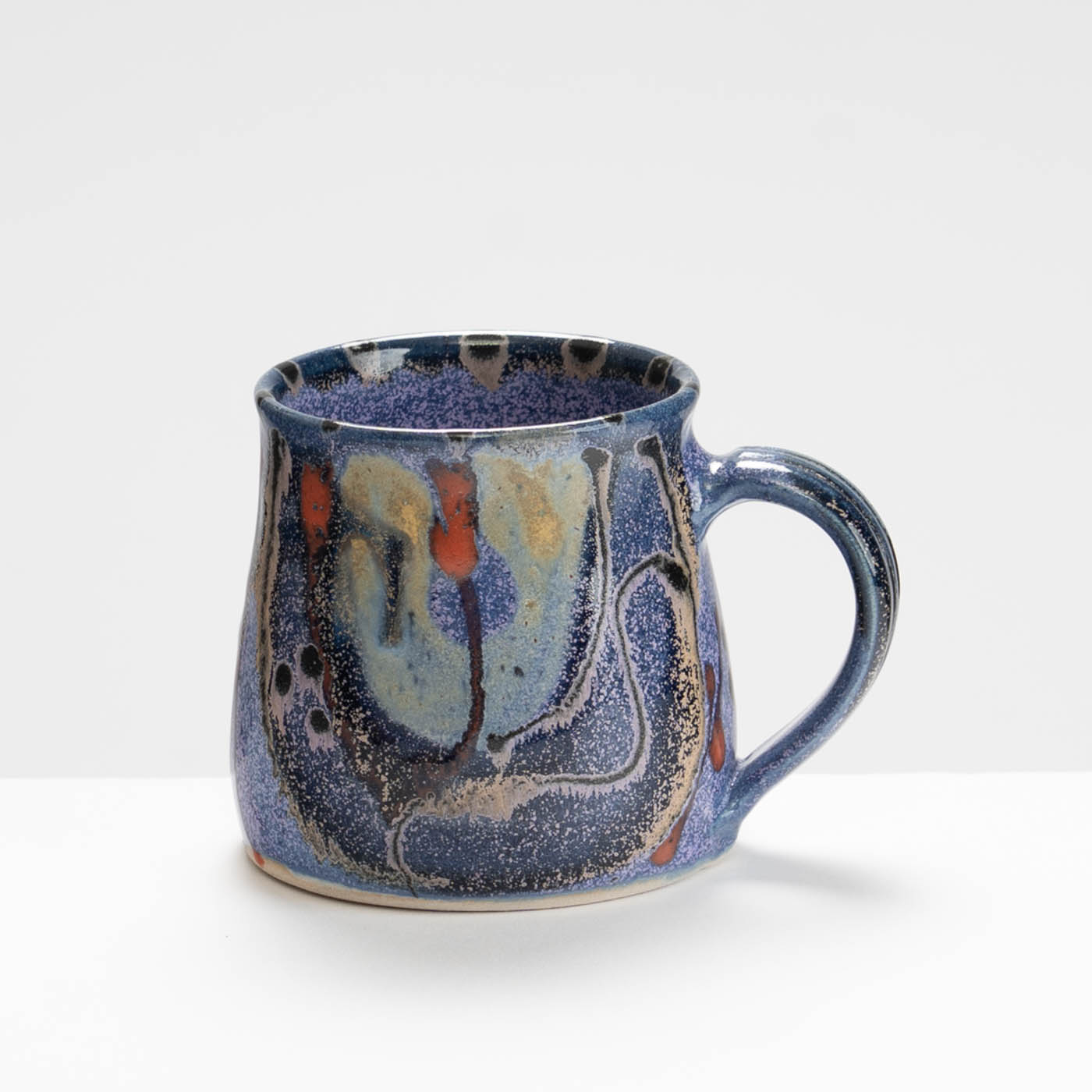 This stoneware mug is wheel-thrown and decorated with free abstract designs using vibrant colourful glazes.