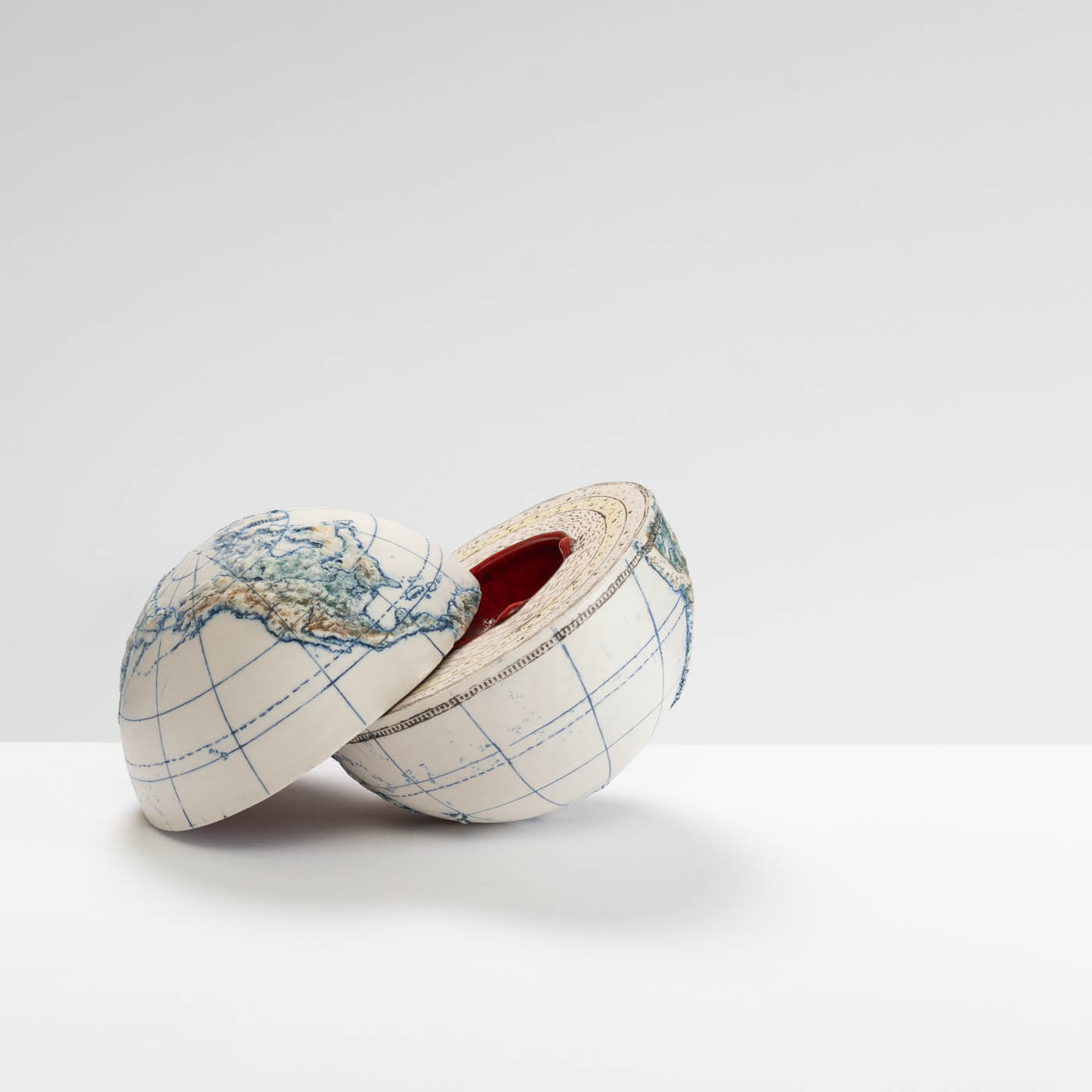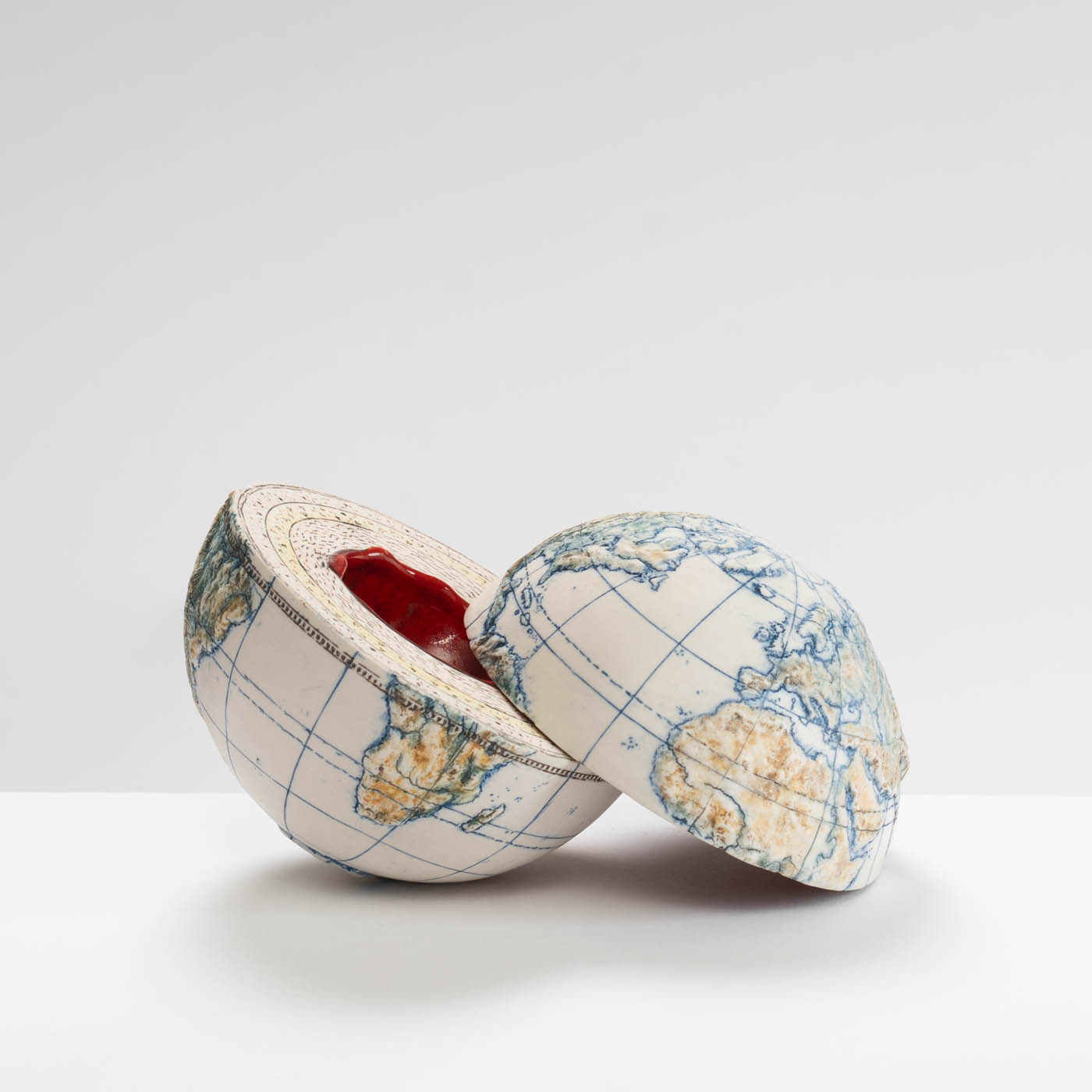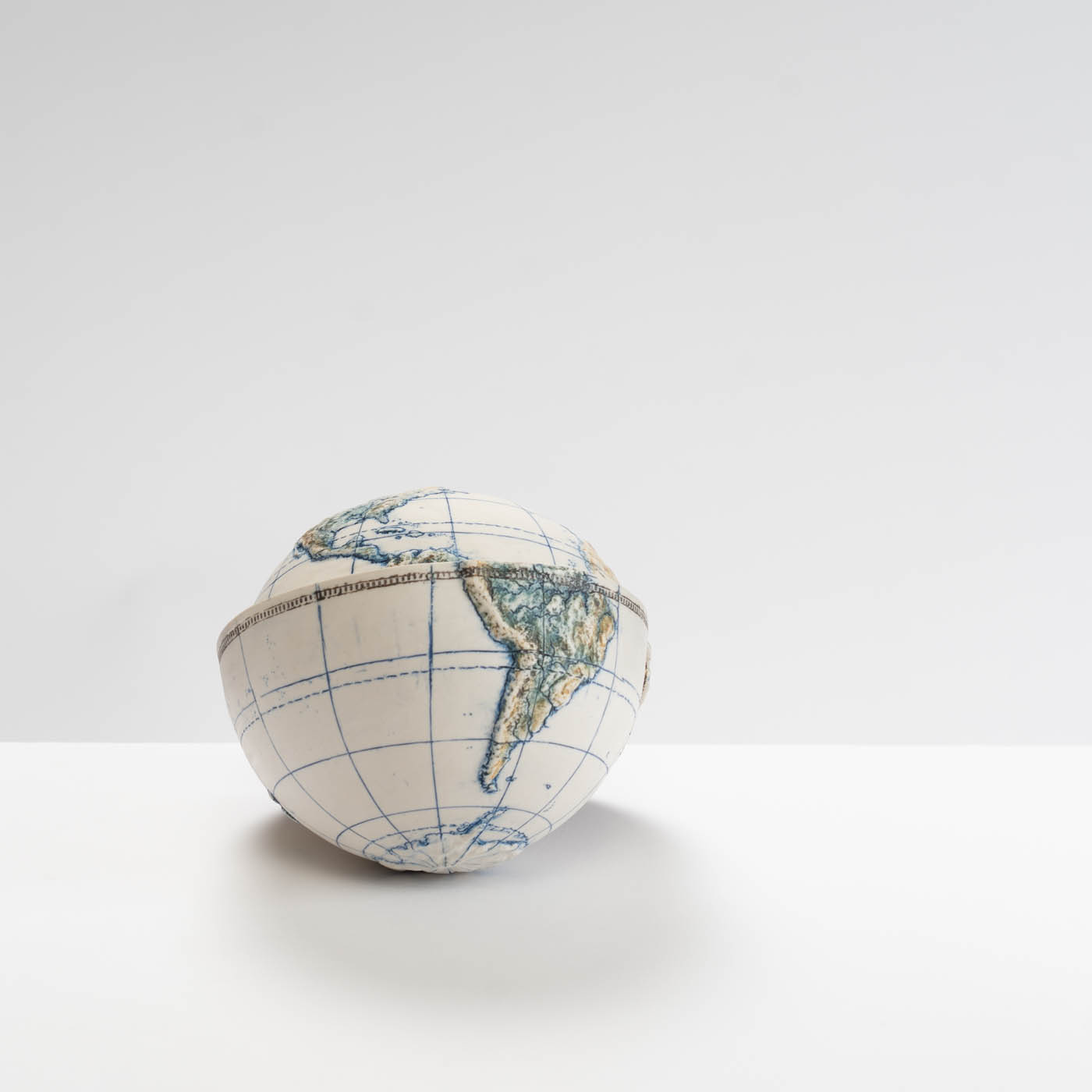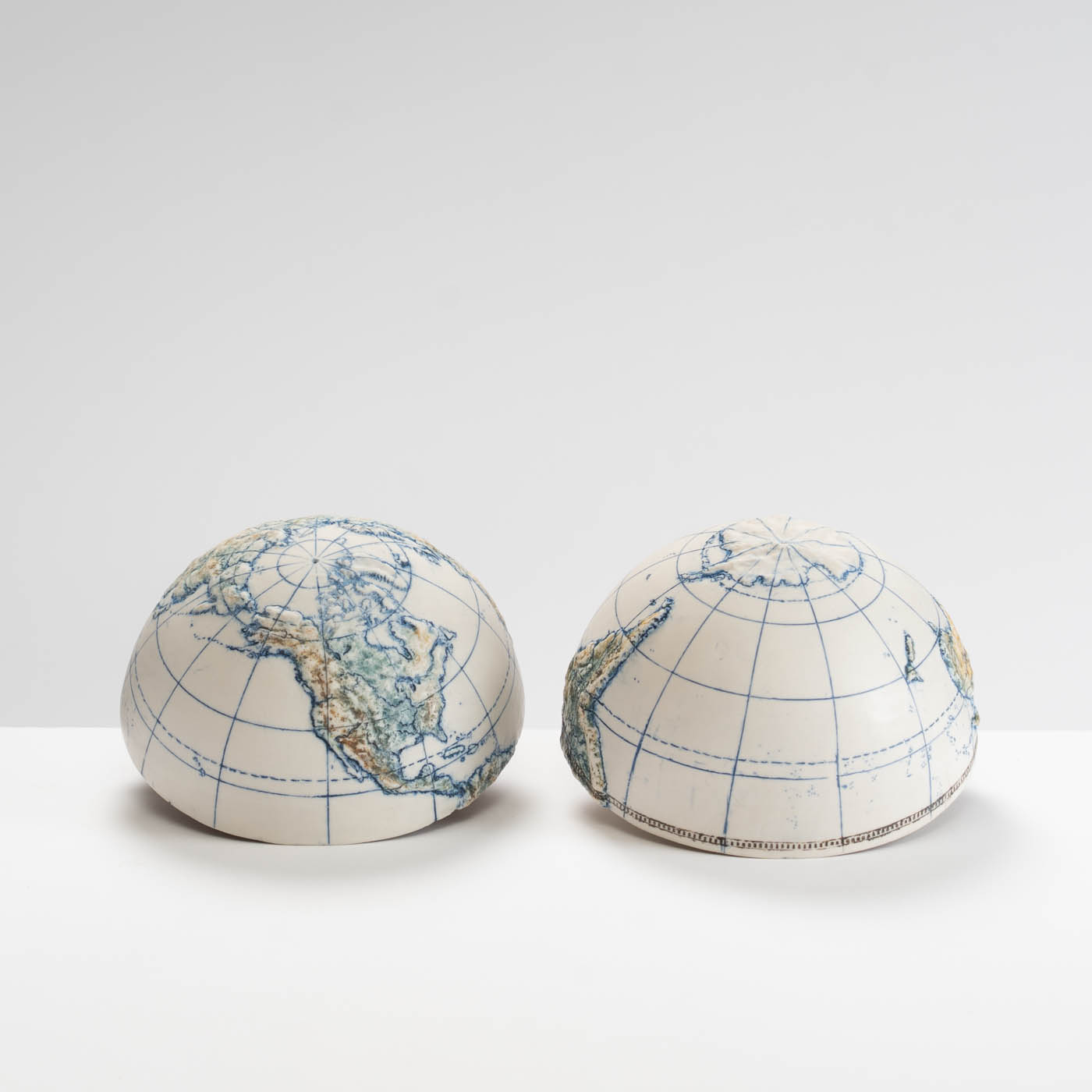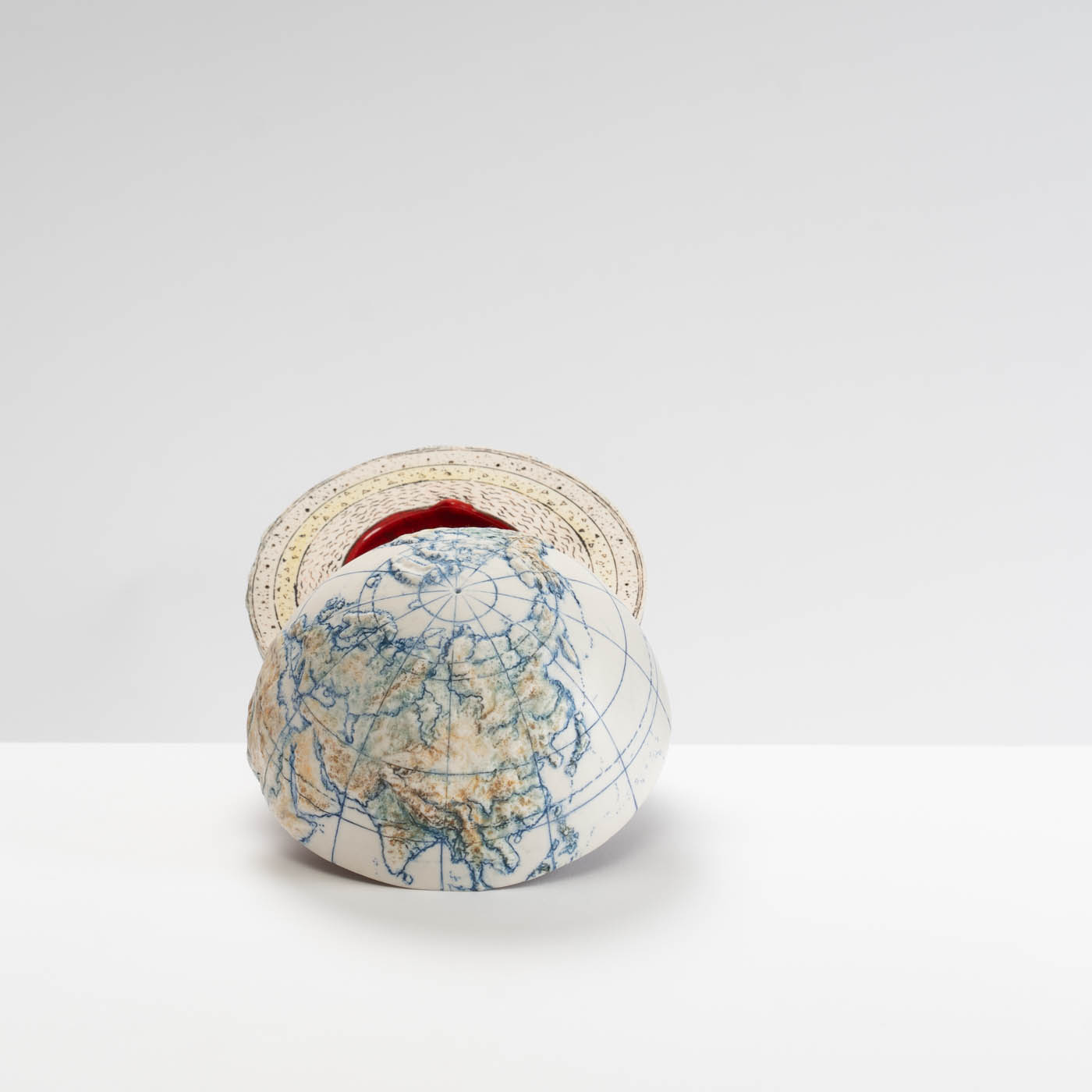 Loraine's background as a map maker informs her ceramics practice. Clay provides a tangible connection to the earth’s surface, through which her work explores how maps shape our sense of place and belonging. Relief maps and domestic-scale vessels are decorated with cartographically accurate drawings. By playing with scale and volume—whether through a pocket globe that places the world in the palm of the hand, or topography with amplified relief—her work addresses specific themes, including environmental and social inequality, and monumental journeys.