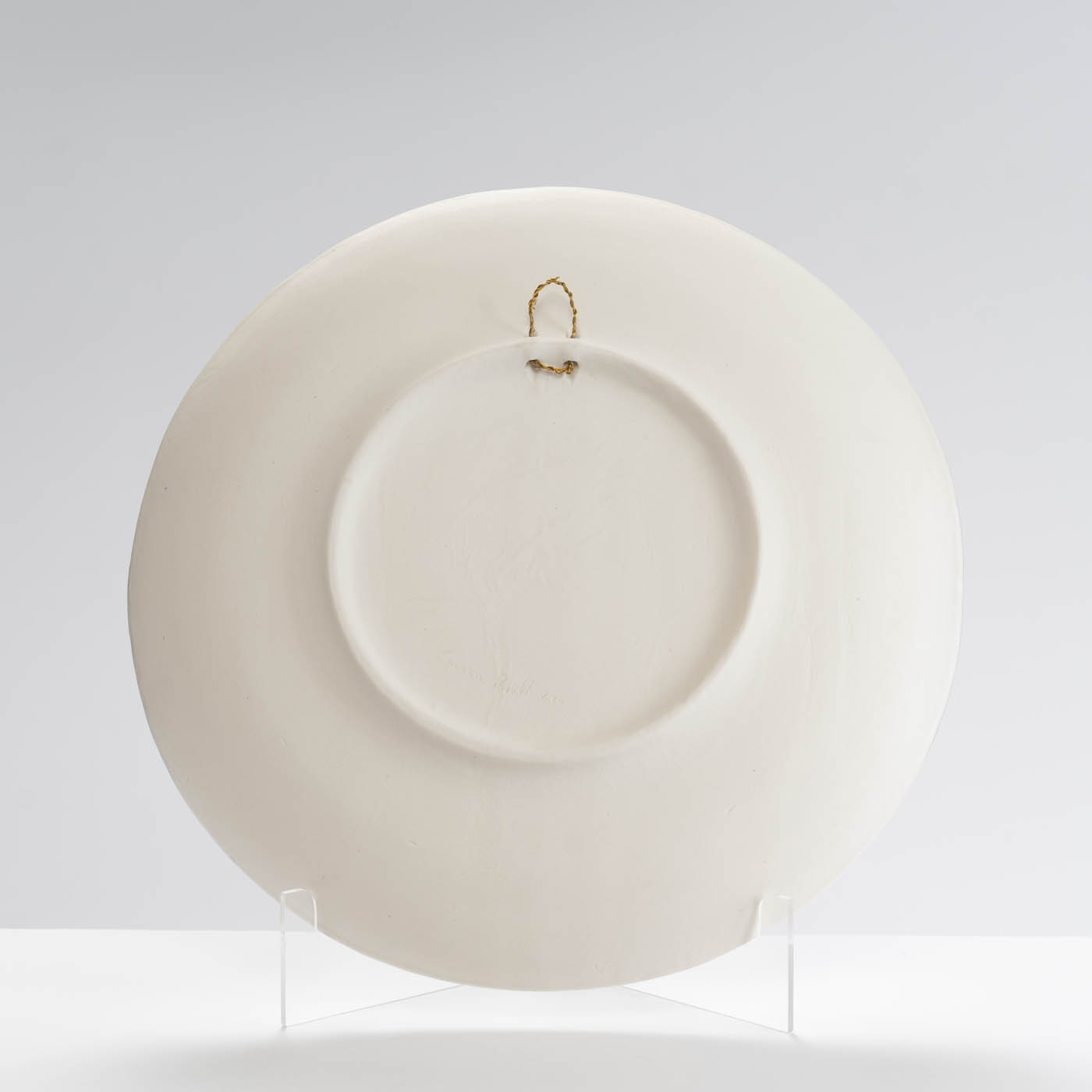 This porcelain plate is slip cast, wtih fine details carved into the surface with precision. The piece is painted and washed with oxides and ceramic stains to highlight the incised lines and the textured relief. It is fitted with a wire ready for displaying on a wall.