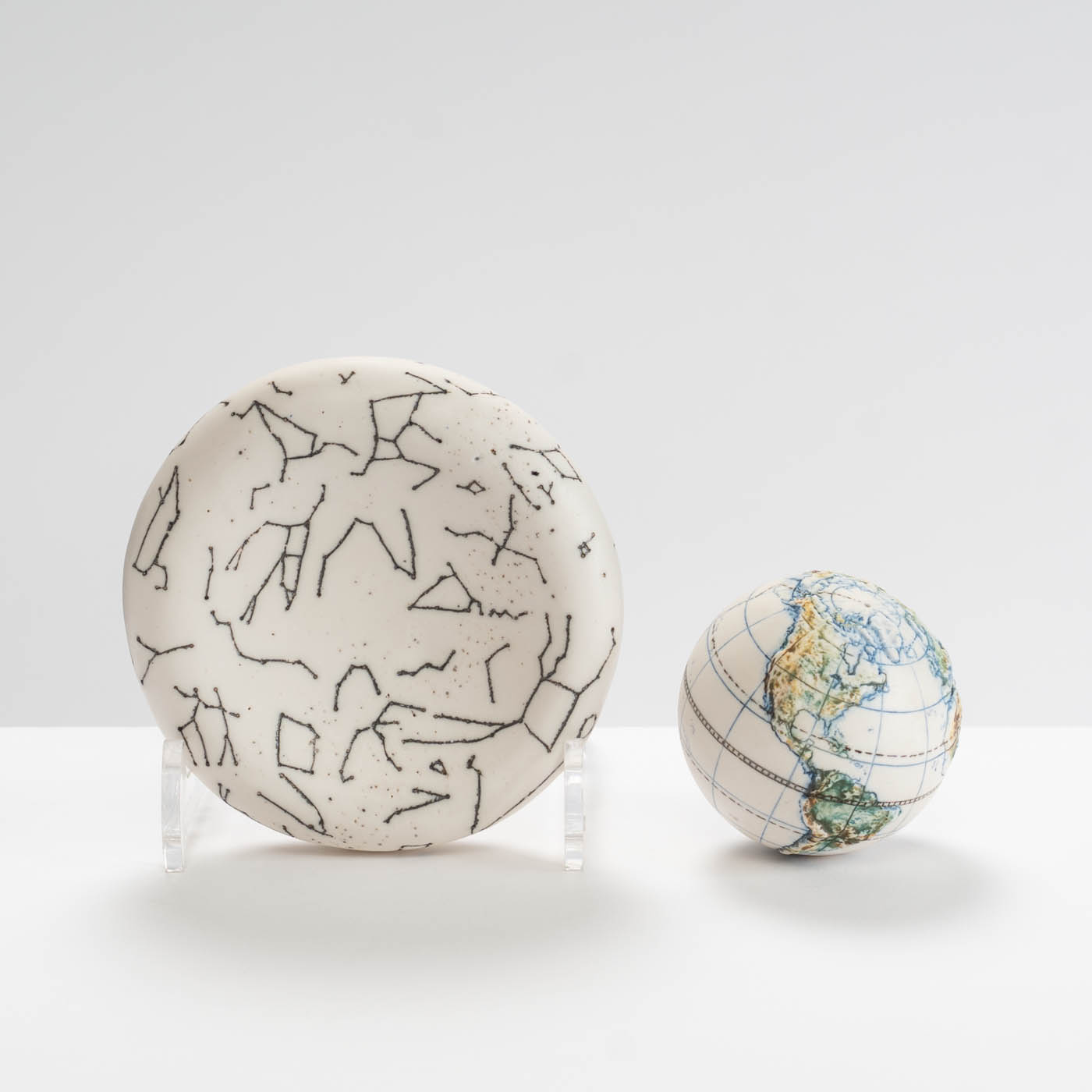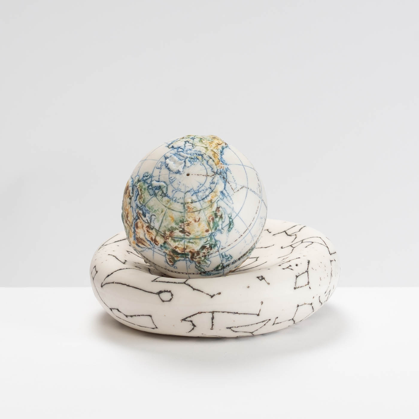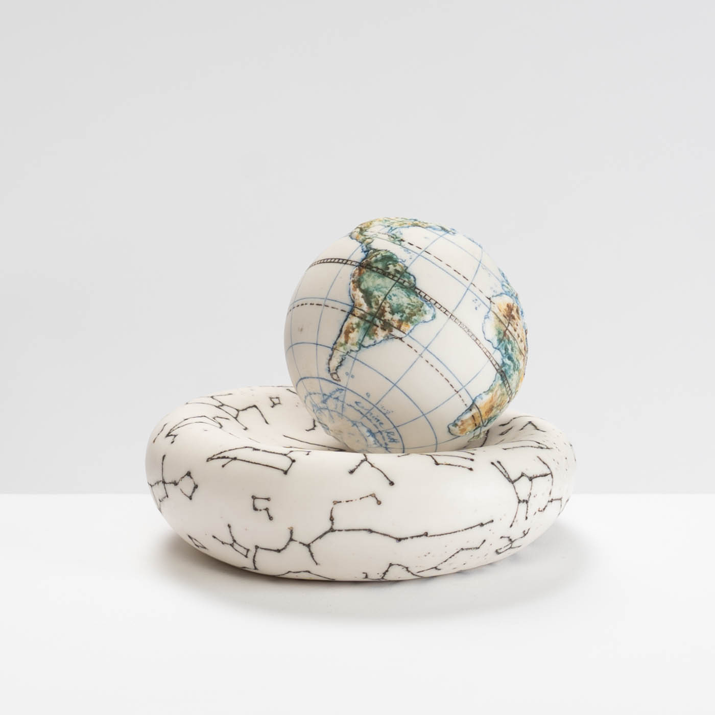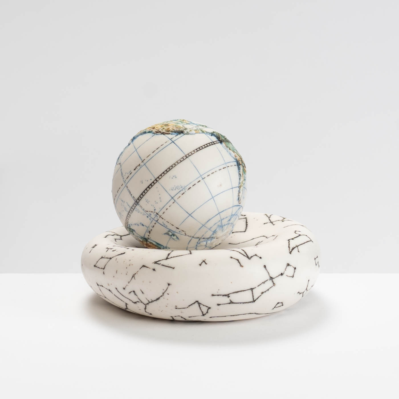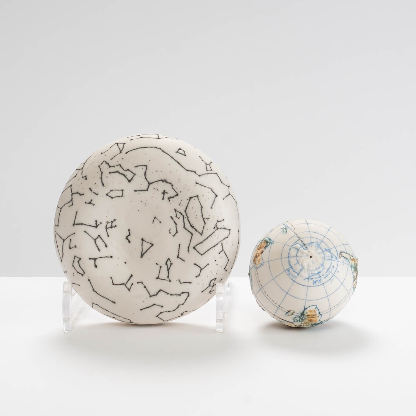 Loraine's background as a map maker informs her ceramics practice. Clay provides a tangible connection to the earth’s surface, through which her work explores how maps shape our sense of place and belonging. Relief maps and domestic-scale vessels are decorated with cartographically accurate drawings. By playing with scale and volume—whether through a pocket globe that places the world in the palm of the hand, or topography with amplified relief—her work addresses specific themes, including environmental and social inequality, and monumental journeys.