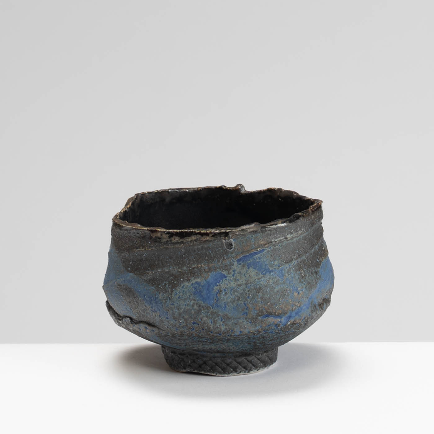This chawan is hand-built in black stoneware clay with a blue glaze brushed decoration.