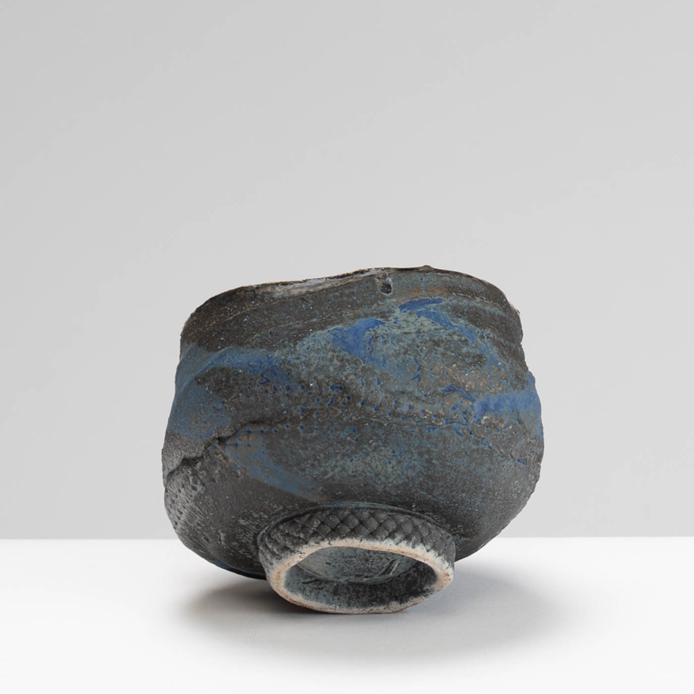 Marcio Mattos became fascinated with clay after seeing an exhibition of tea ceremony bowls at the V&A museum many years ago. He went on to train at Richmond College and later for a degree at Goldsmiths College. He presently creates one-off sculptural vessels and plaques in black stoneware and porcelain paper clay with dry-glazed textural surfaces and brushed decoration.