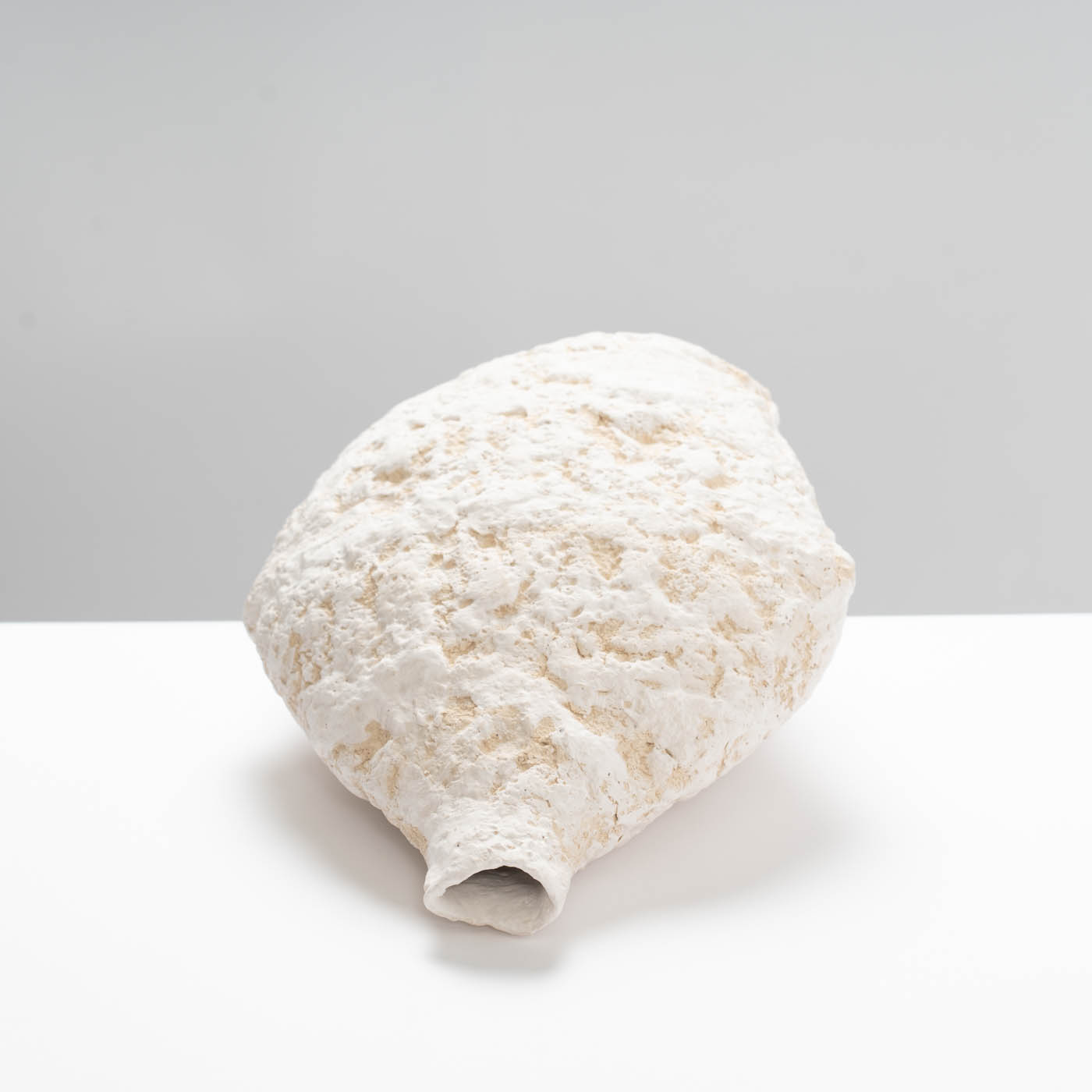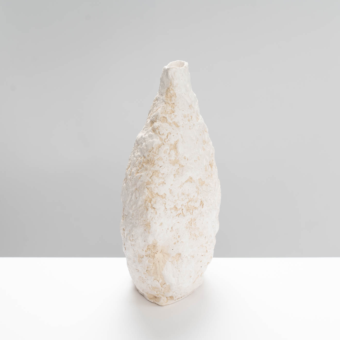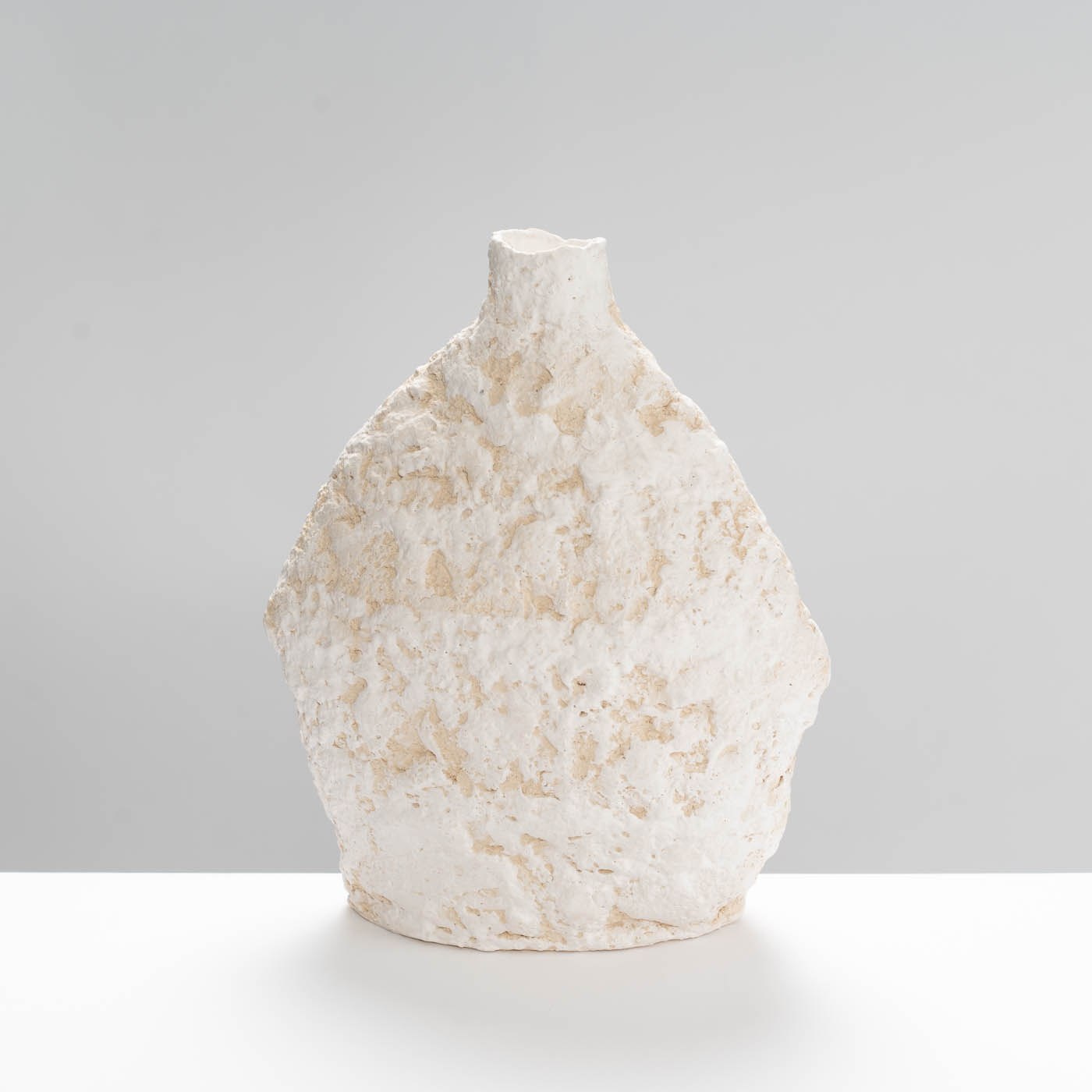 This vase form is hand-built in a pale, grogged clay. Its textured surface is highlighted in matt white.