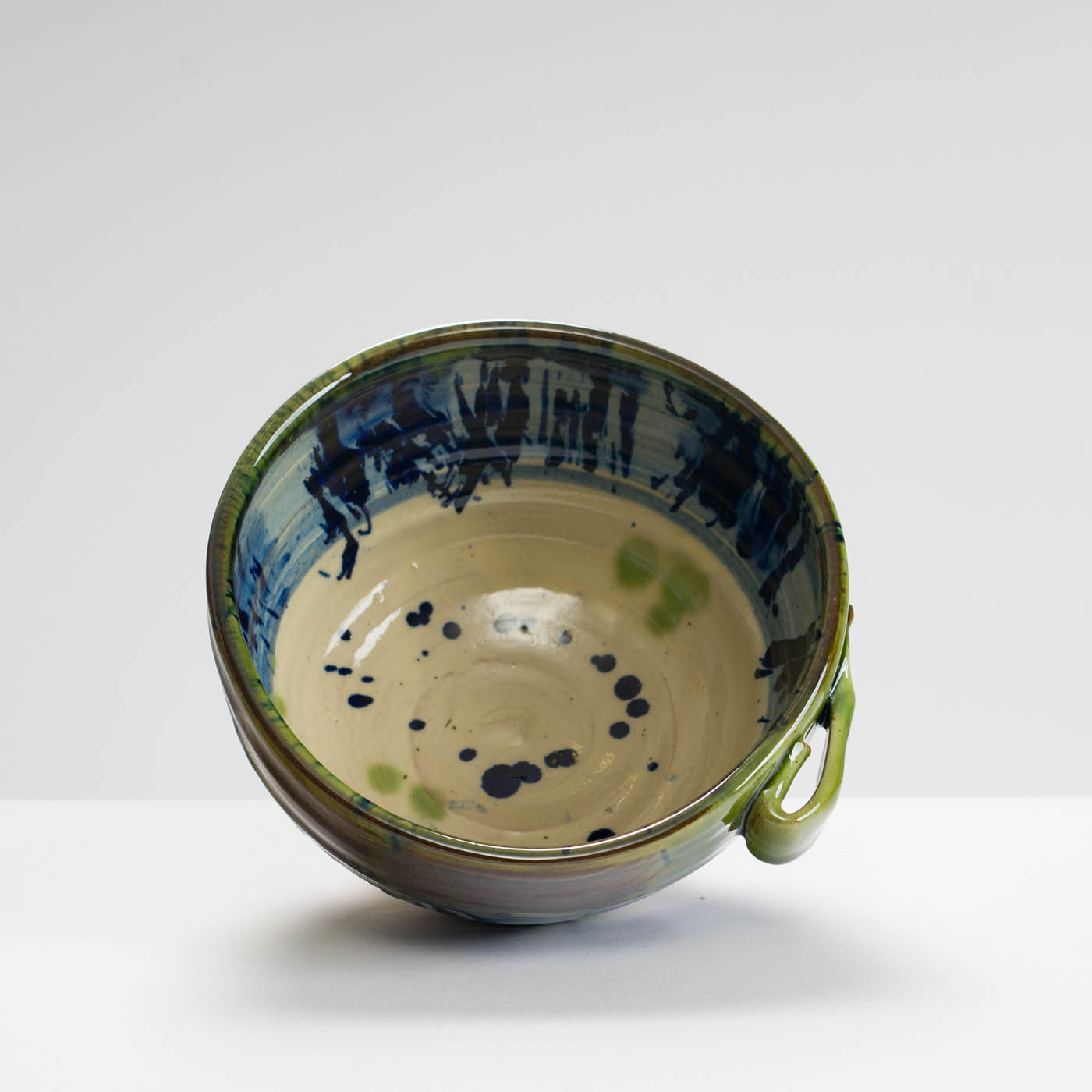 This earthenware bowl is wheel-thrown with bold slip decoration applied freely by brush, then glazed and wood-fired. Nigel favours a palette of blues, greens and earthy tones to complement a strong sense of function.