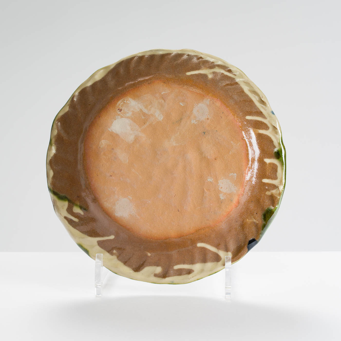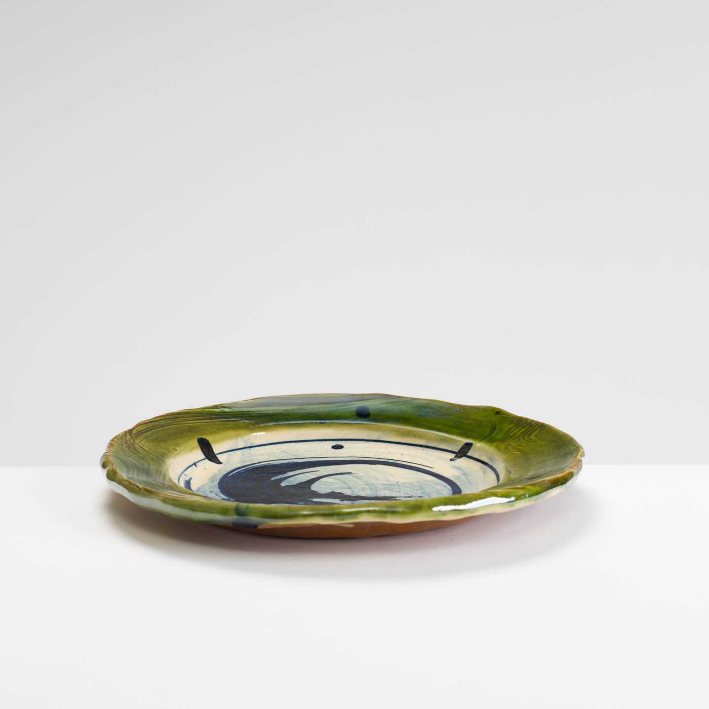 This earthenware plate is hand-built with bold slip decoration applied freely by brush, then glazed and wood-fired. Nigel favours a palette of blues, greens and earthy tones to complement a strong sense of function.