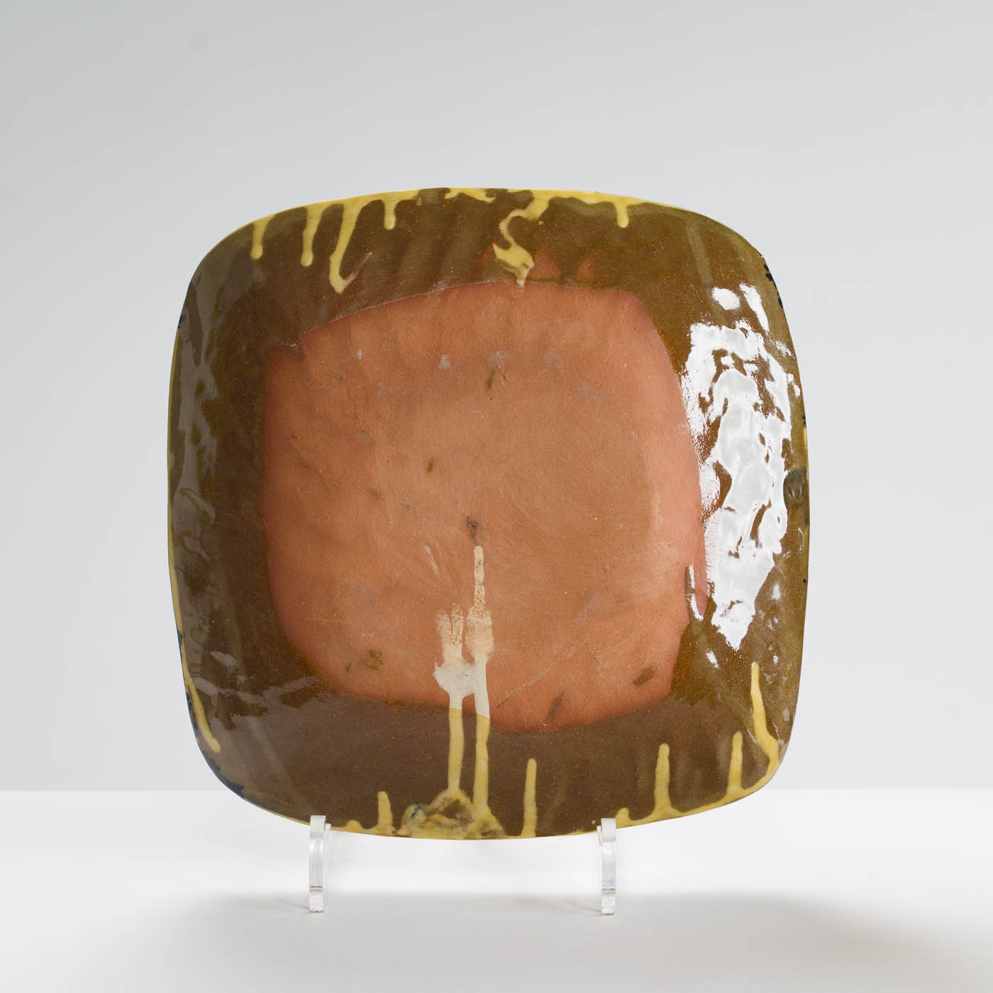 This earthenware plate is hand-built with bold slip decoration applied freely by brush, then glazed and wood-fired. Nigel favours a palette of blues, greens and earthy tones to complement a strong sense of function.
