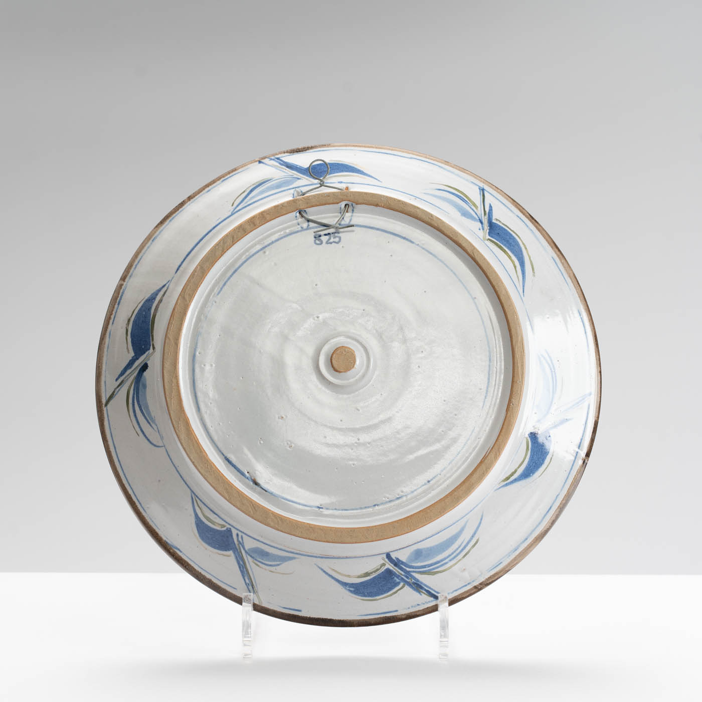 This stoneware plate is wheel-thrown and decorated with a bold enamel brush-work design.