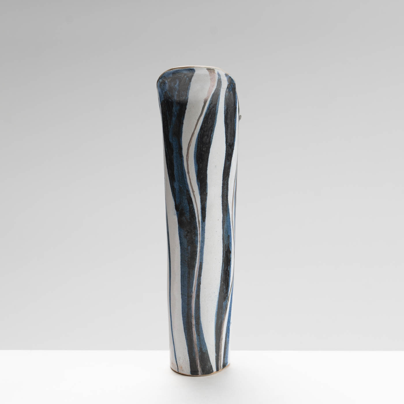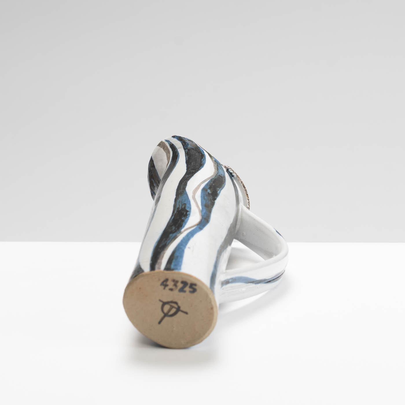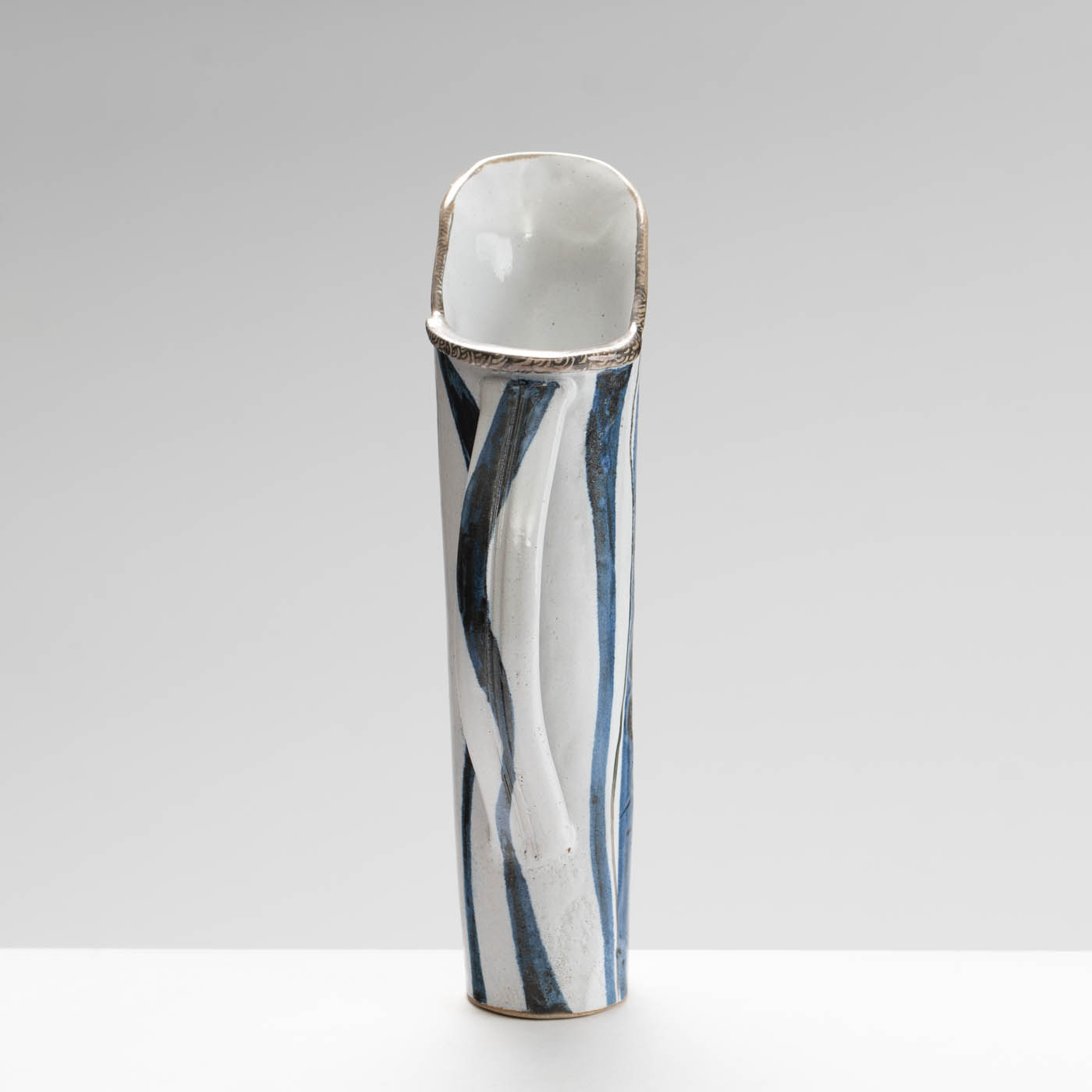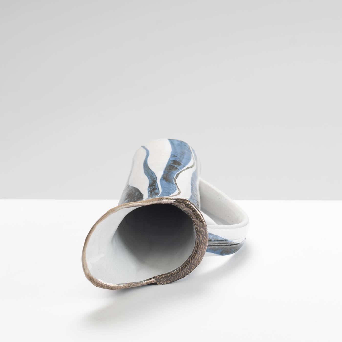 This stoneware jug is hand-built. It is decorated with a bold enamel brushwork design.