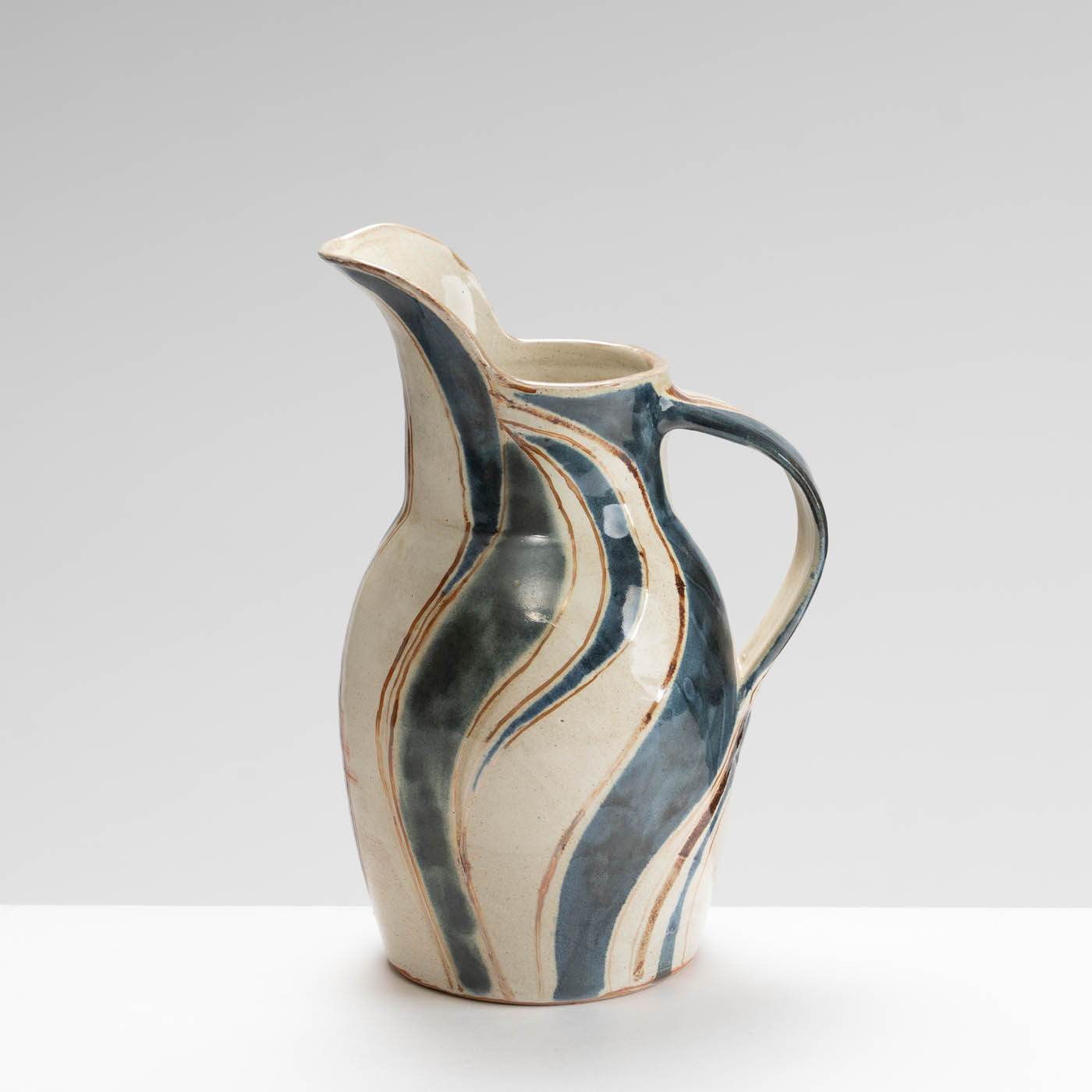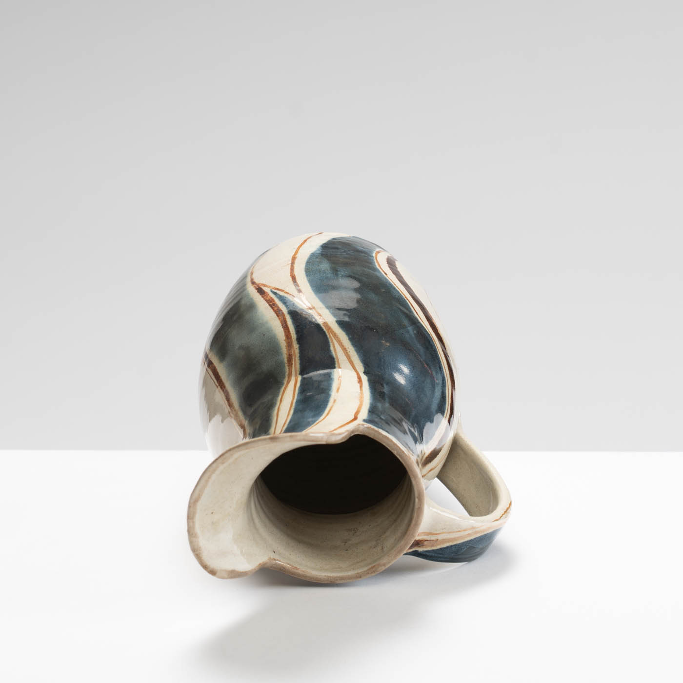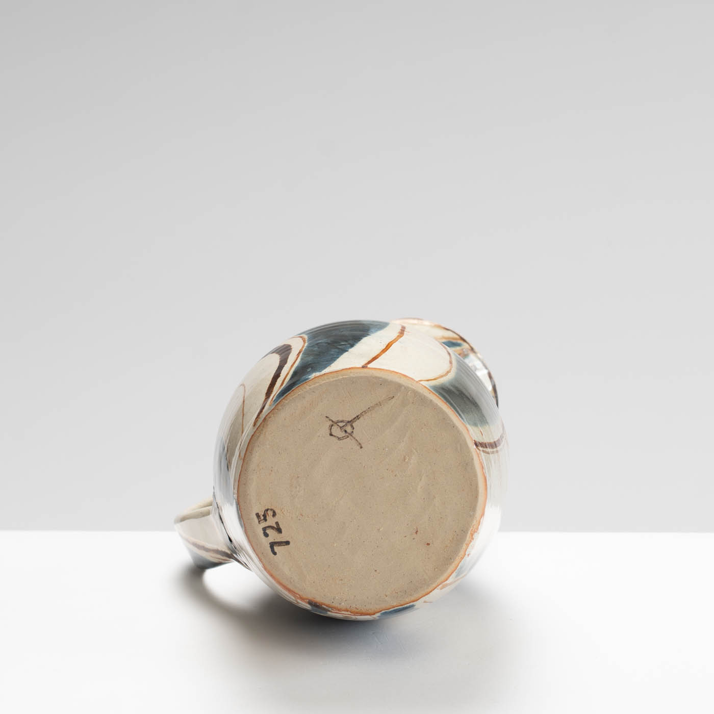 This stoneware jug is wheel-thrown. It is decorated with a bold enamel brushwork design.