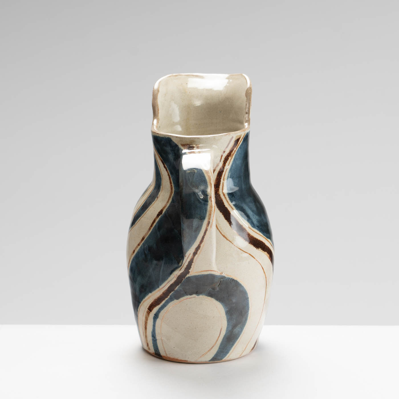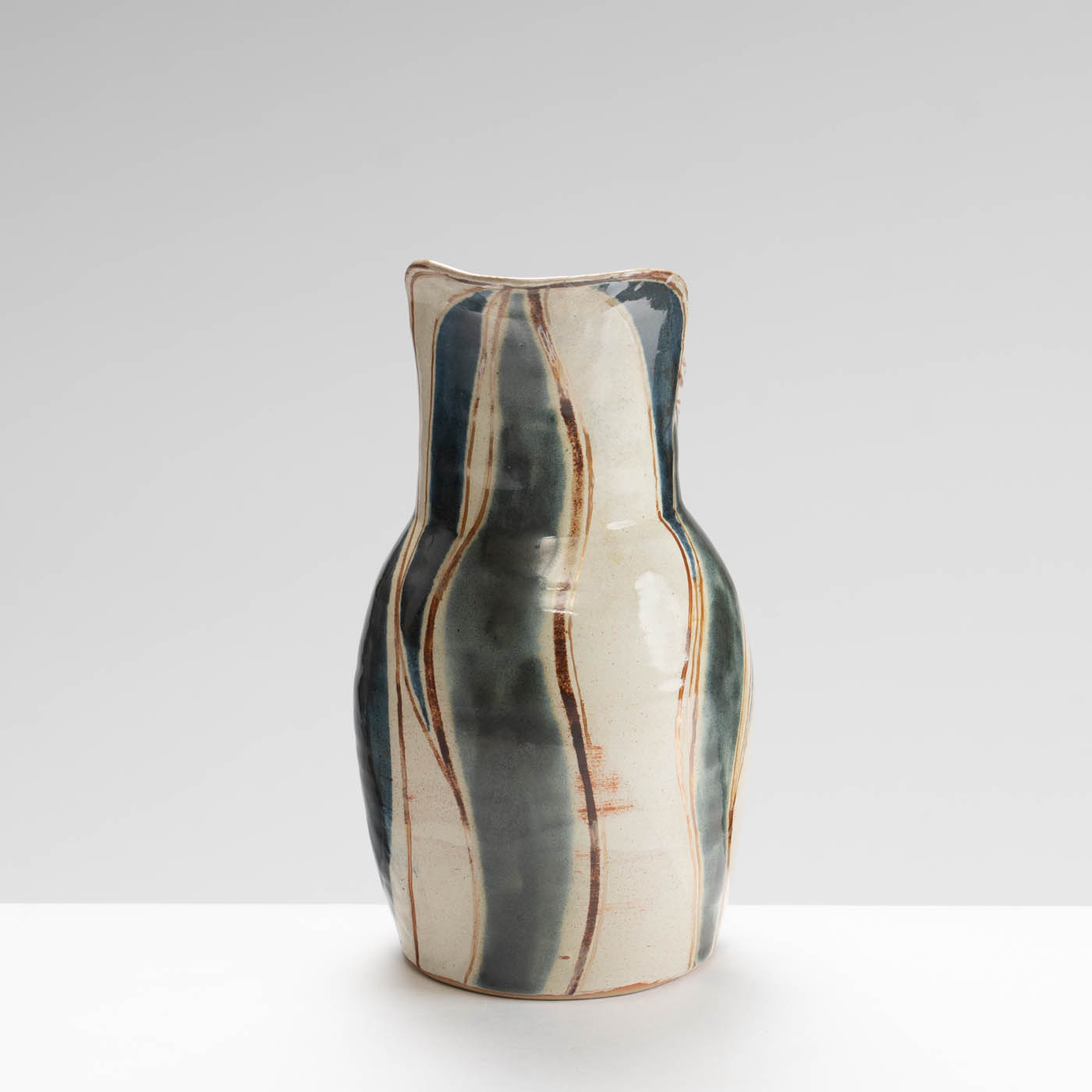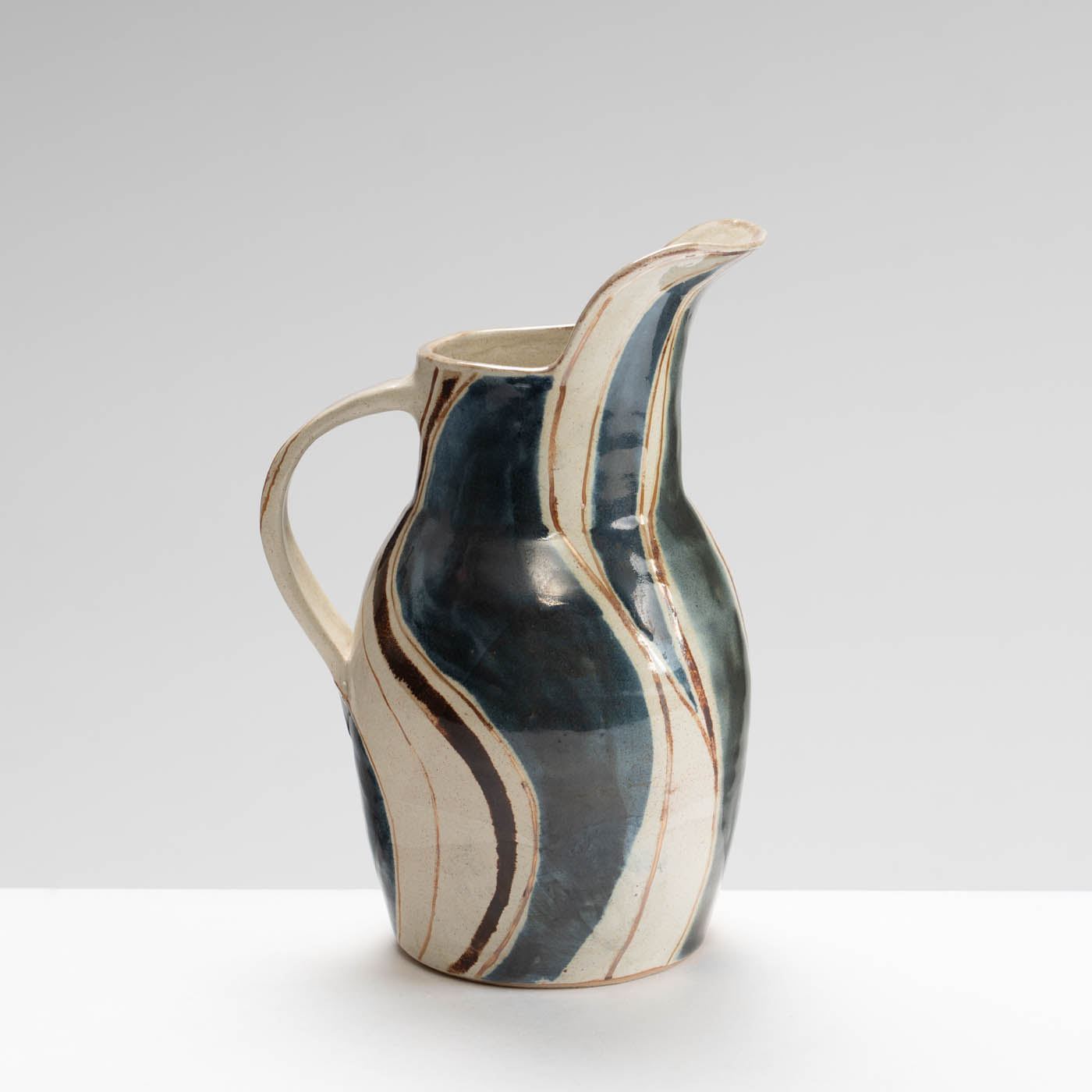 This stoneware jug is wheel-thrown. It is decorated with a bold enamel brushwork design.