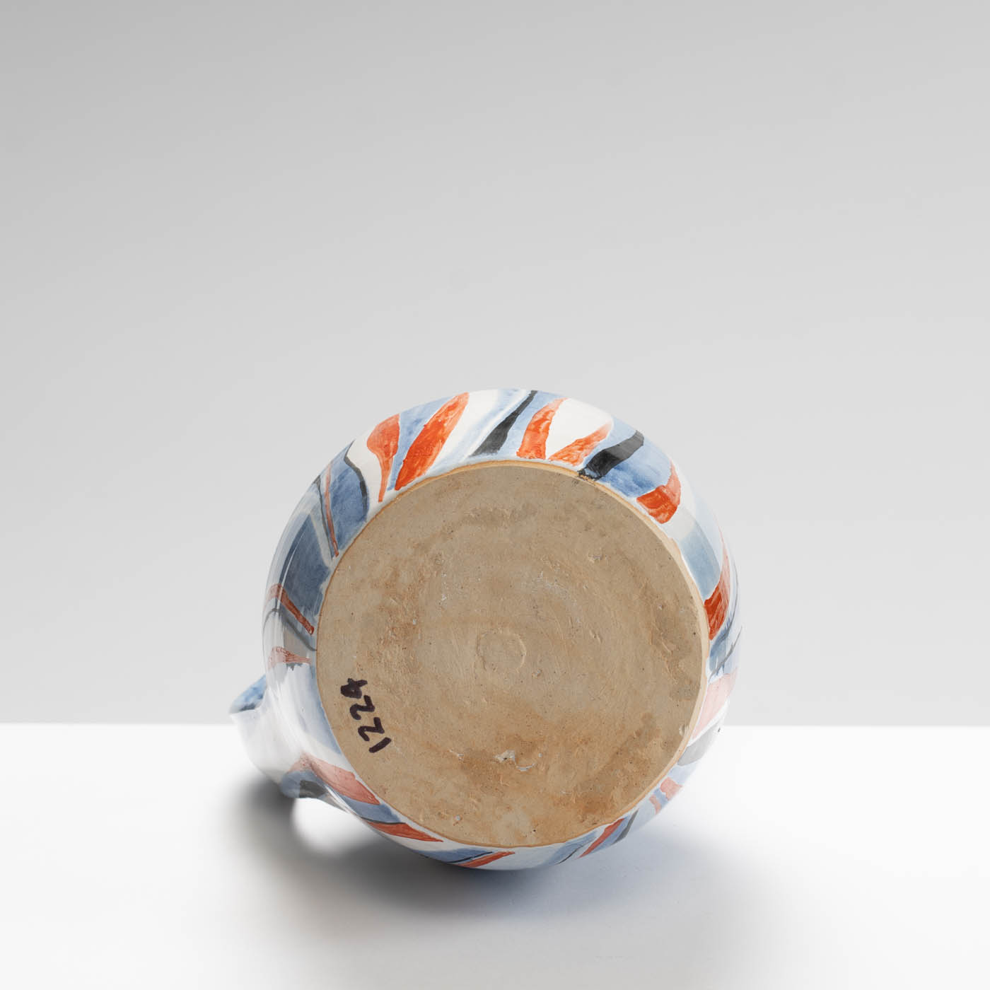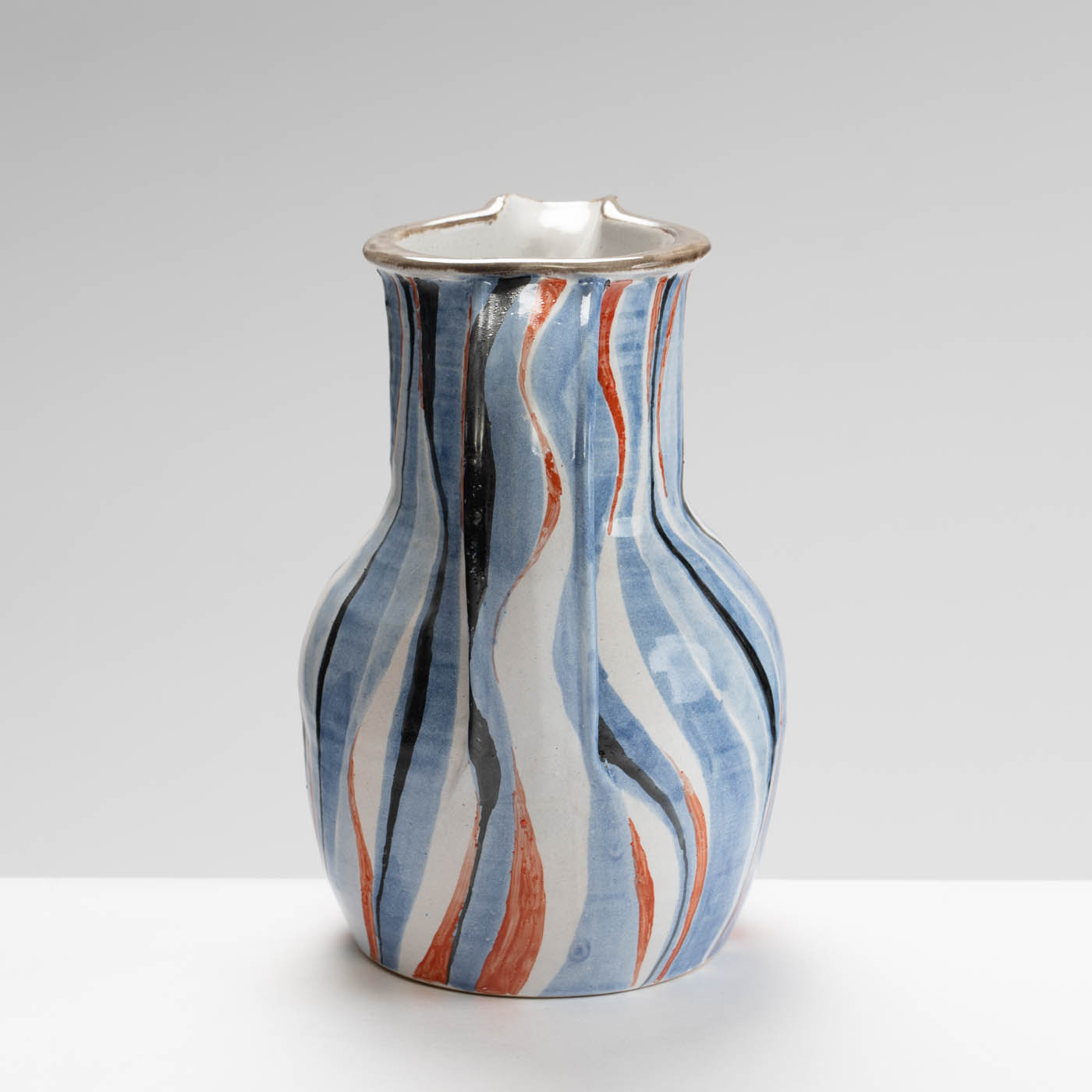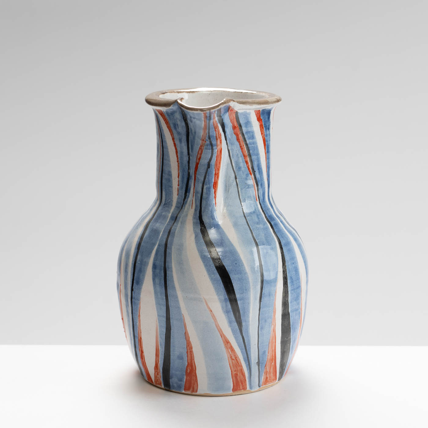 This stoneware jug is wheel-thrown. It is decorated with a bold enamel brushwork design.
