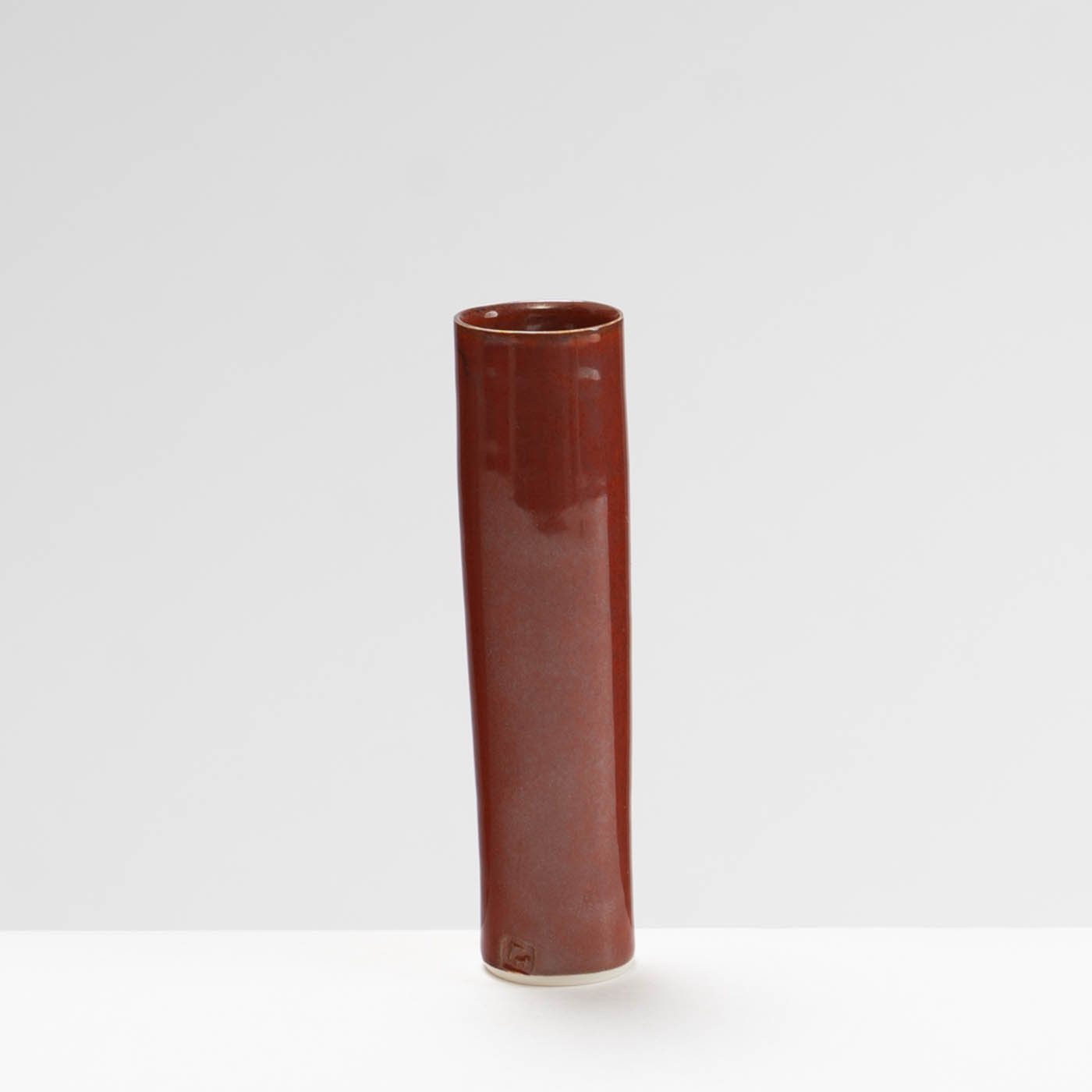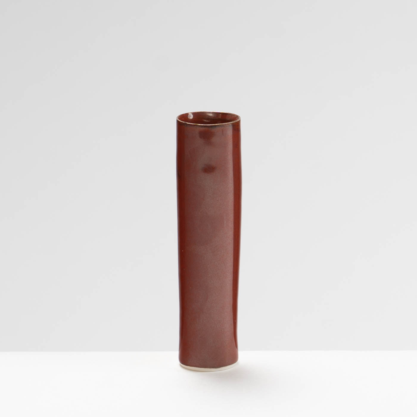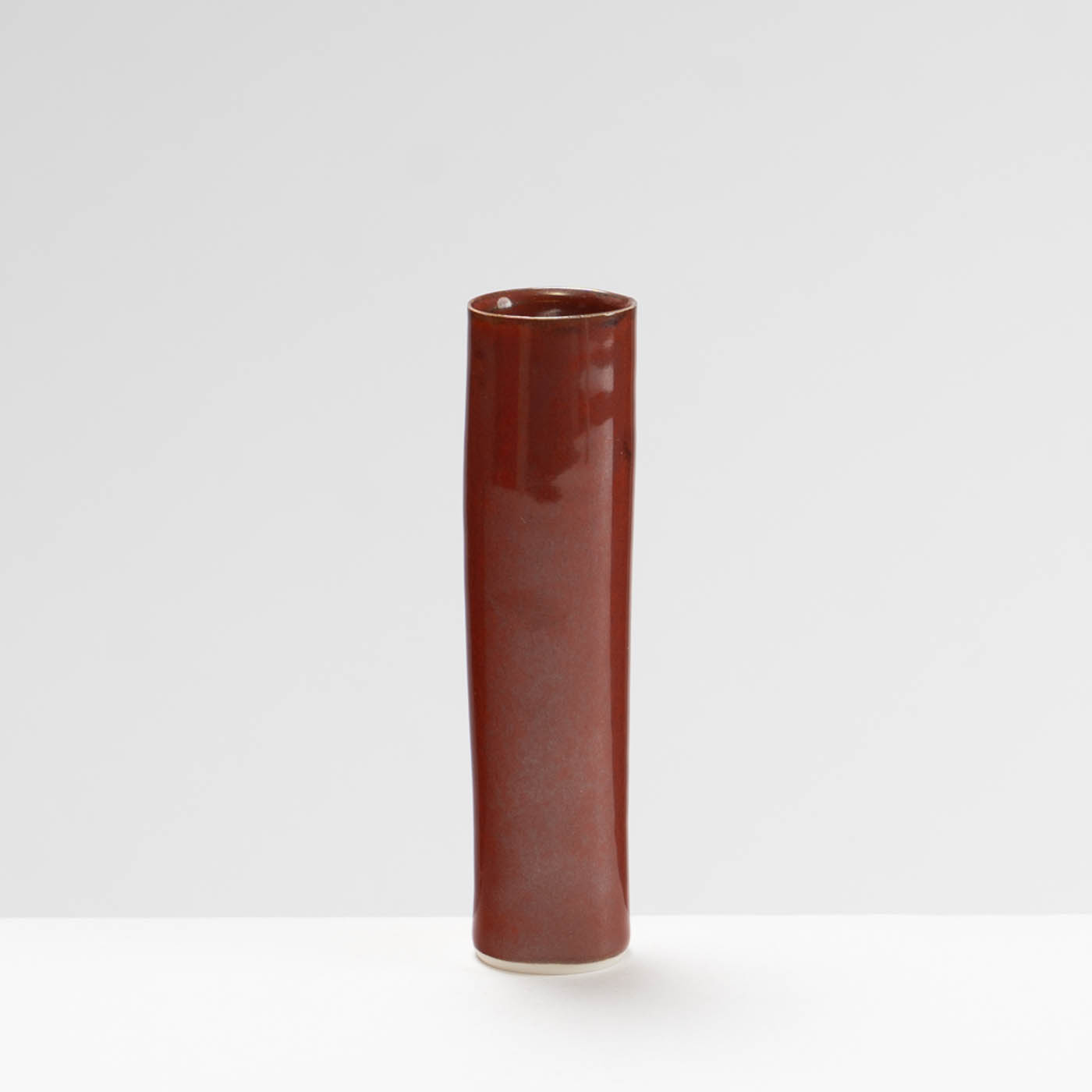 This vase is wheel-thrown in porcelain. Inspired by the classical porcelain of China and Japan, it is decorated with a burnt red glaze.