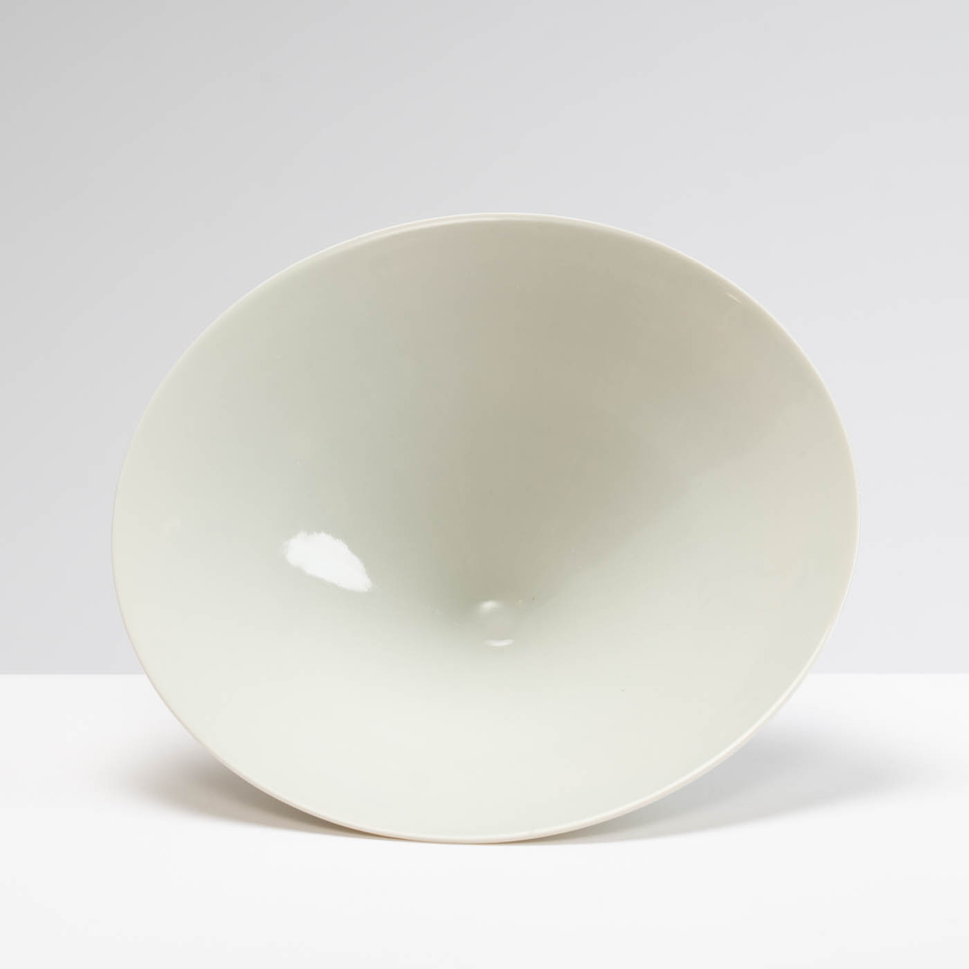 This bowl with a narrow foot is wheel-thrown in porcelain. Inspired by the classical porcelain of China and Japan, it is decorated with a pale celadon glaze.