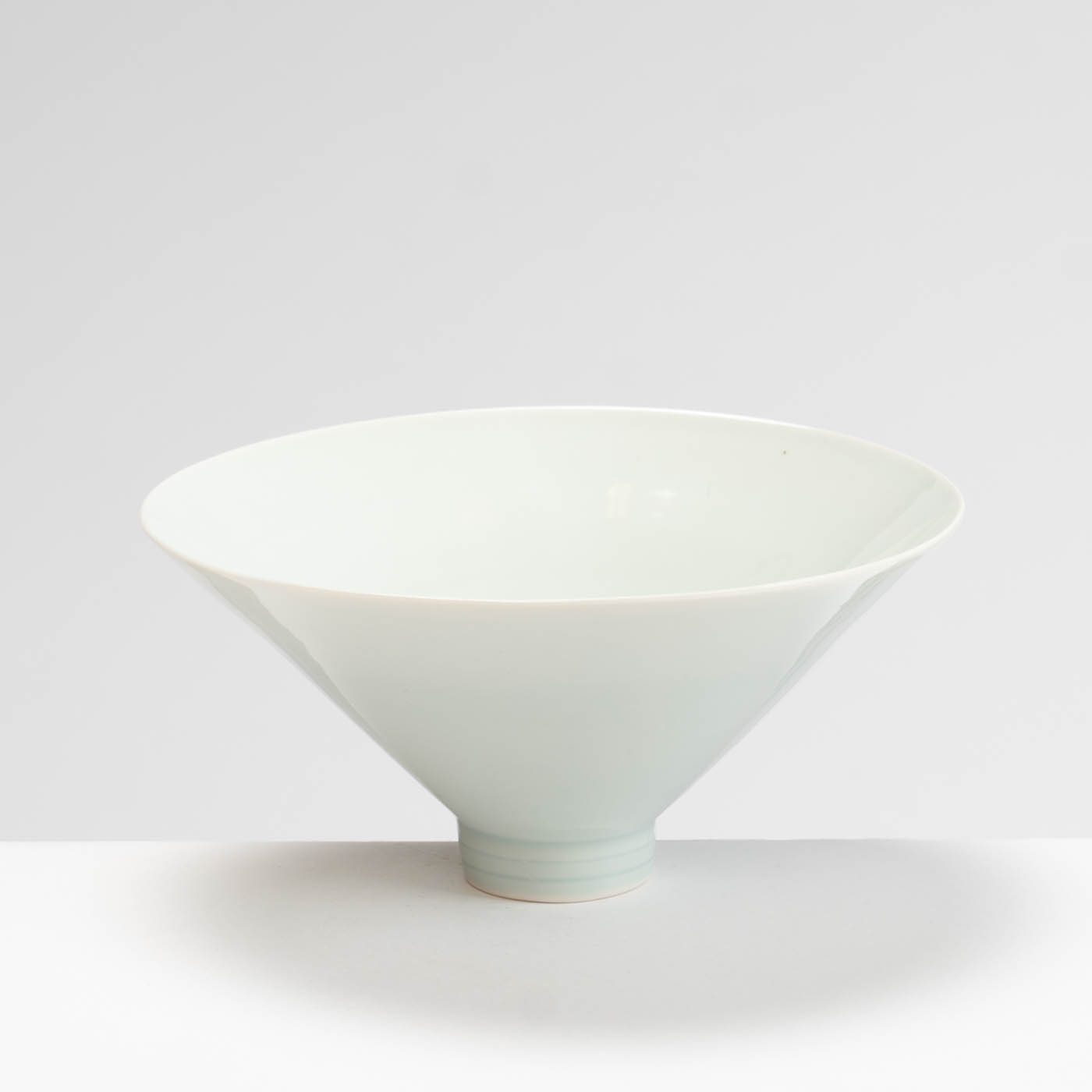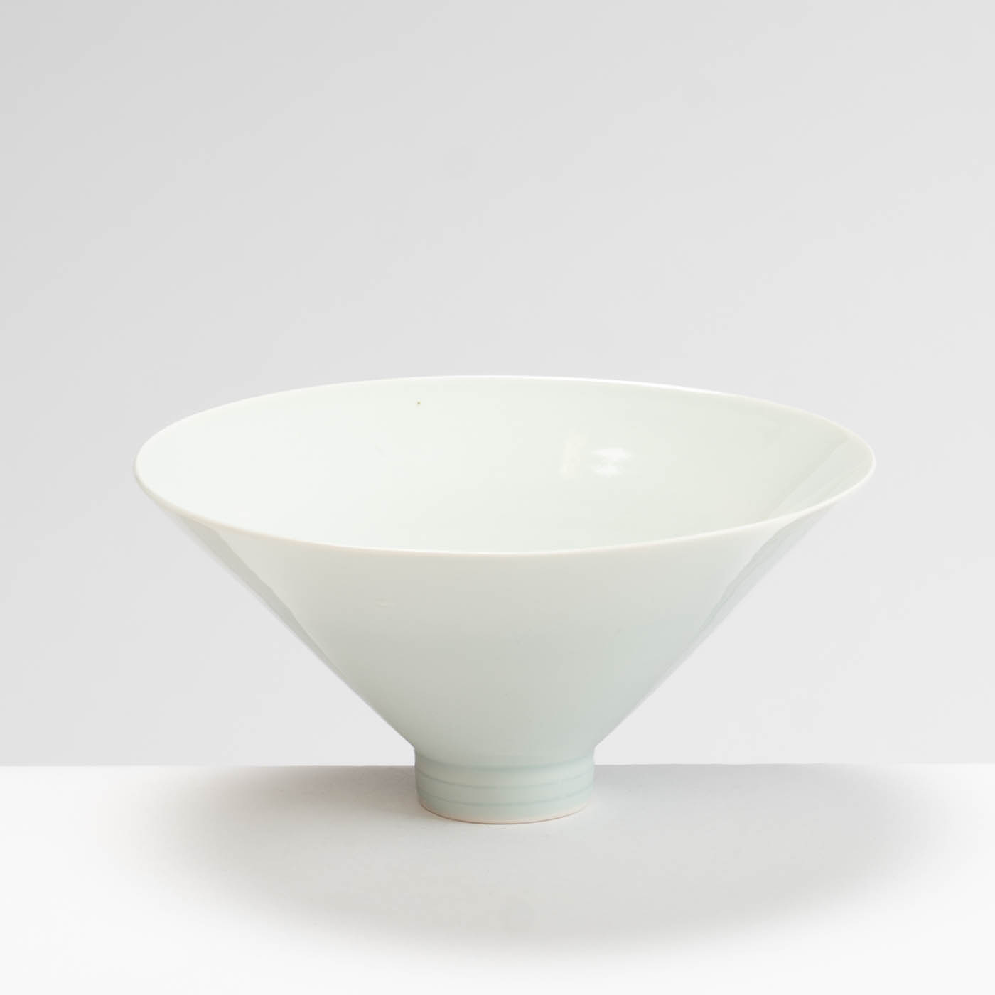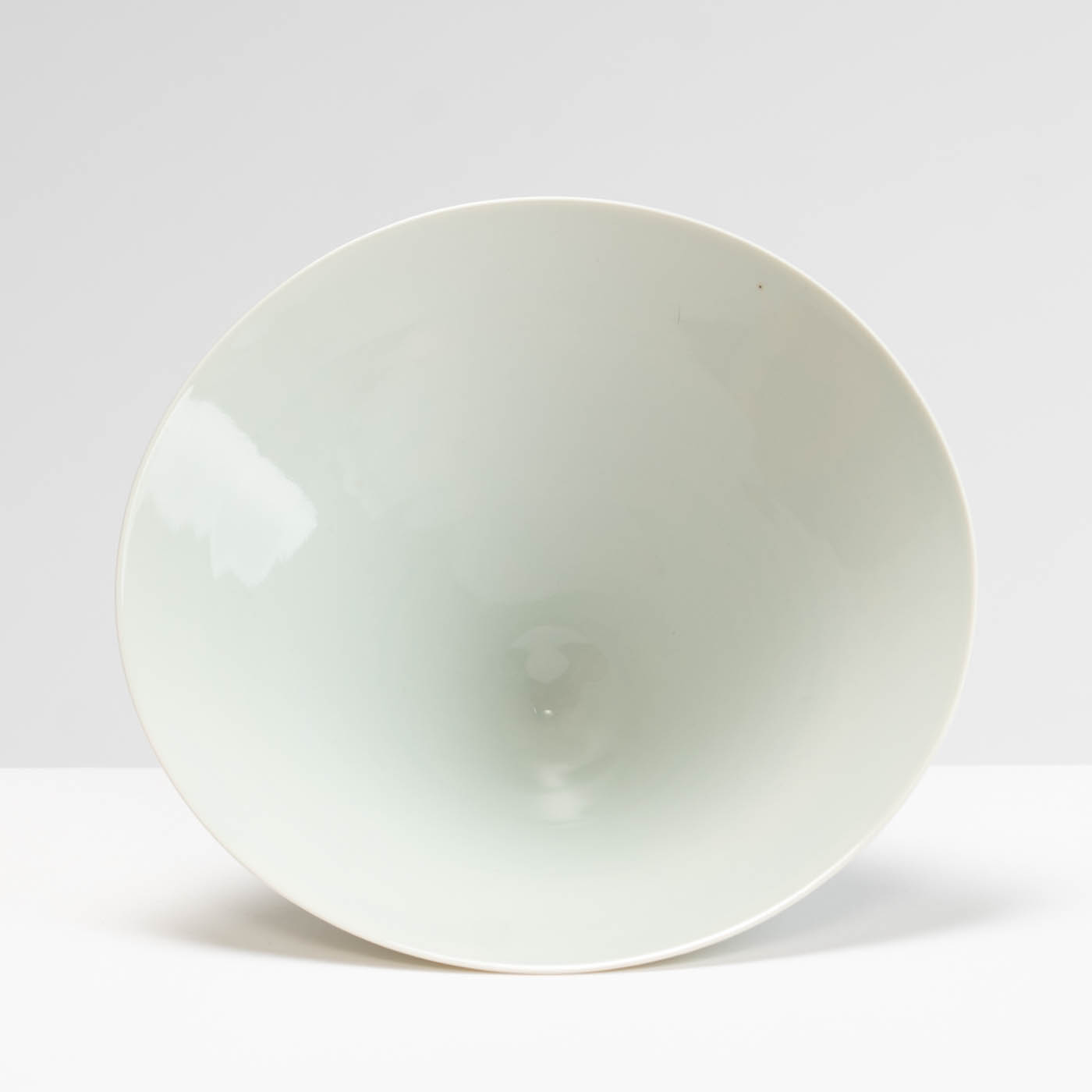 This bowl with a narrow foot is wheel-thrown in porcelain. Inspired by the classical porcelain of China and Japan, it is decorated with a pale celadon glaze.