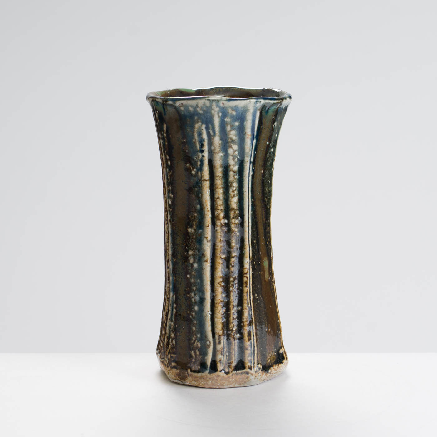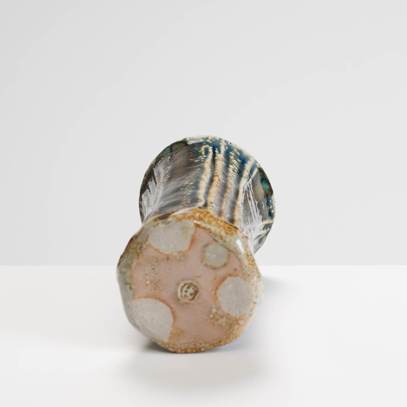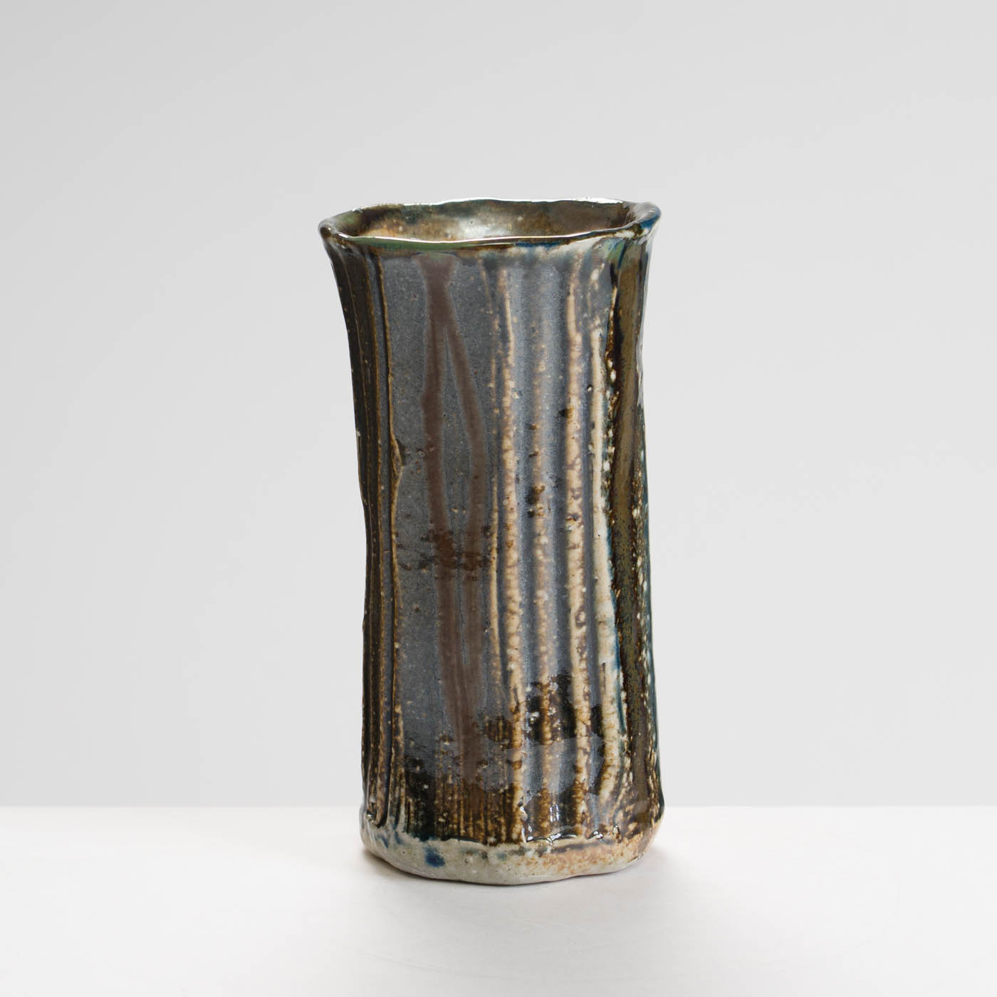 This stoneware beaker is hand-built retaining the soft quality of the clay. Slip is applied and the jar is fired with sodium vapour glazing which adds richness of colour and emphasises the marks and rhythms of making.
