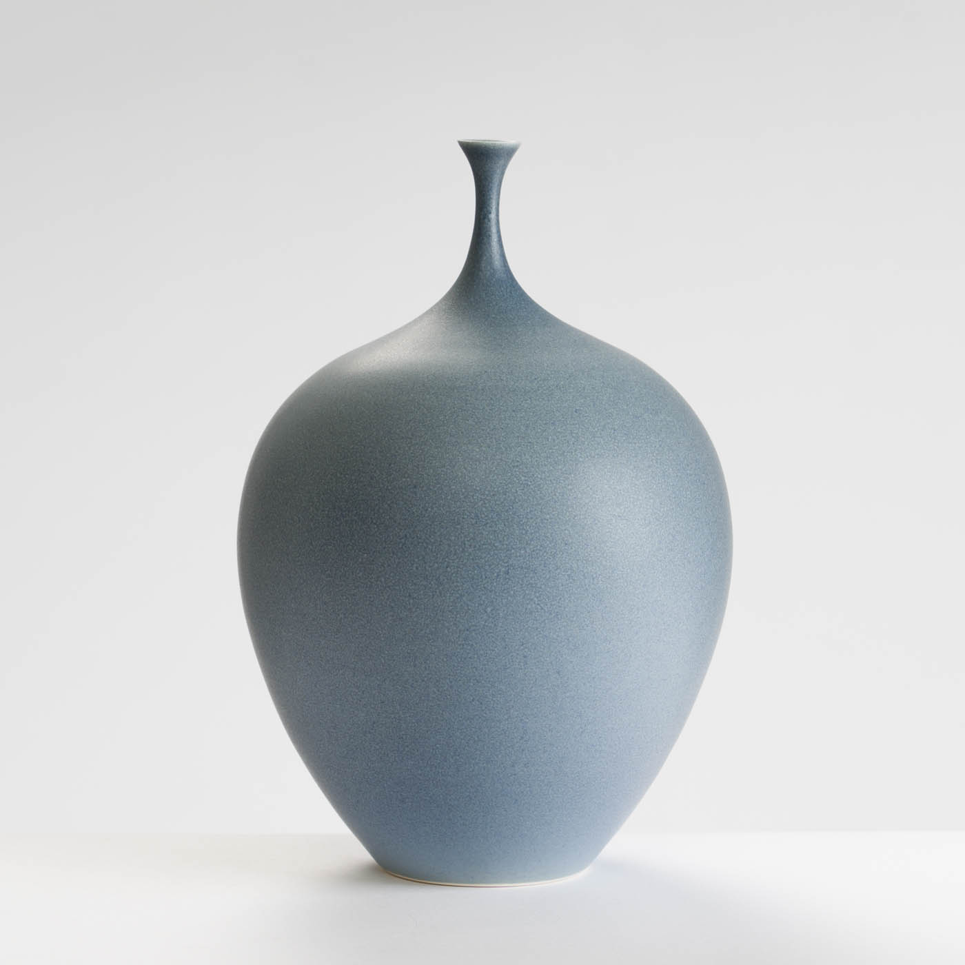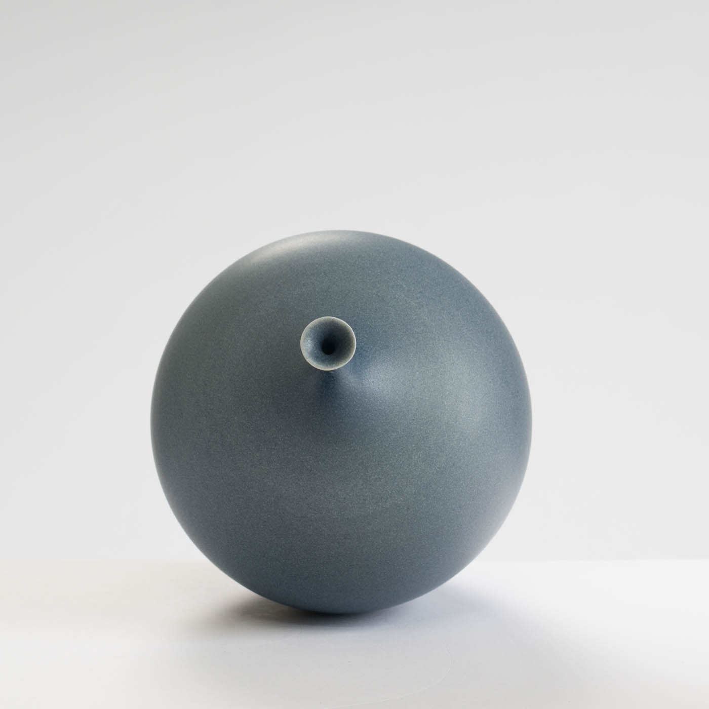 This elegant porcelain acorn form is wheel-thrown with precision and enveloped in an eggshell smoky blue glaze.
