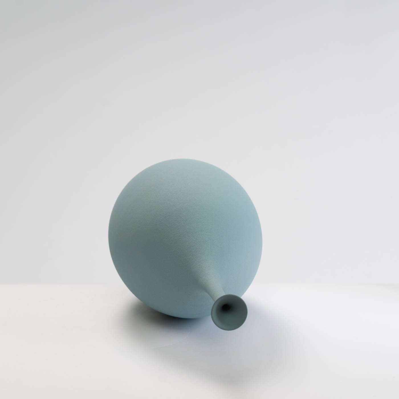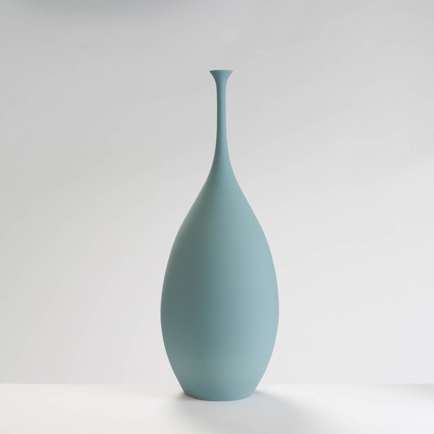 This elegant porcelain teardrop bottle form is wheel-thrown with precision and enveloped in an dry smoky blue glaze.