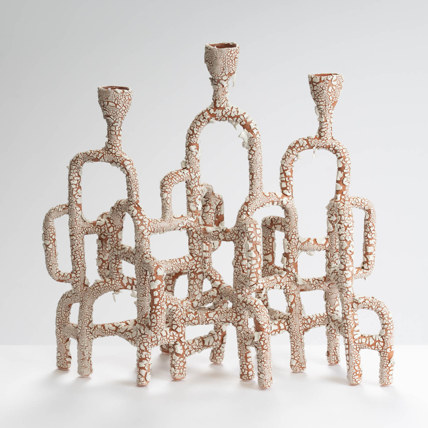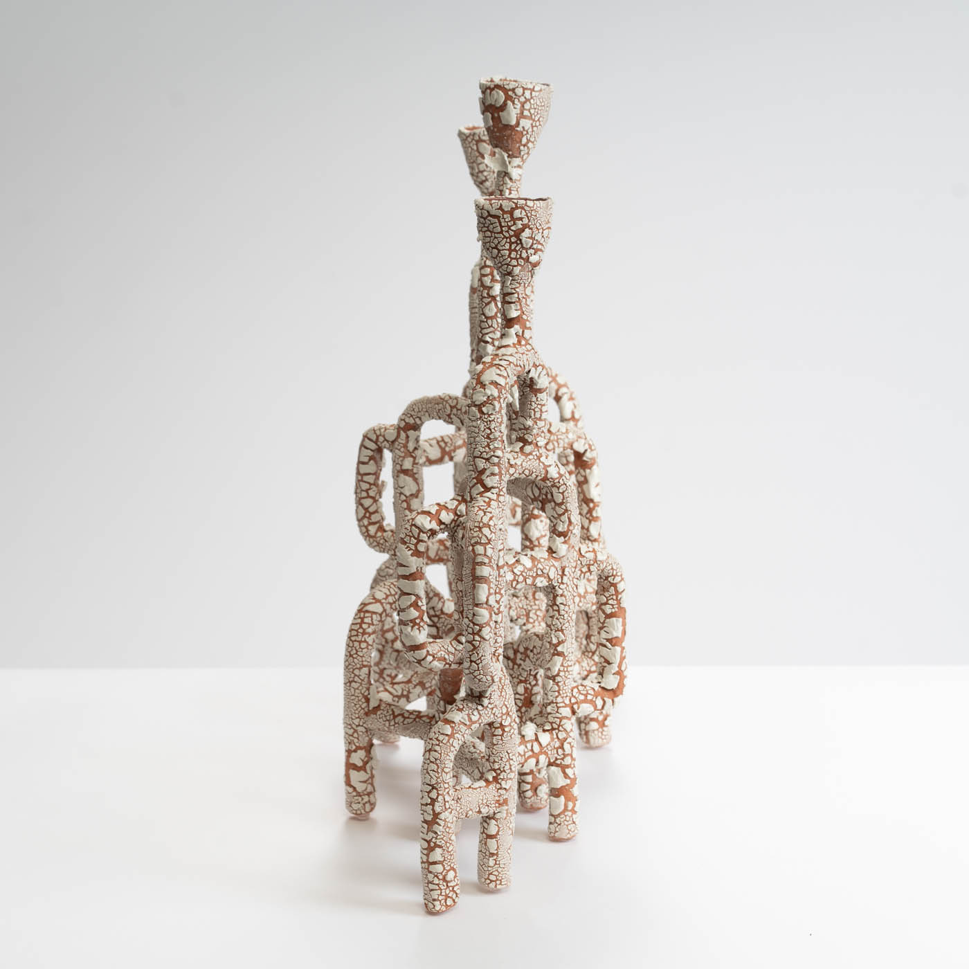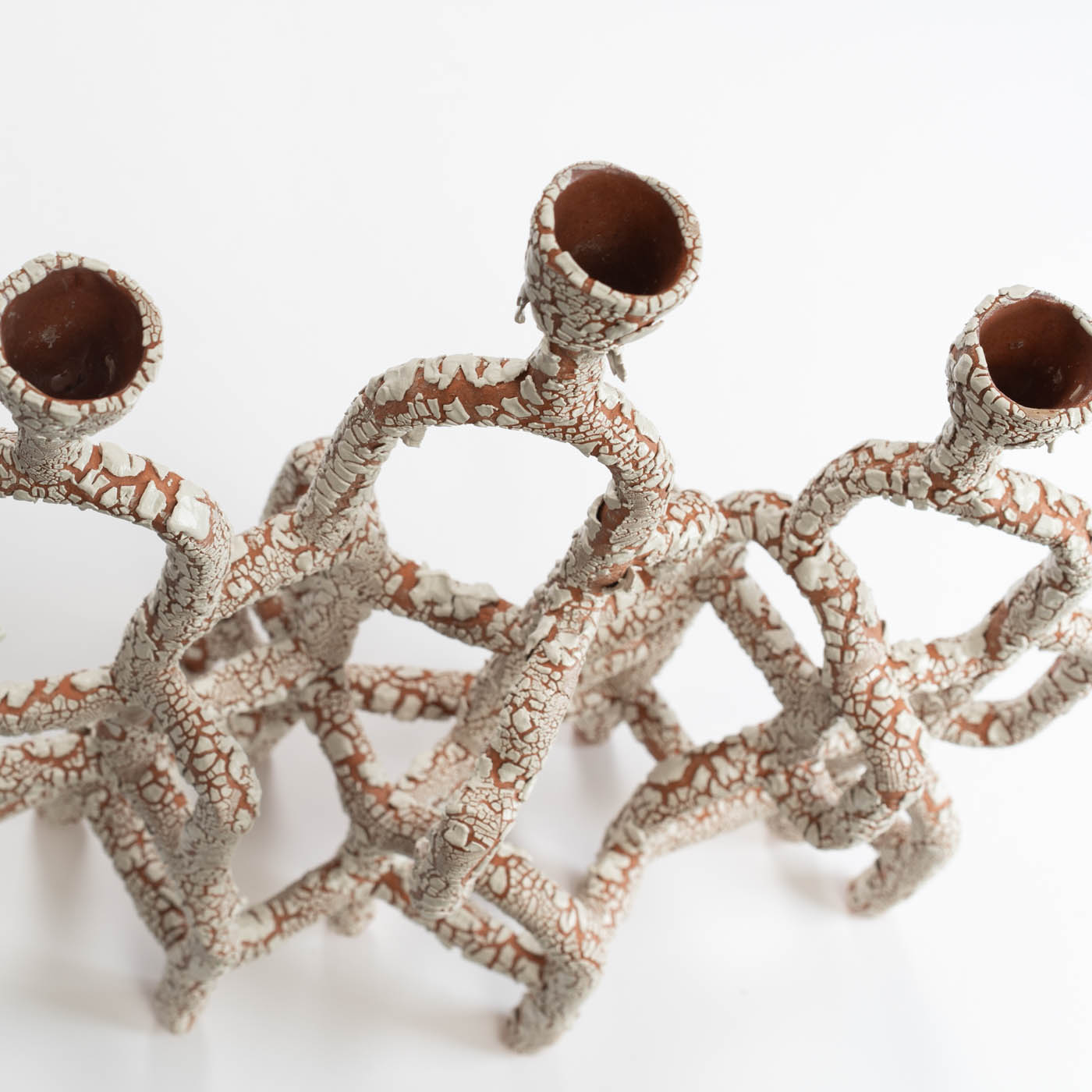 This candelabra is hand-built from tubes of paper terracotta, and finished with a cracked glaze. Its sculptural form suggests intricate networks of the body’s inner structures and organic flow systems found in the natural world such as roots, rivers, and lava.