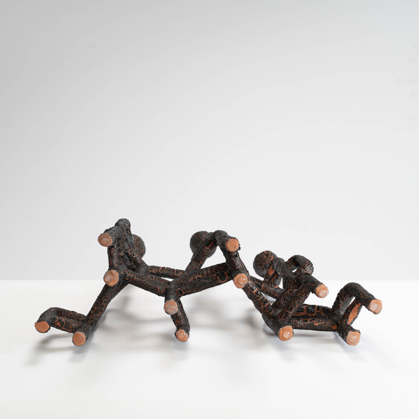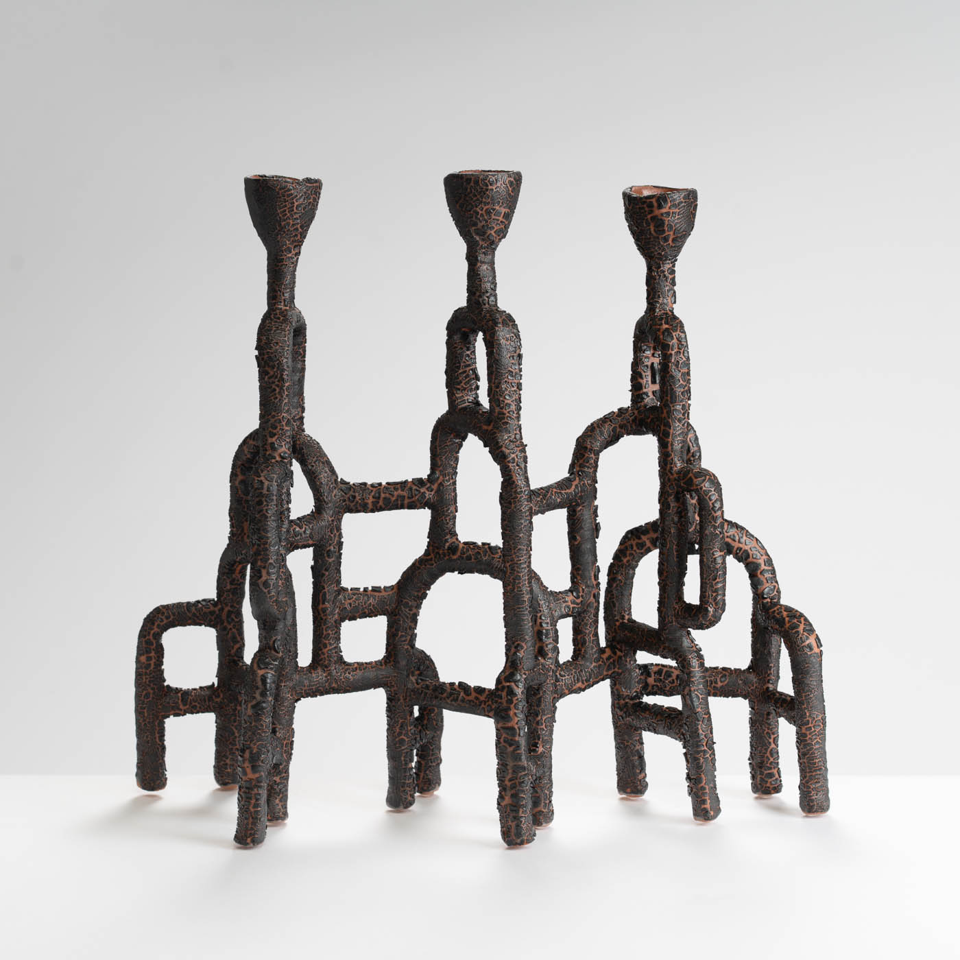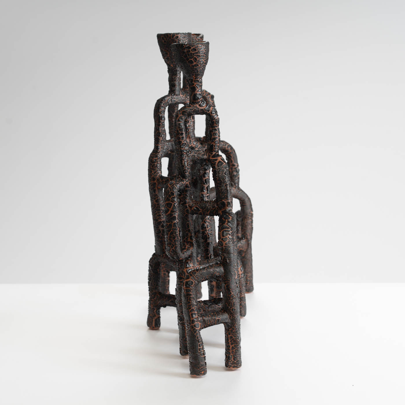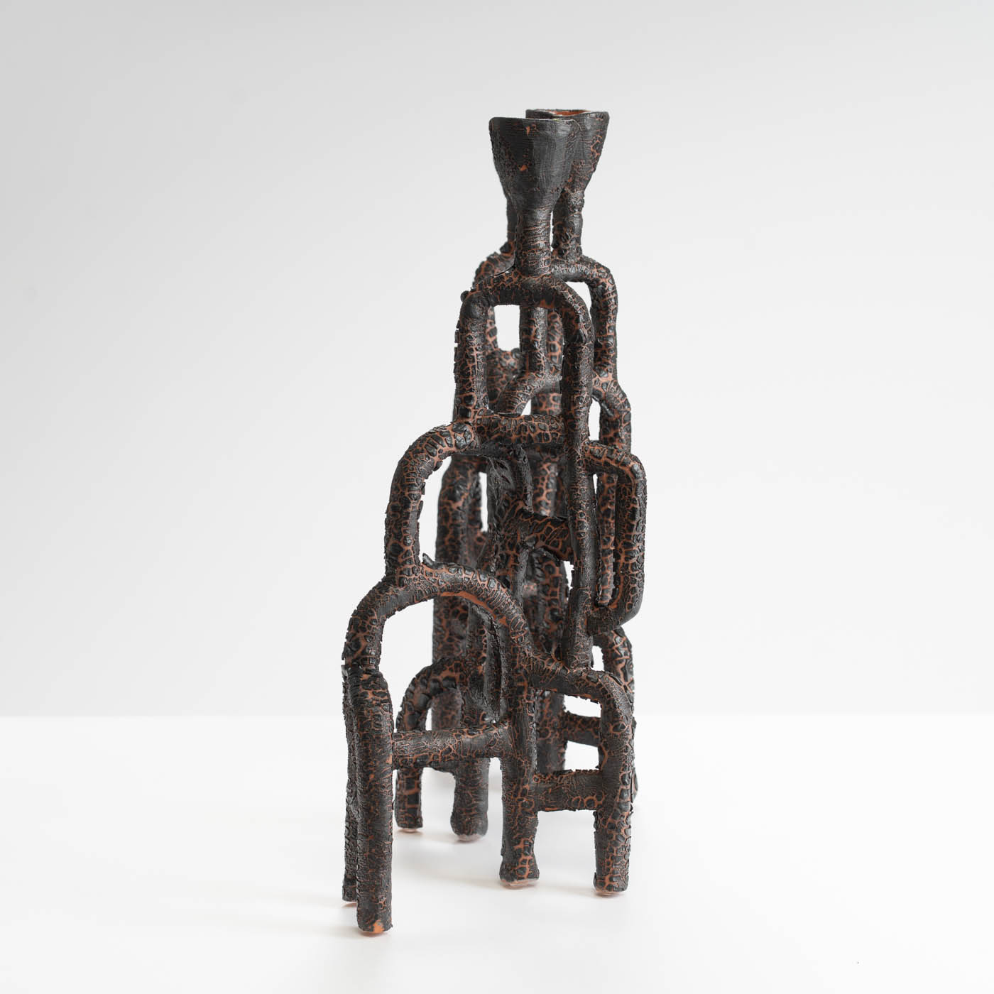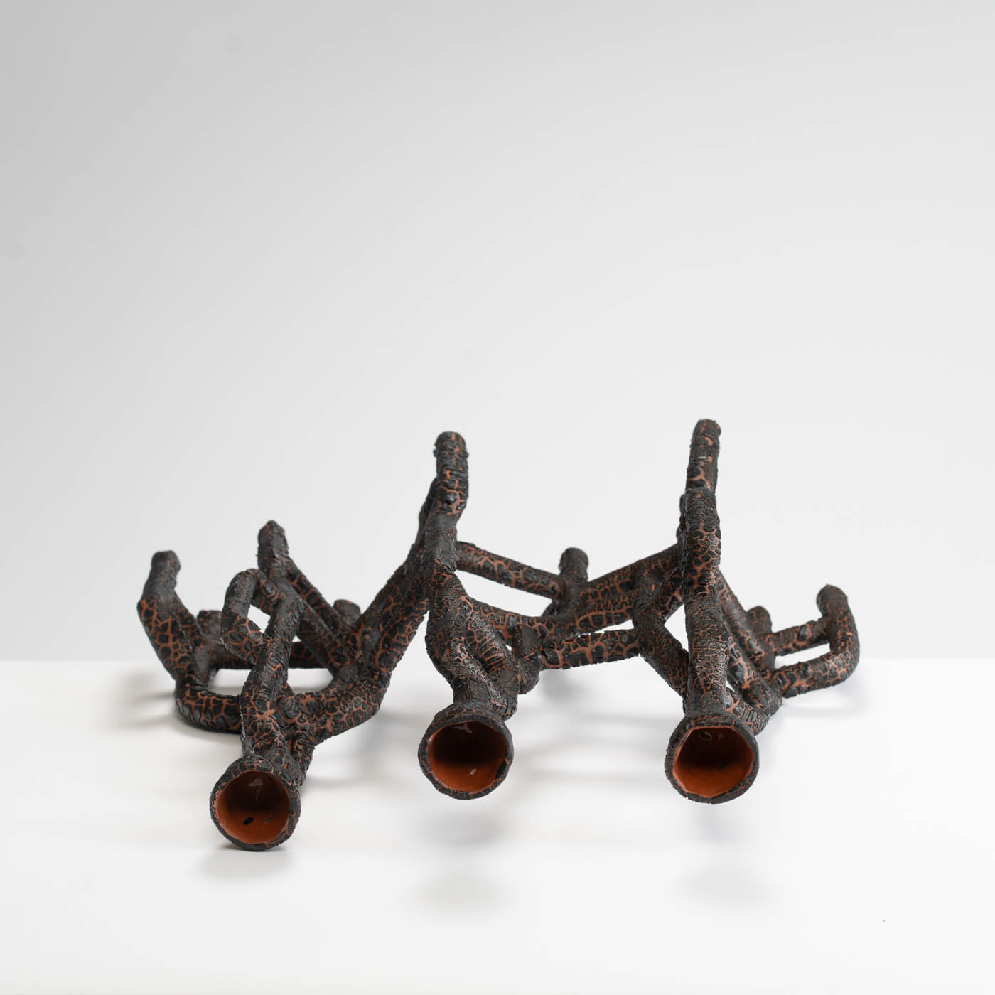 This candelabra is hand-built from tubes of paper terracotta, and finished with a cracked glaze. Its sculptural form suggests intricate networks of the body’s inner structures and organic flow systems found in the natural world such as roots, rivers, and lava.