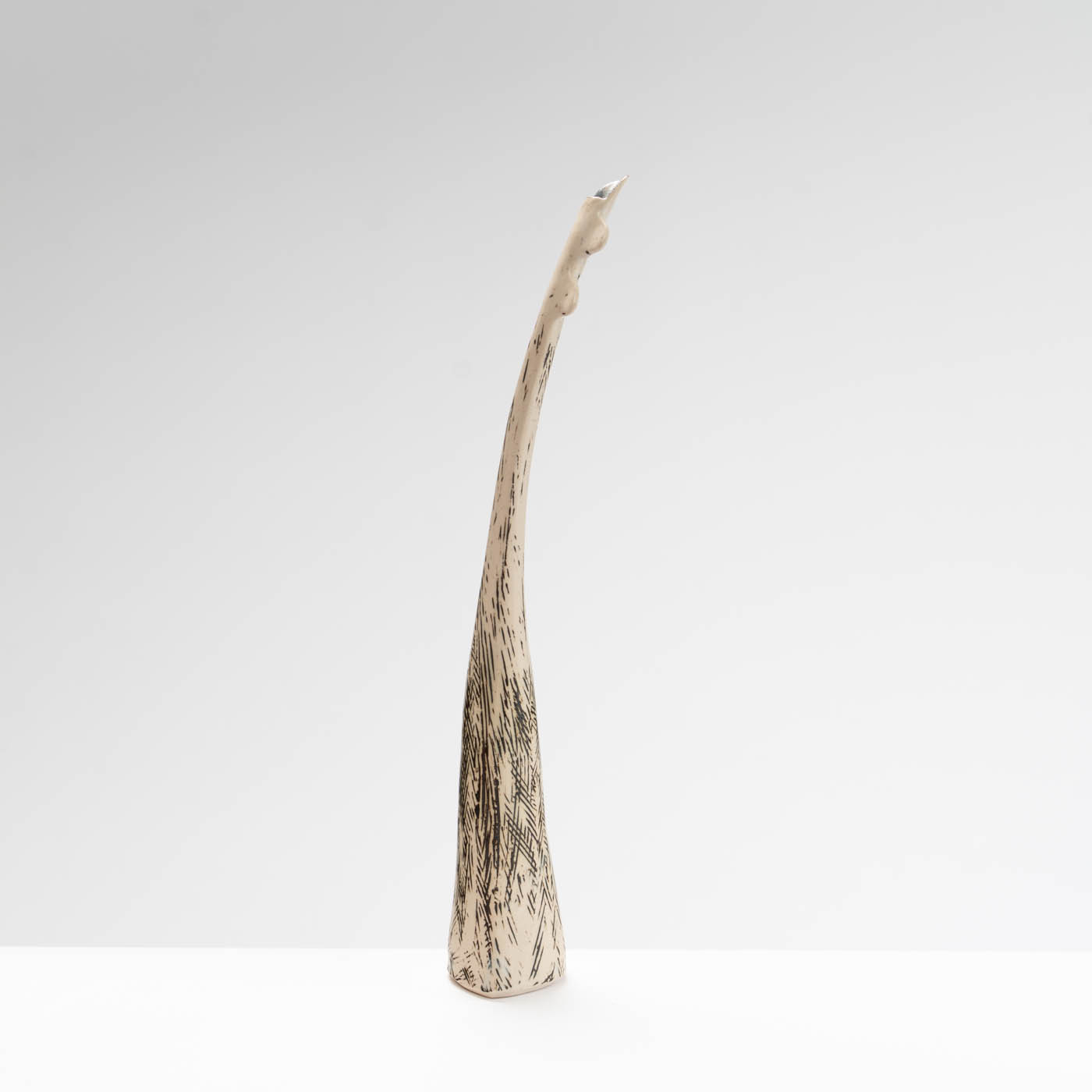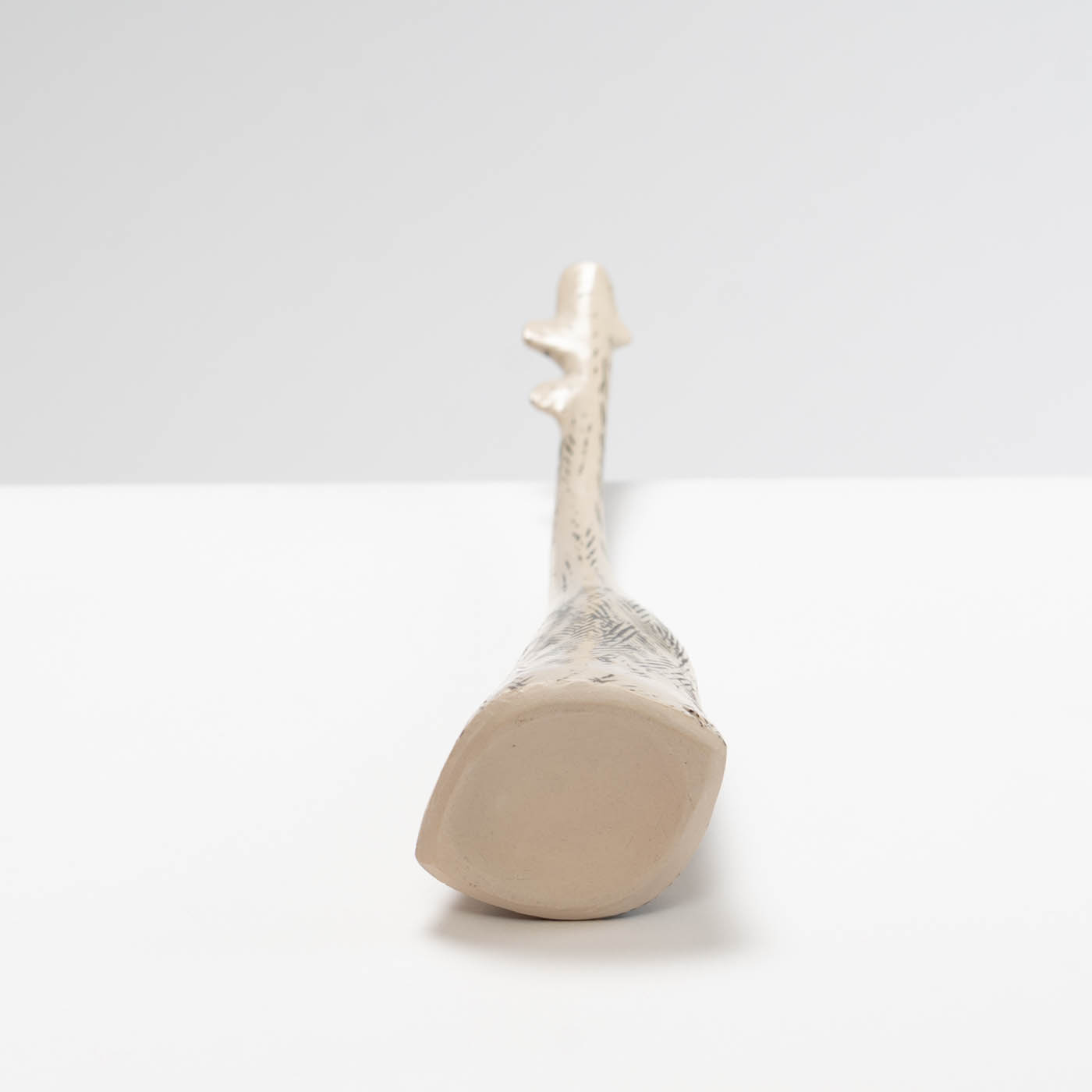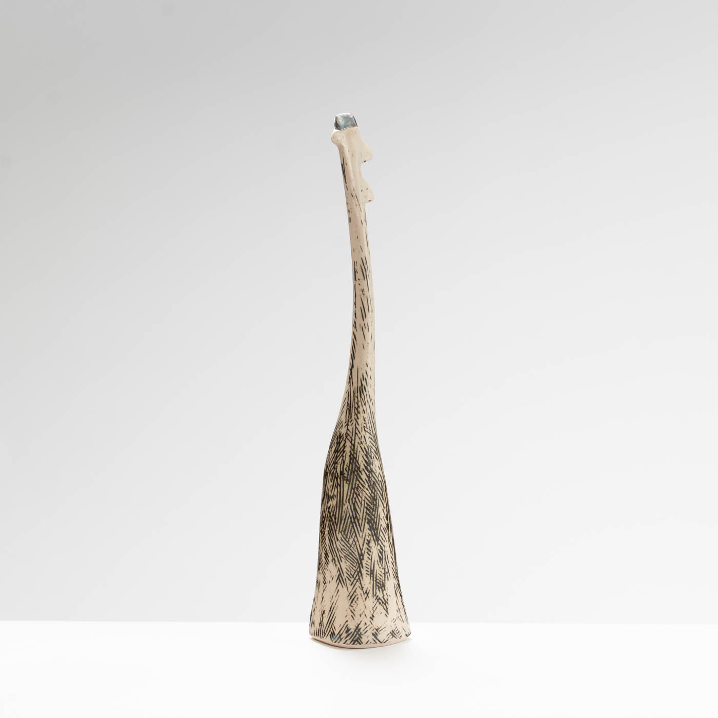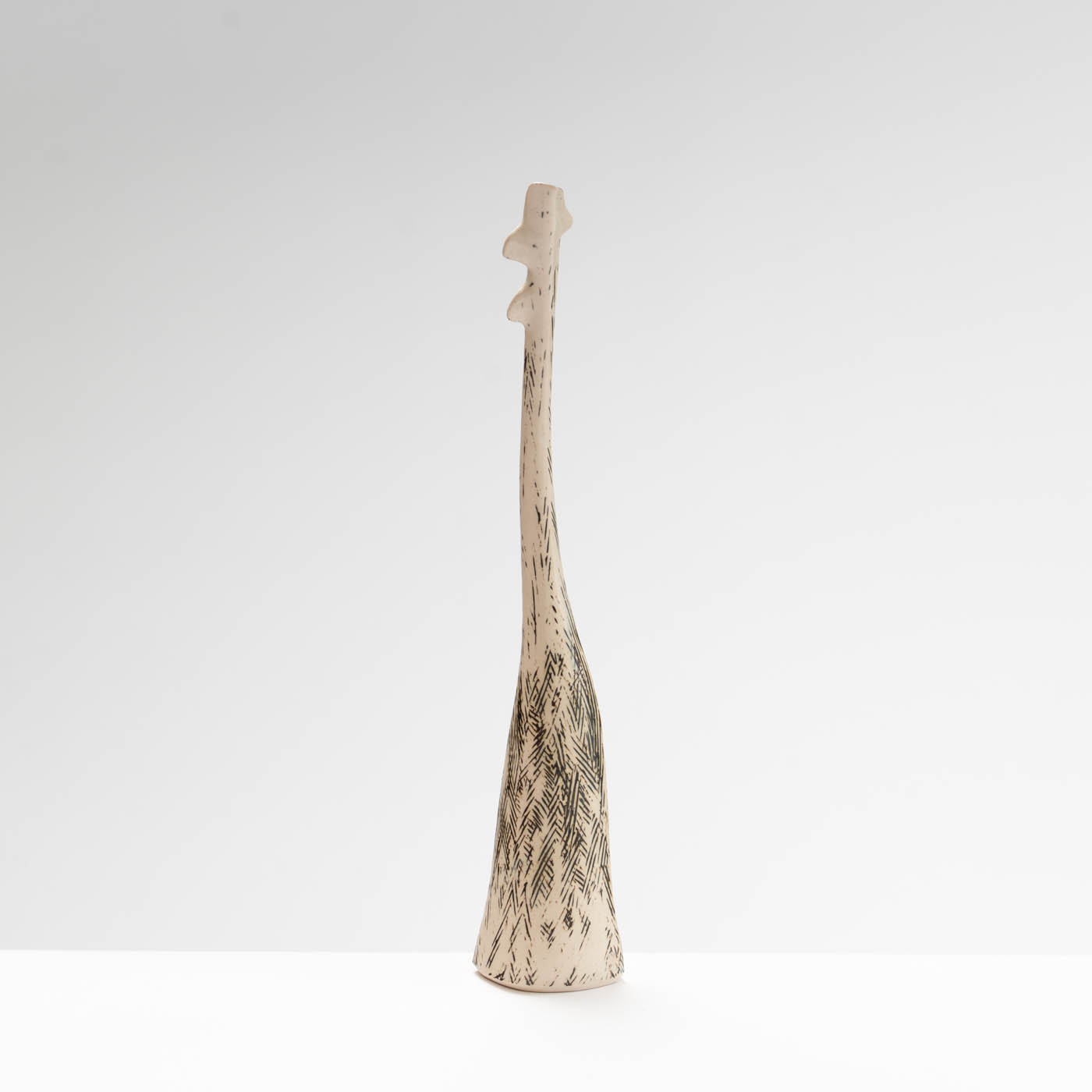 The slow repetitive hand-building techniques she uses to create her pieces offer a considered way to develop the work as each piece calmly grows. Deliberate junctions are made by breaking and re-joining the form where collars or shoulders then evolve. Surface markings are infused into the work during the making, with slips and oxides being applied throughout the drying stage. Built with a white stoneware clay body, the work may be glazed or left bare.