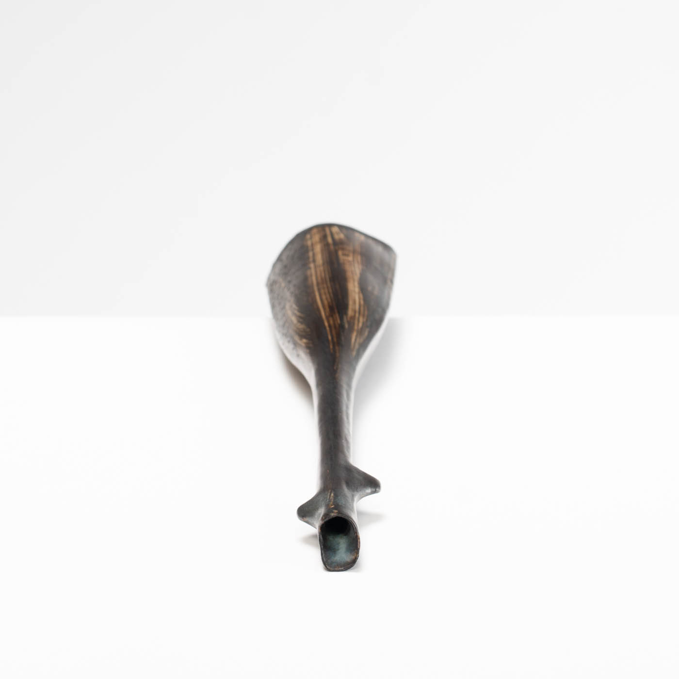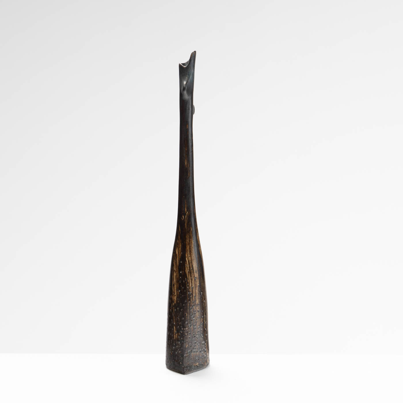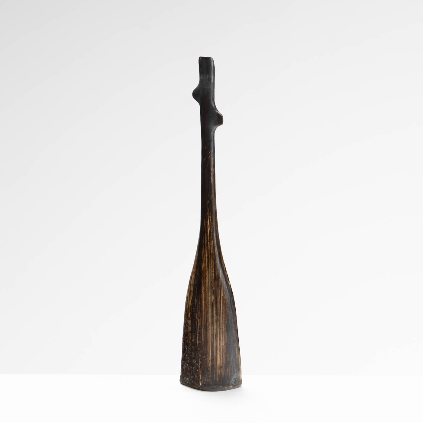 Sue’s work is inspired by the fragility and hidden strength found within the natural world. Deliberate junctions are made by breaking and re-joining the form where collars or shoulders then evolve. This sculptural vessel is coil-built with stoneware clay. It is decorated with texture, brushed with slips, and finished with glaze.