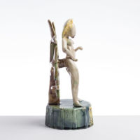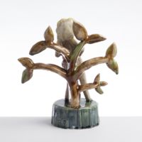 Soul House is inspired by Hiro’s nostalgic longing and memories of her childhood in rural Japan, particularly connecting her to walks with her grandmother and her sense of the spirit of nature intertwining with village life. This stoneware sculpture on a wooden plinth is hand-built with intricate textural details of vines, animals and birds enveloped in glaze.