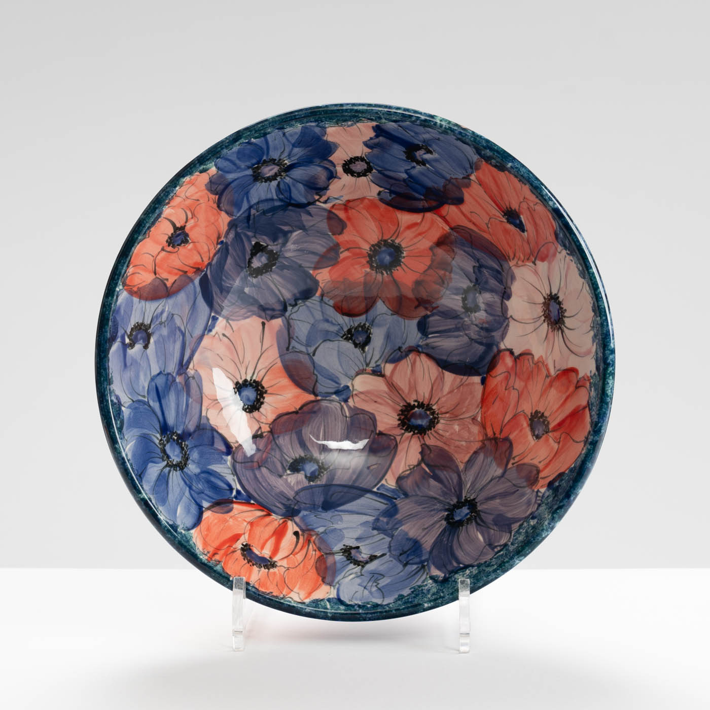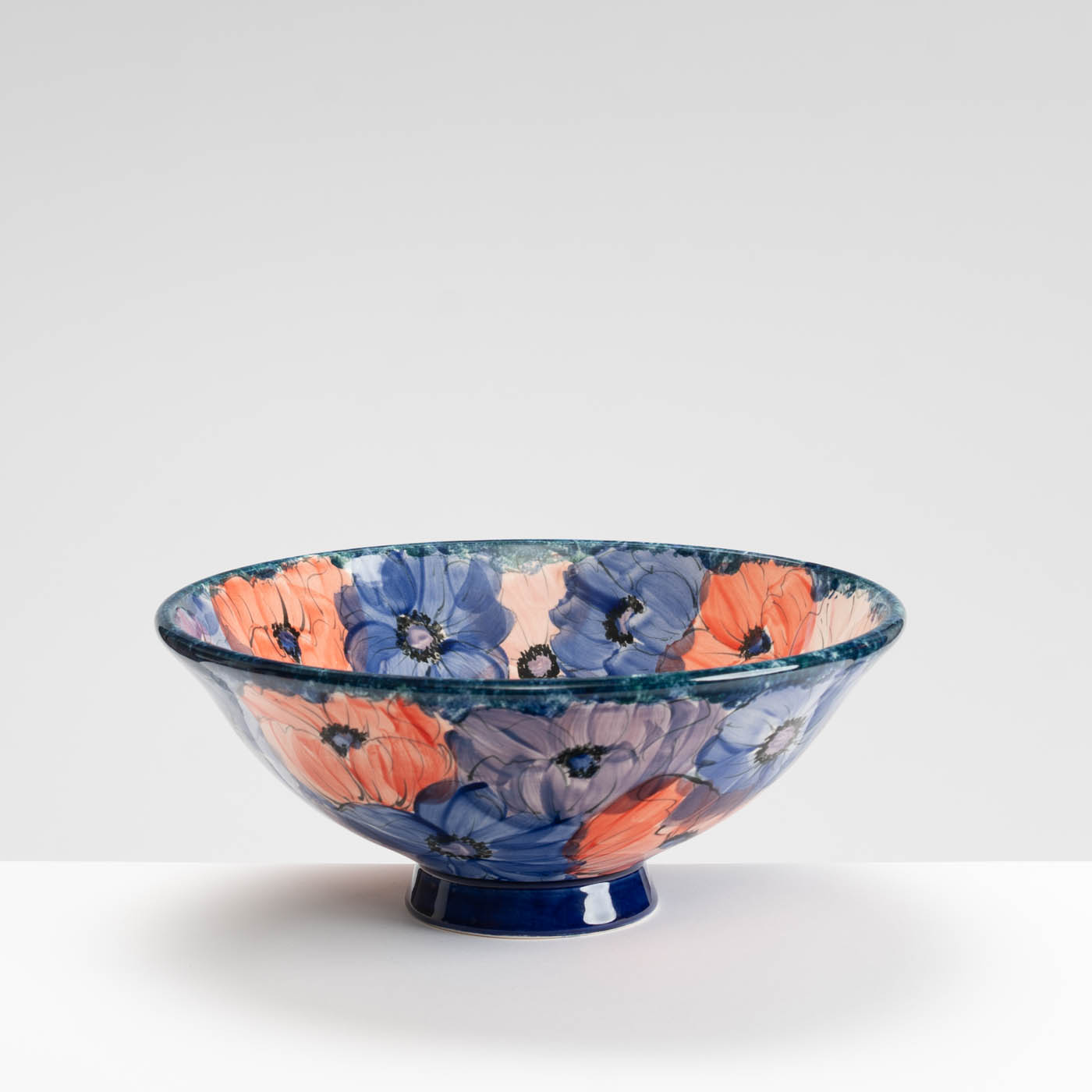 This earthenware bowl is wheel-thrown in fine white earthenware clay. The surface is lightly burnished to create a smooth surface for the colourful underglaze decoration which is painted freely onto the surface. The piece is finished in a transparent glaze.