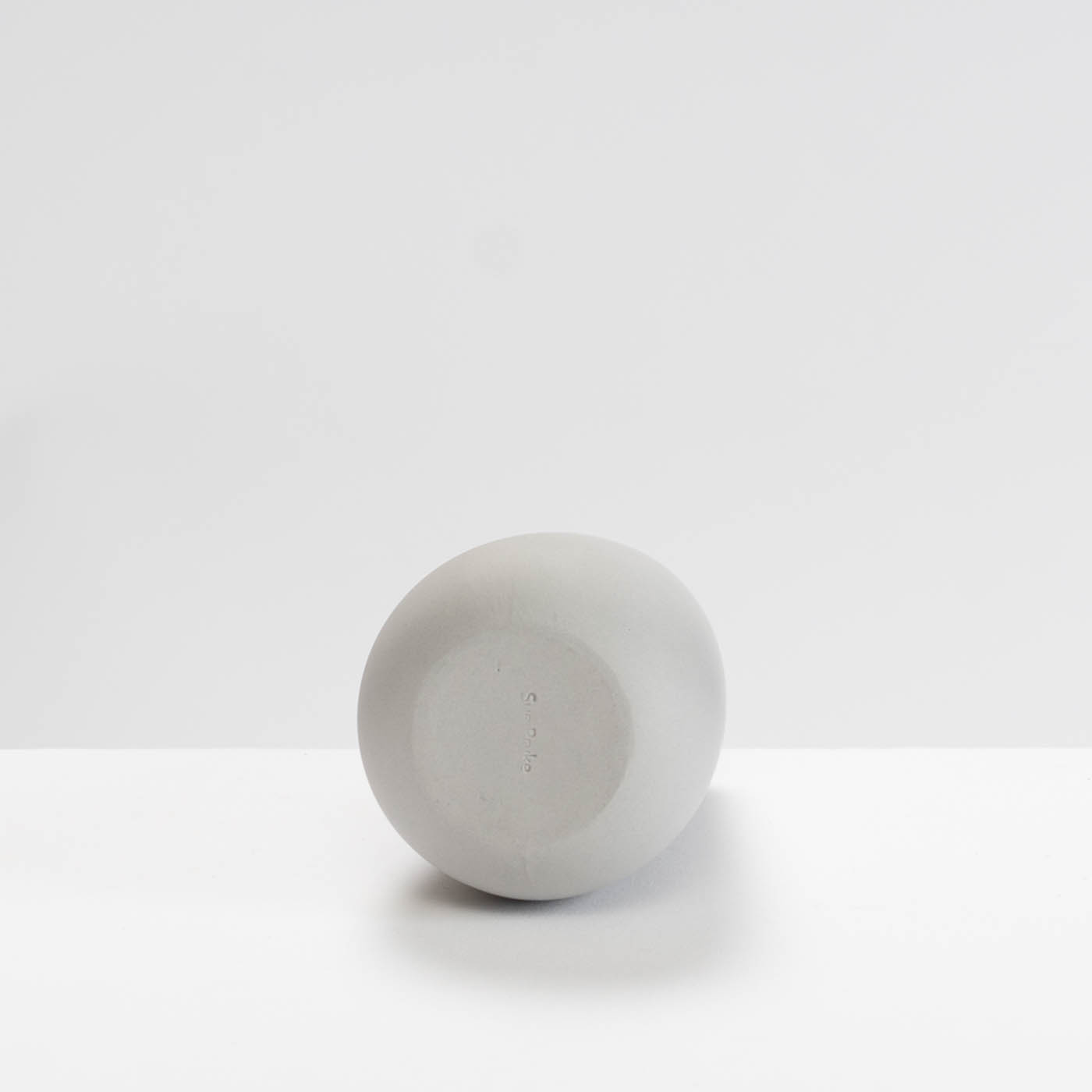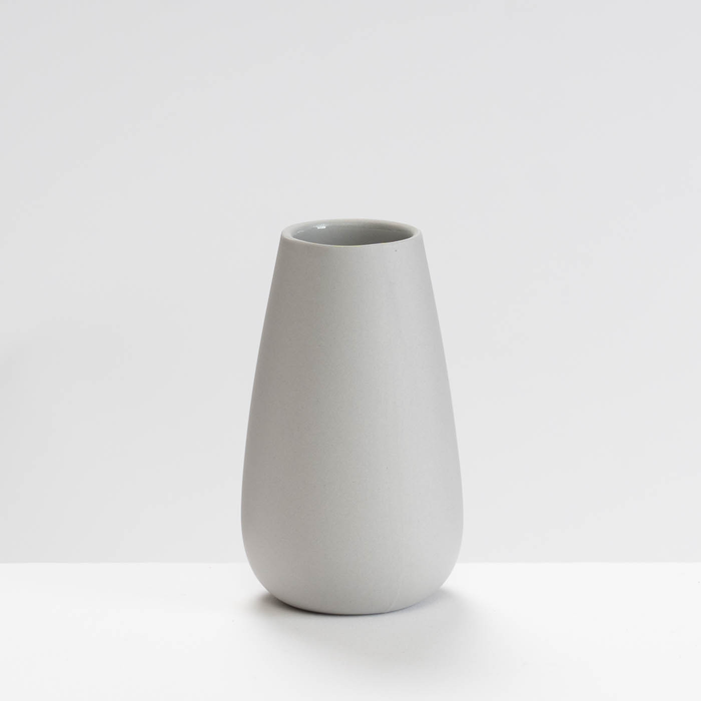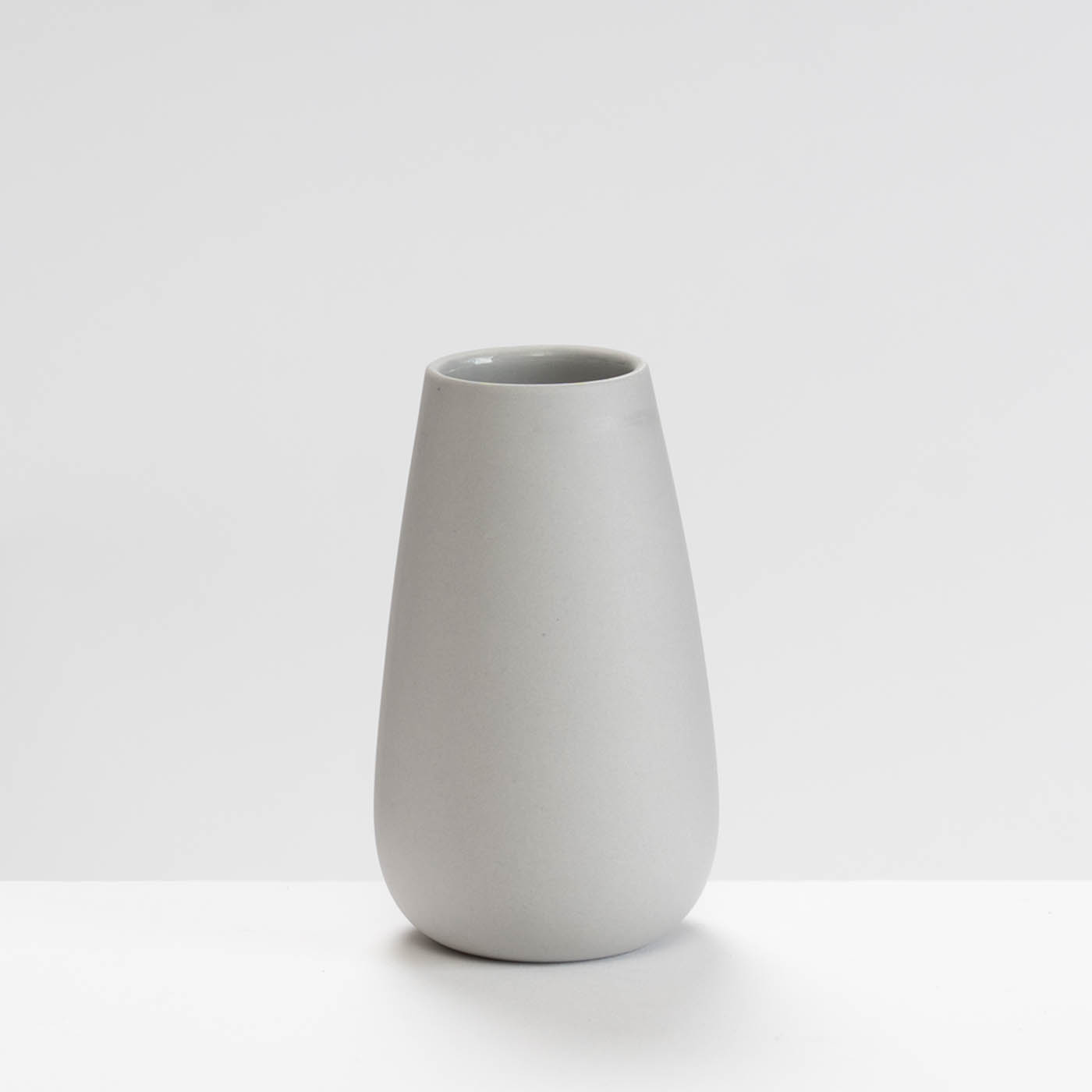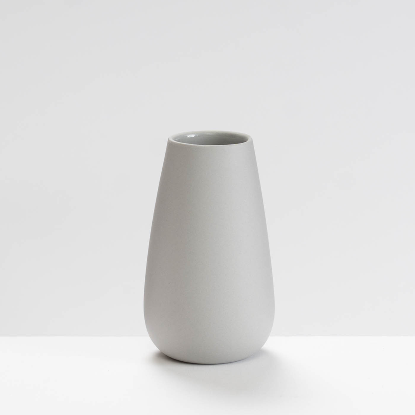 This grey porcelain vase is slip-cast. Its minimalist form is elevated by Sue’s soft pastel colour palette, a silky polished exterior, and a glazed interior, making the vessel both elegant and fully functional.