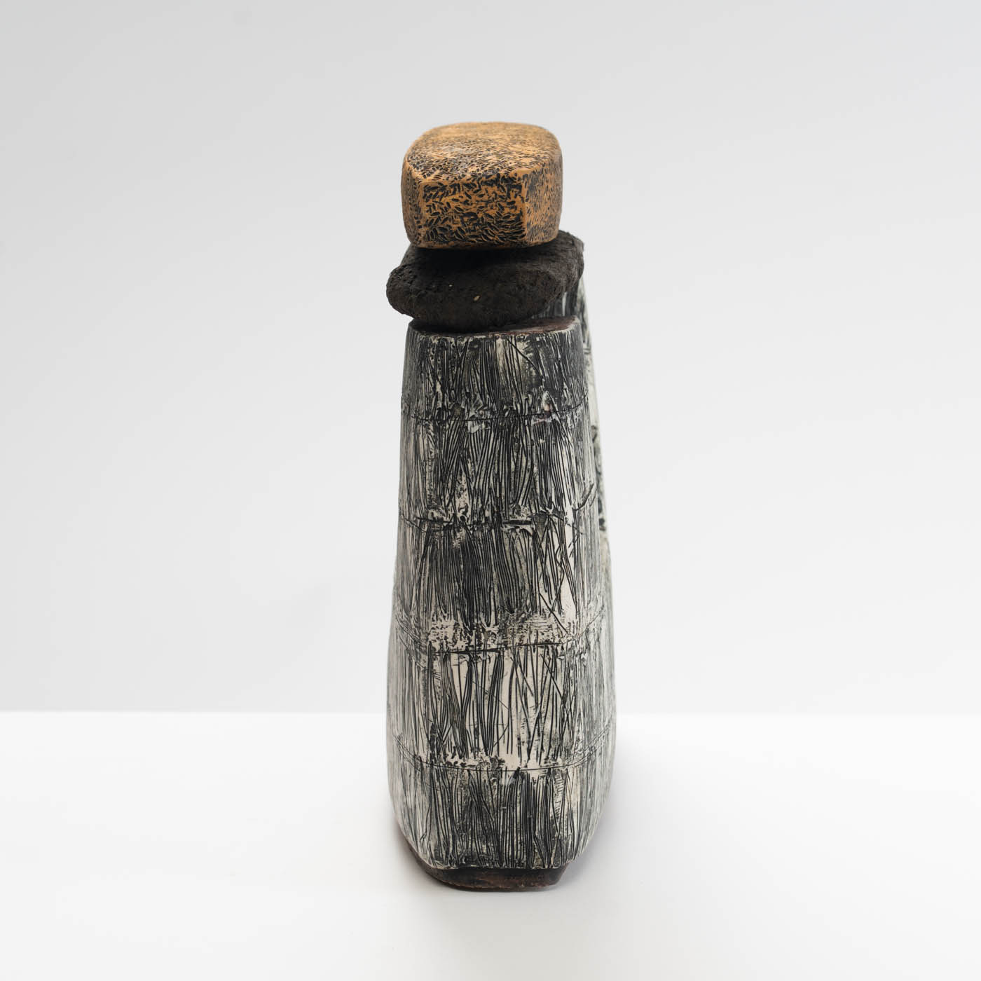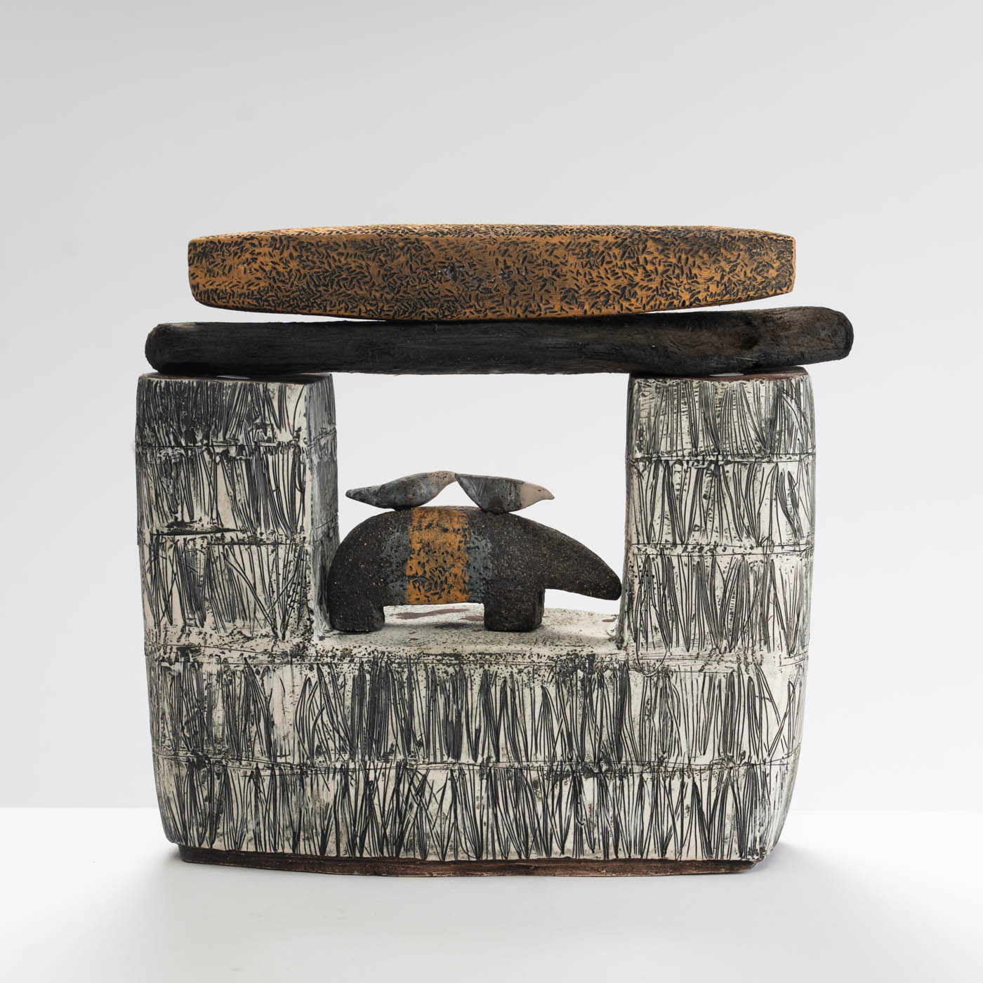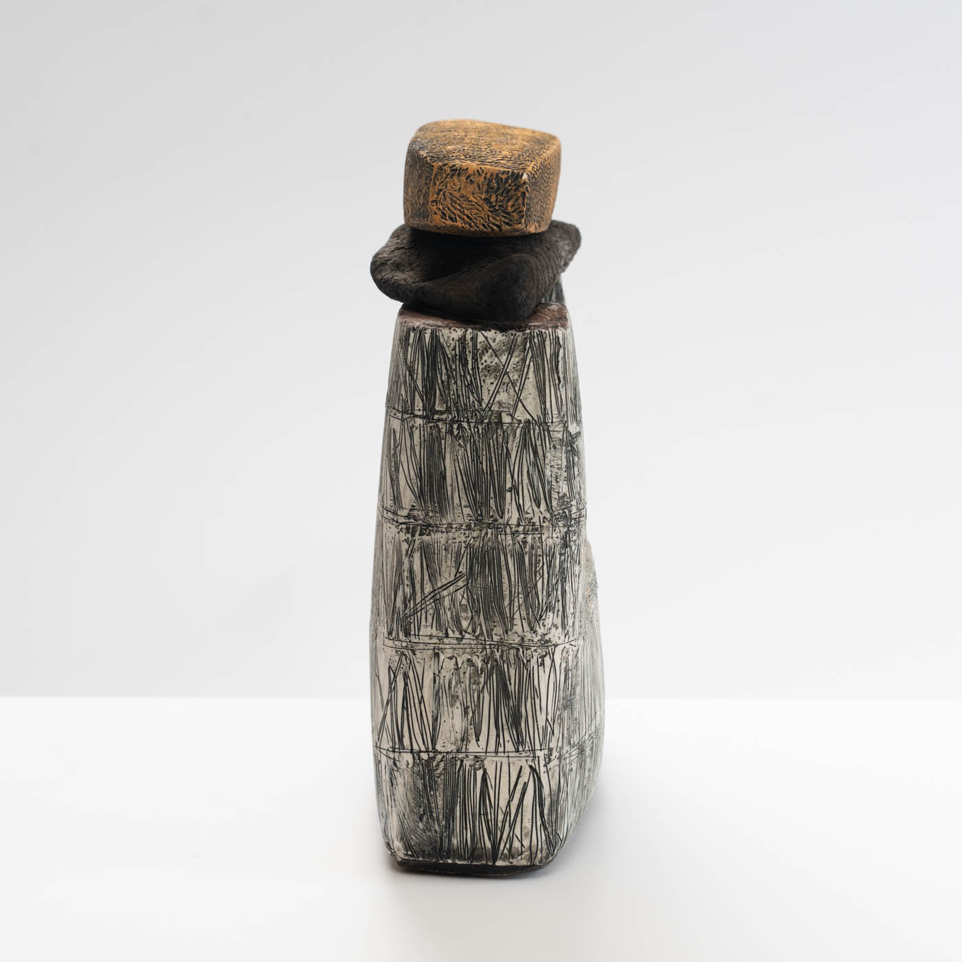 This hand-built sculpture is made using stoneware and porcelain clay bodies, combined with dyed driftwood. It is composed of multiple separate elements that are carefully balanced and positioned using colour-coded stickers. The two bird forms attach to the main figure via ceramic pegs.