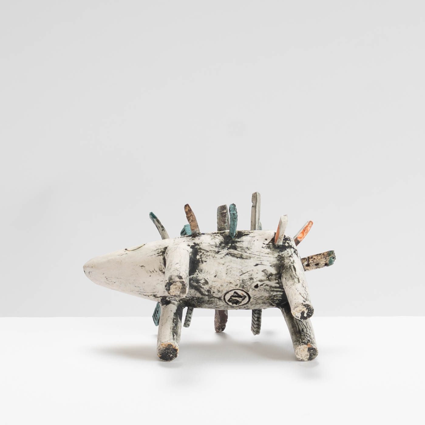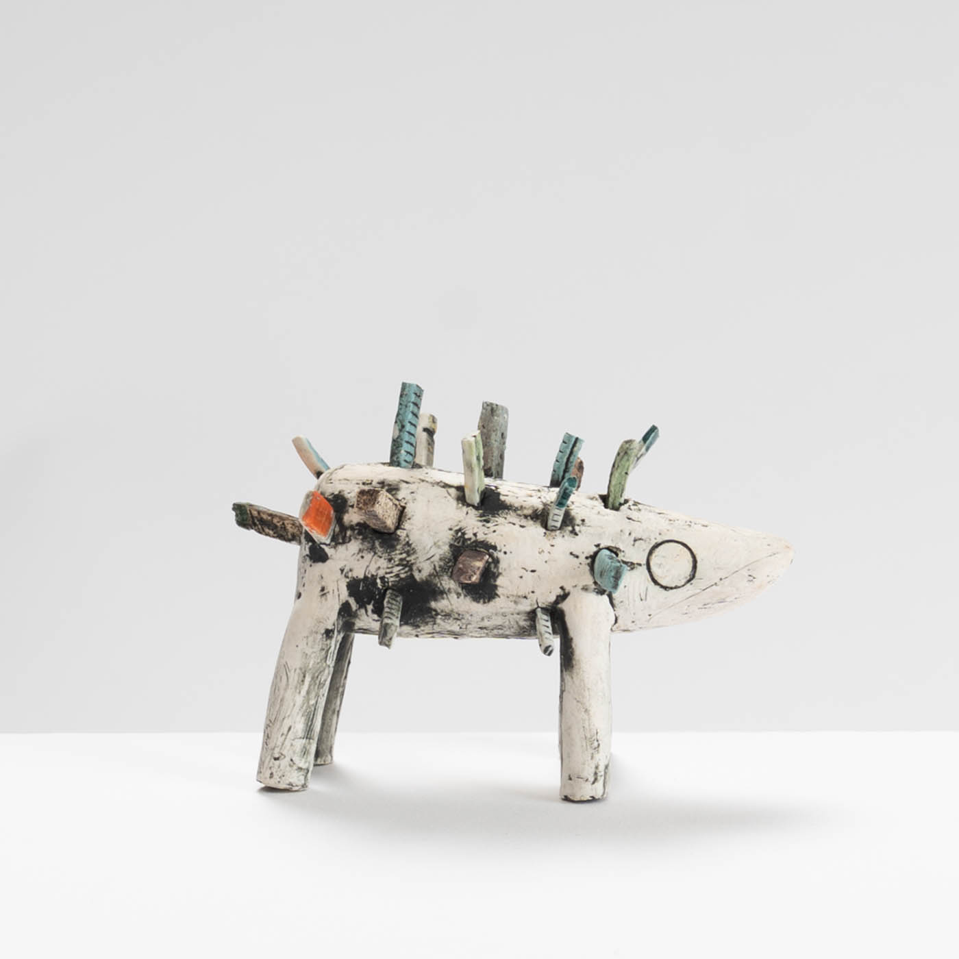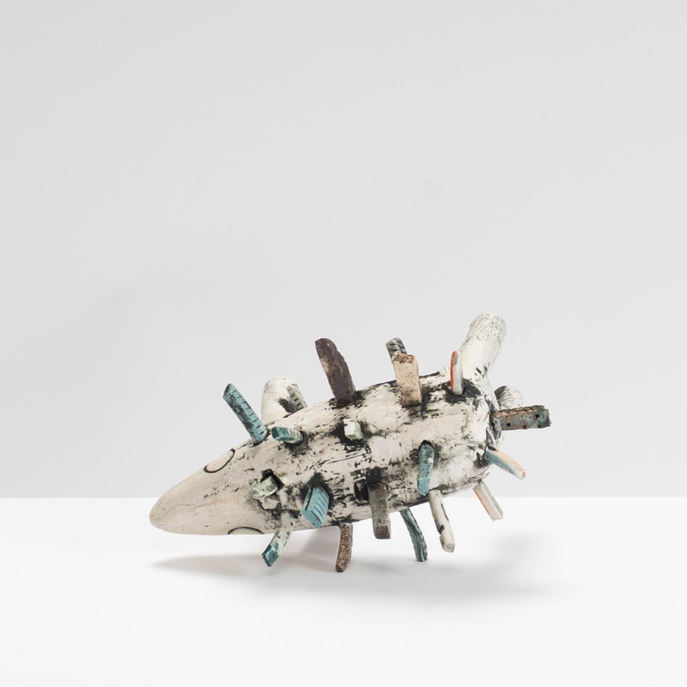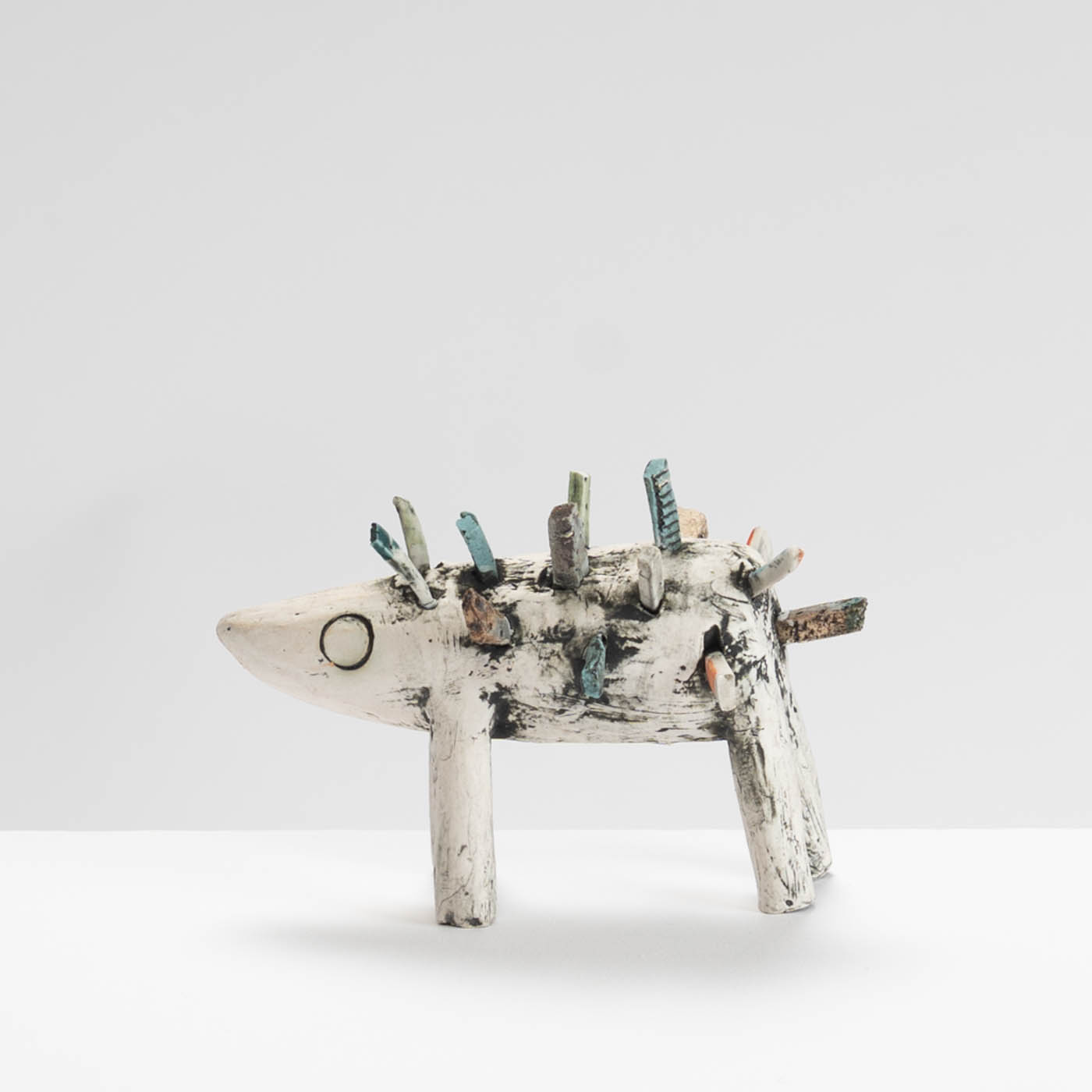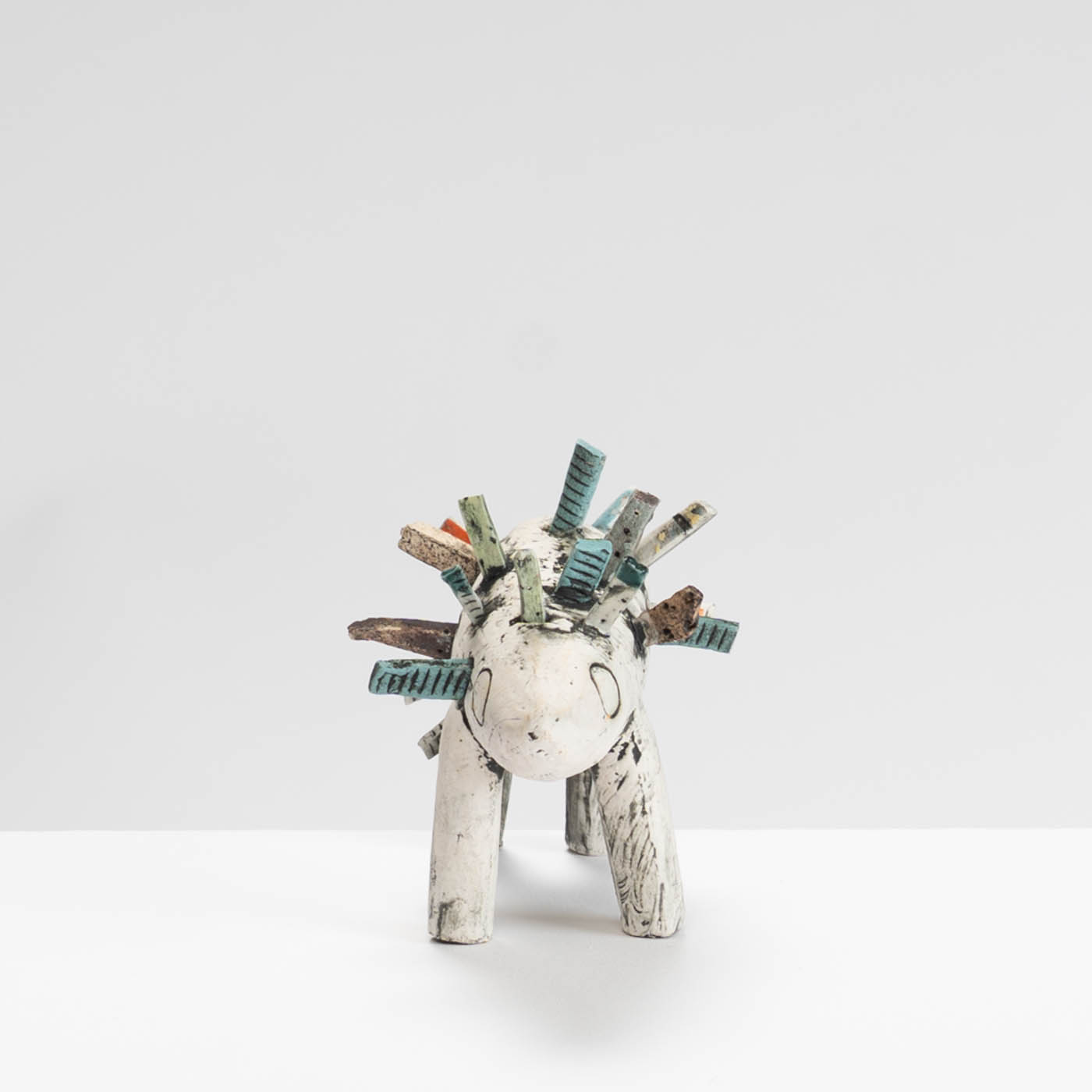 This sculpture is hand-built from stoneware and porcelain clay bodies and painted. It features individual ceramic pieces attached to the main form, creating a striking spiny texture that adds both visual and tactile interest.