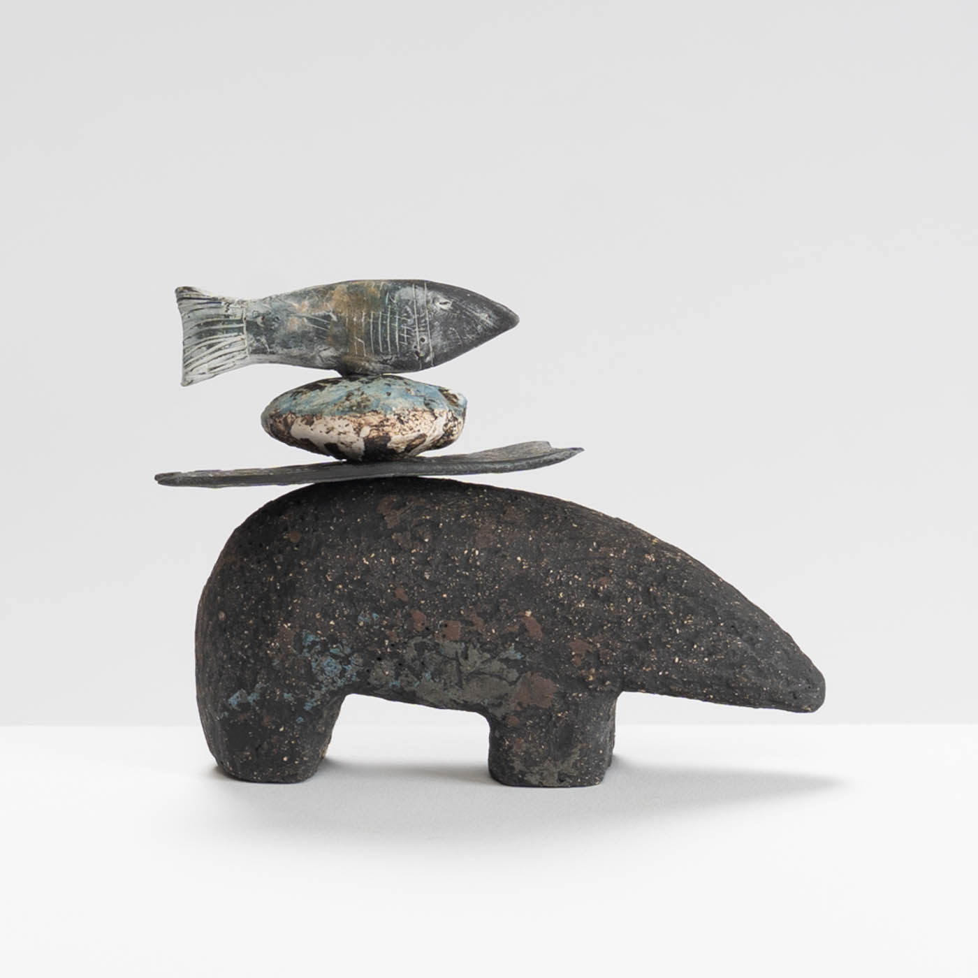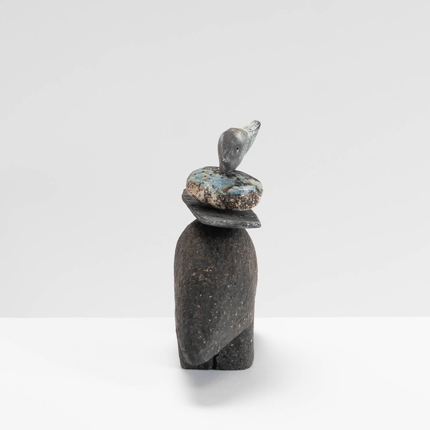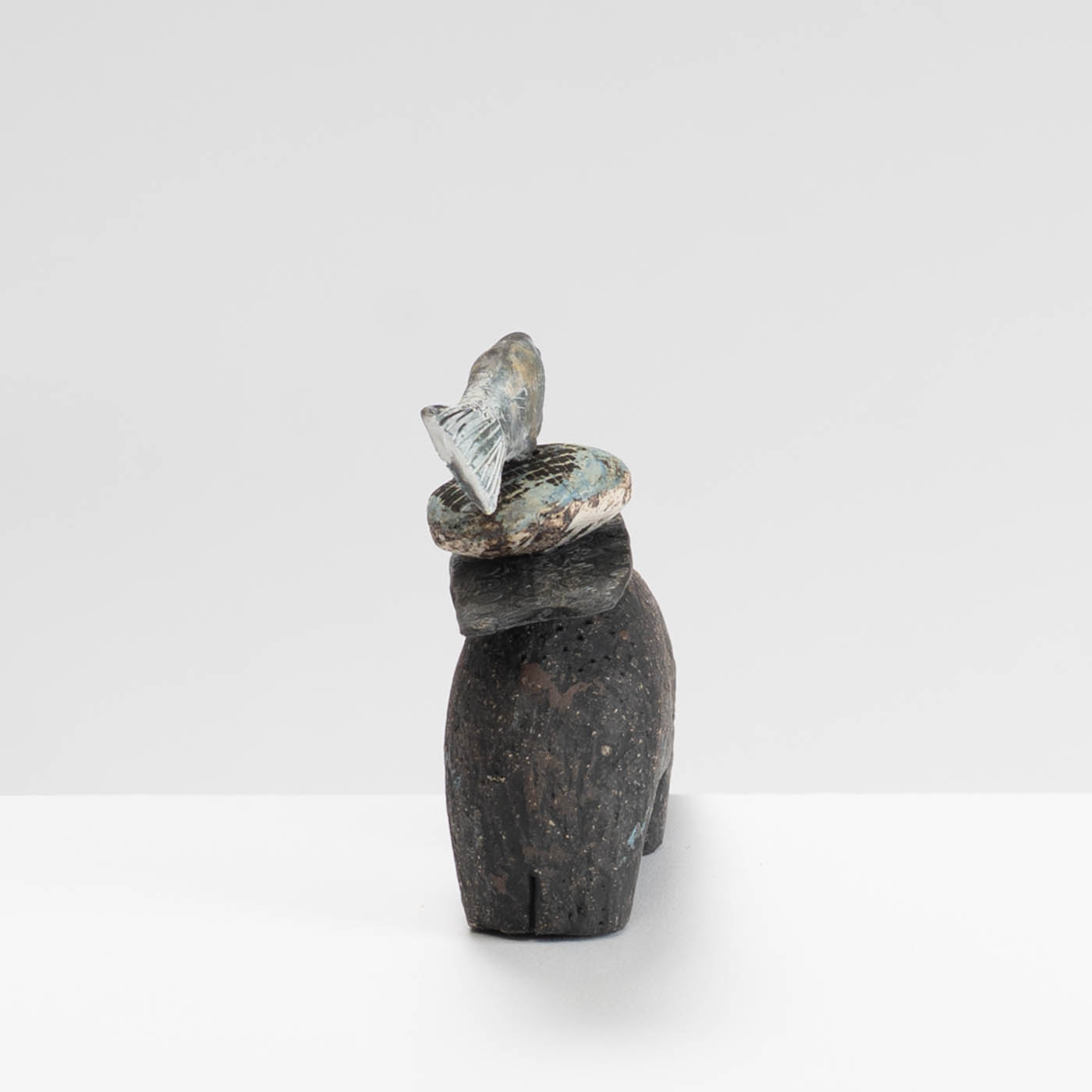 This hand-built sculpture is made using stoneware and porcelain clay bodies, combined with found materials. It is composed of multiple separate elements, each with a central hole, that are stacked and secured onto the main figure via a ceramic peg. Shirley’s intention is for the order of stacking to be left to the individual, allowing a sense of play in the composition.