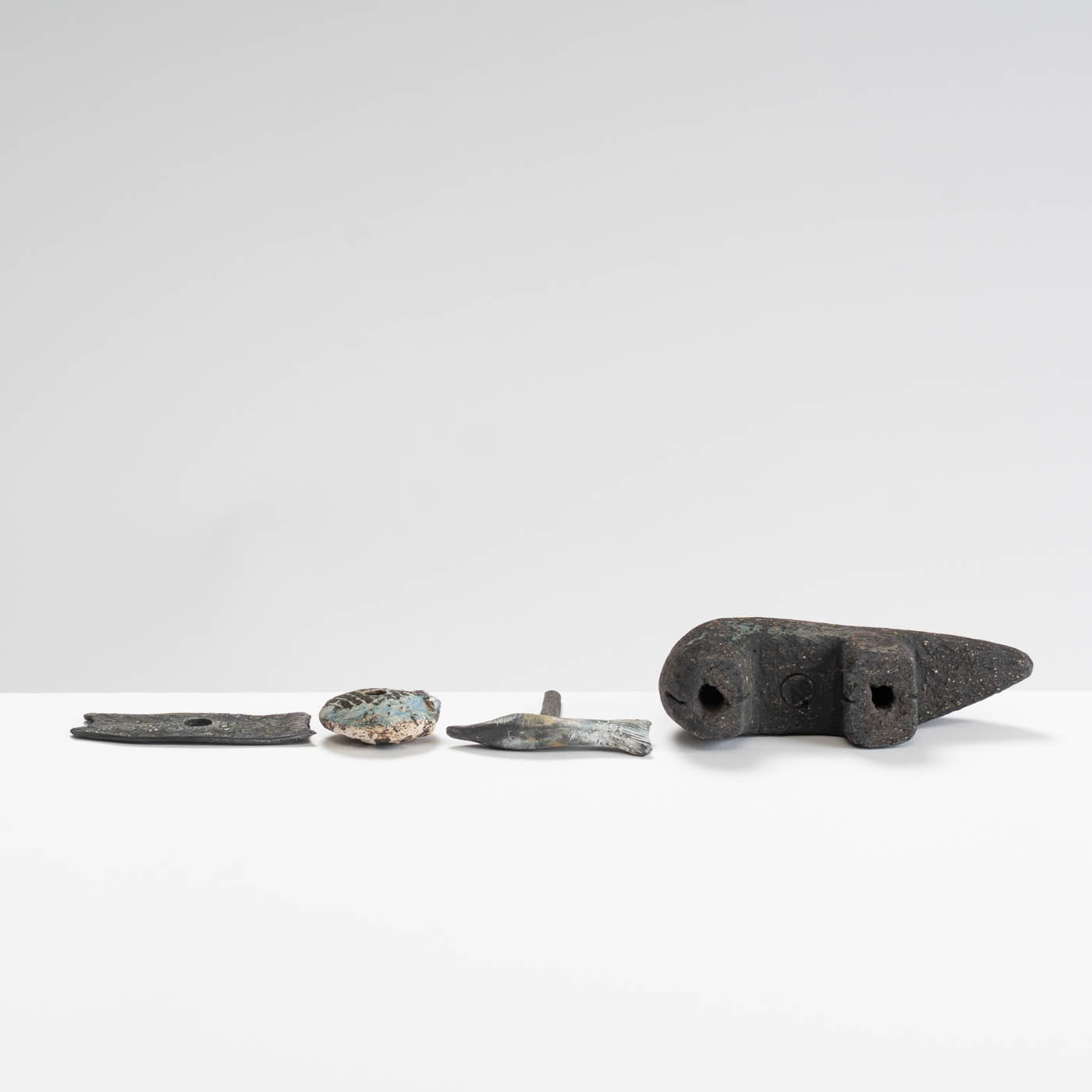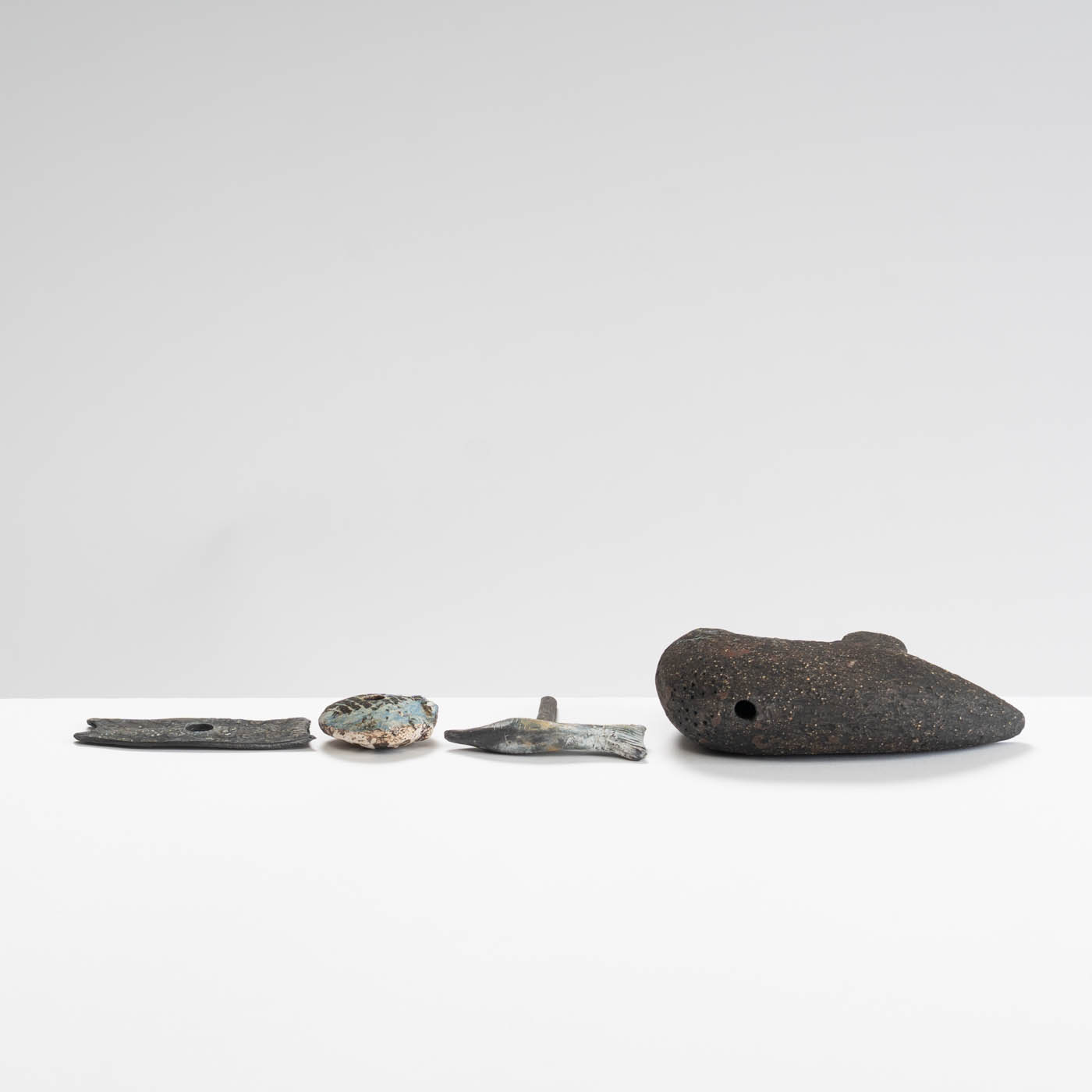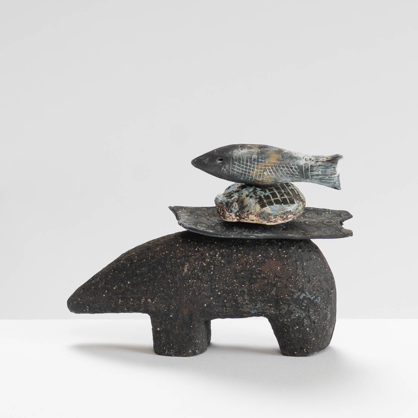 This hand-built sculpture is made using stoneware and porcelain clay bodies, combined with found materials. It is composed of multiple separate elements, each with a central hole, that are stacked and secured onto the main figure via a ceramic peg. Shirley’s intention is for the order of stacking to be left to the individual, allowing a sense of play in the composition.
