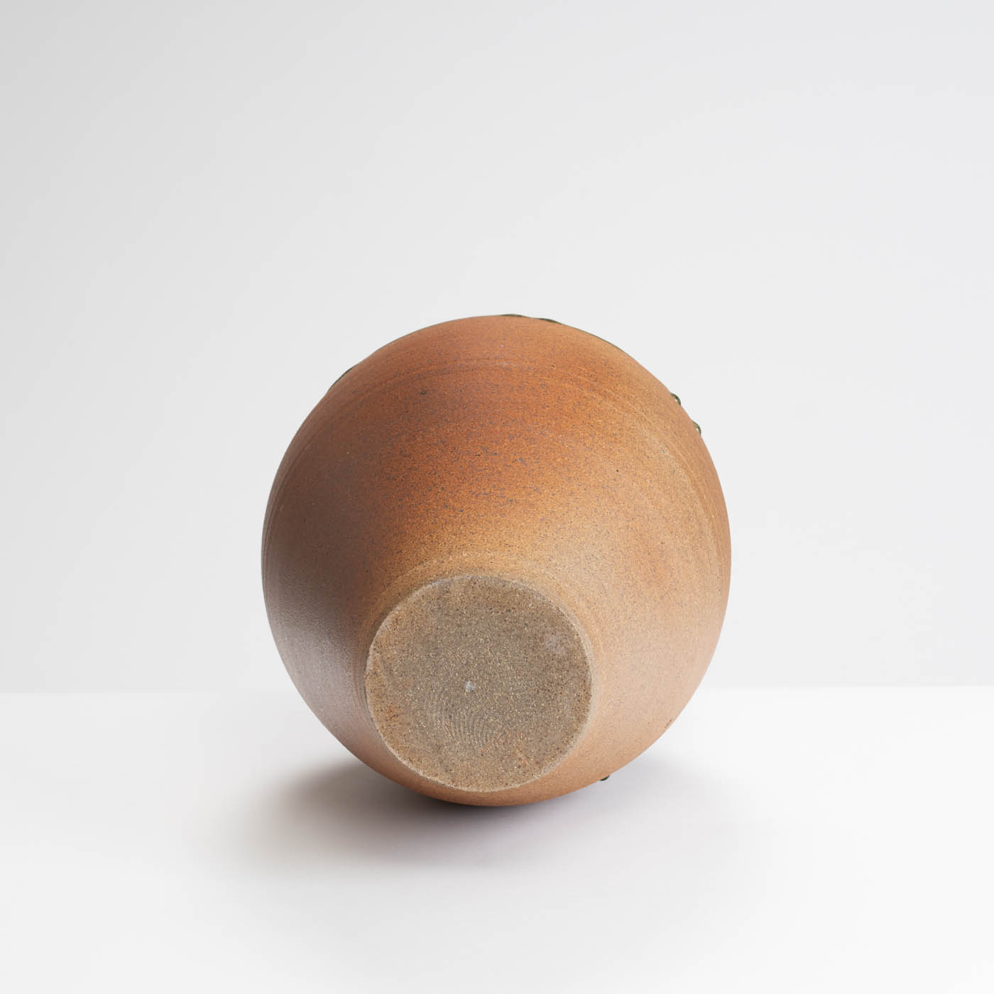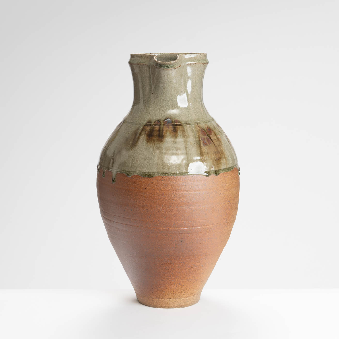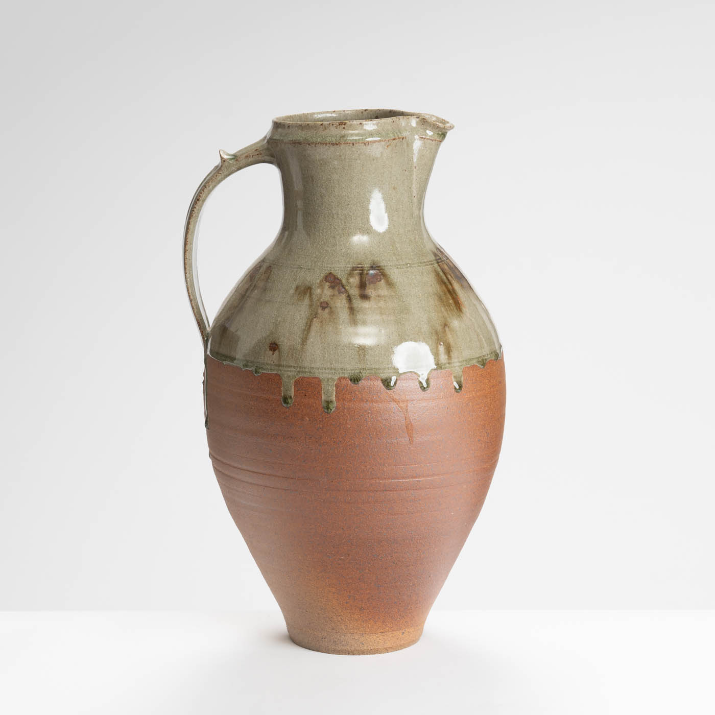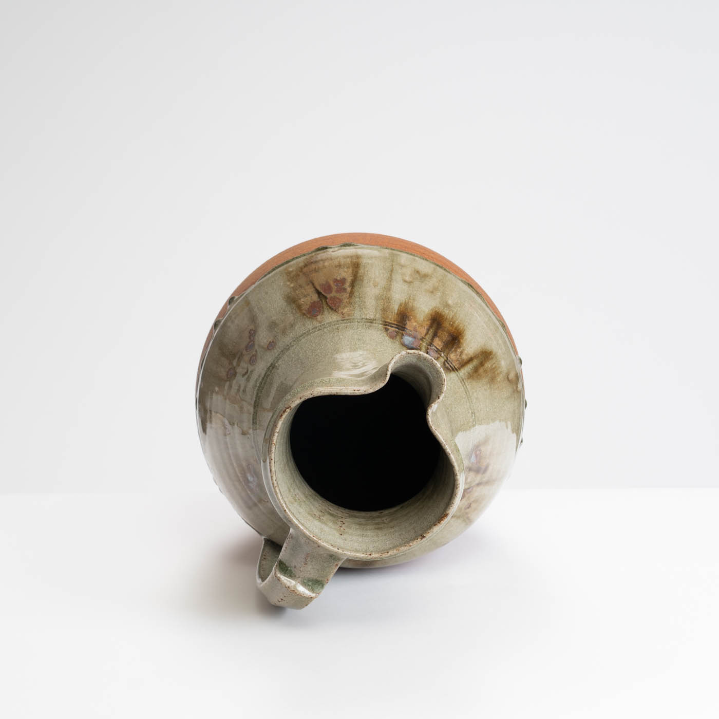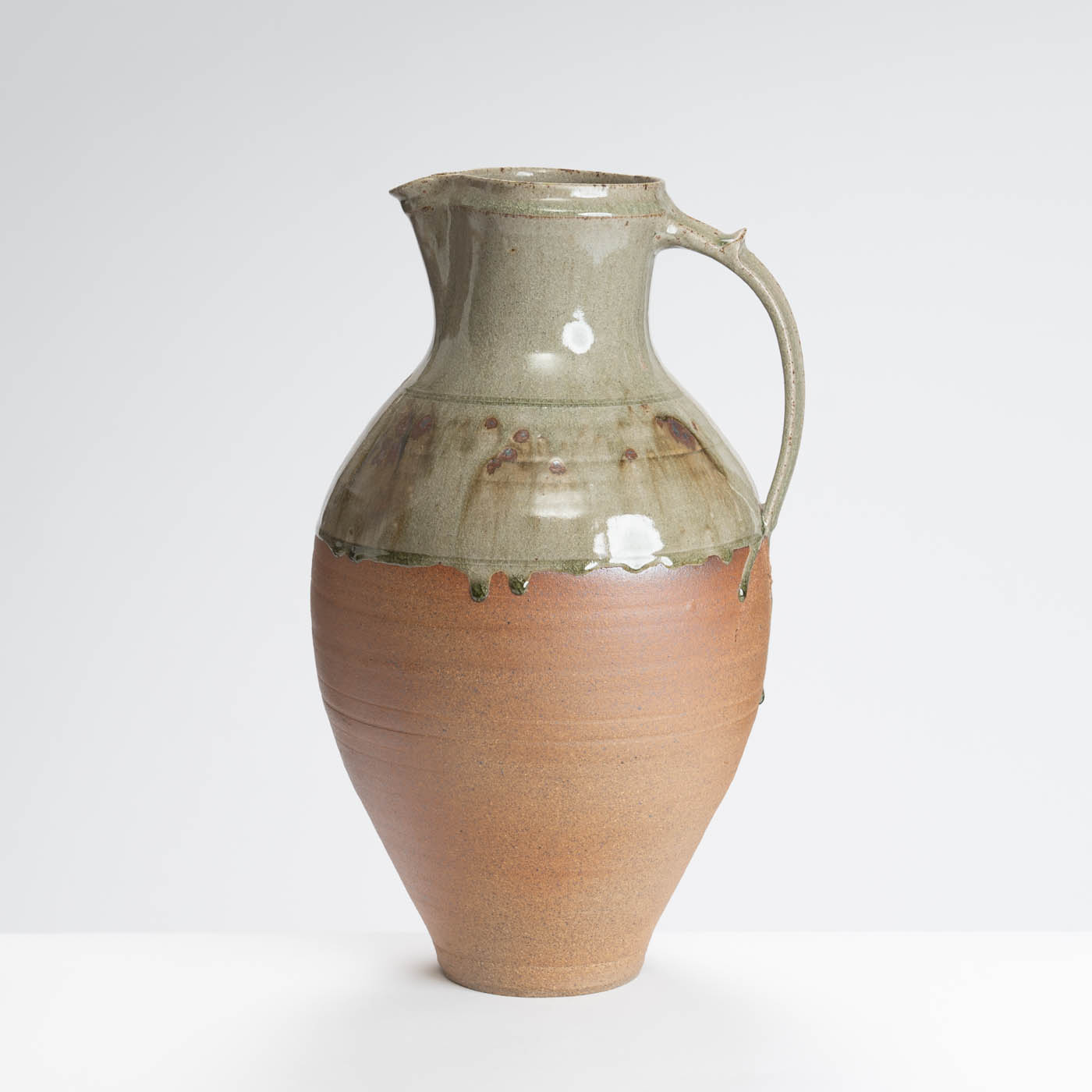 This pitcher is thrown on a momentum wheel with lightly grogged and sanded stoneware clay. It is decorated with a natural glaze containing wood ash with iron inclusions, and reduction fired in either a gas or wood kiln. Tom aims for a style of refined ‘country’ pottery robust enough for everyday use.