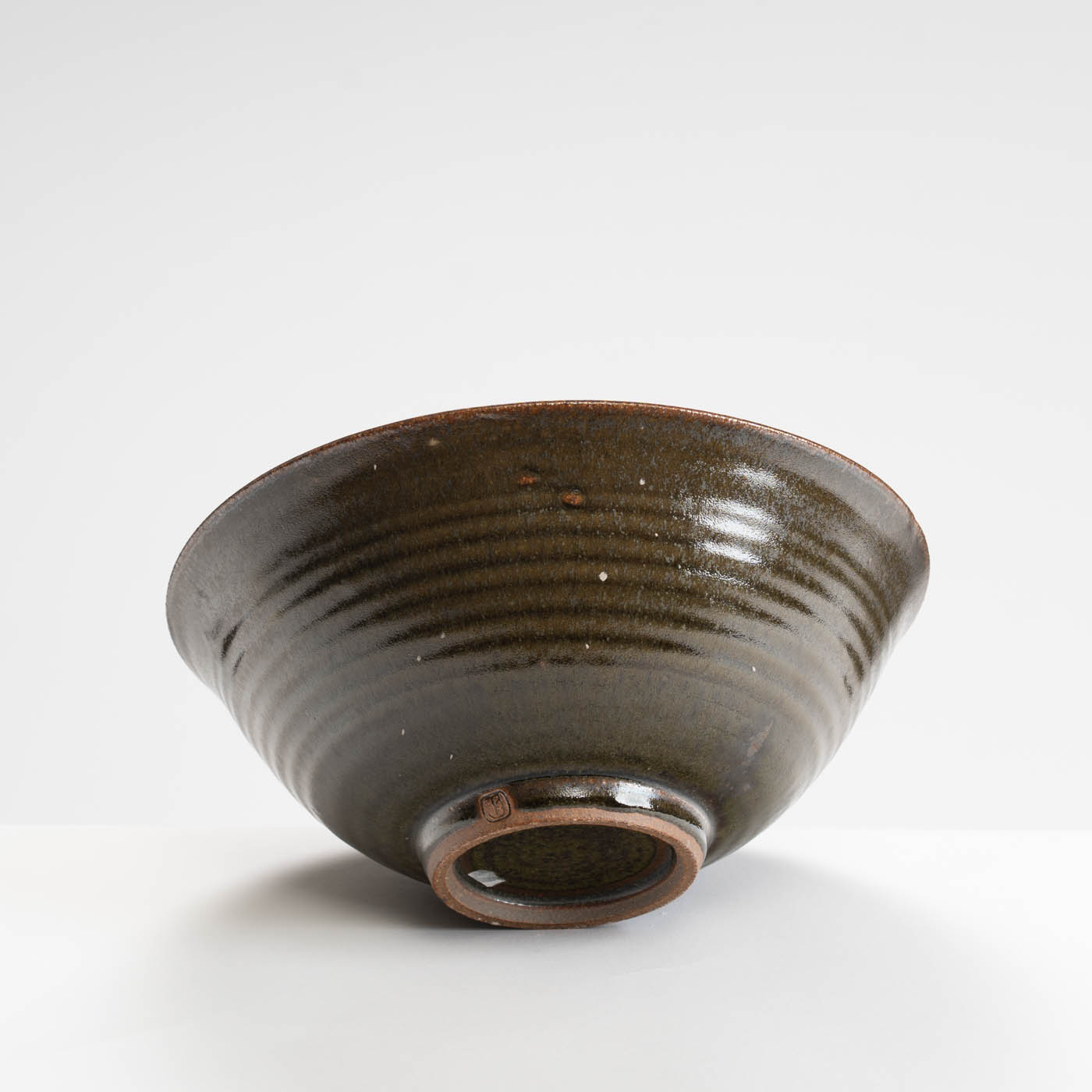 This bowl is thrown on a momentum wheel with lightly grogged and sanded stoneware clay. It is decorated with a natural dark celadon glaze, and reduction fired in either a gas or wood kiln. Tom aims for a style of refinedcountry’ pottery robust enough for everyday use.