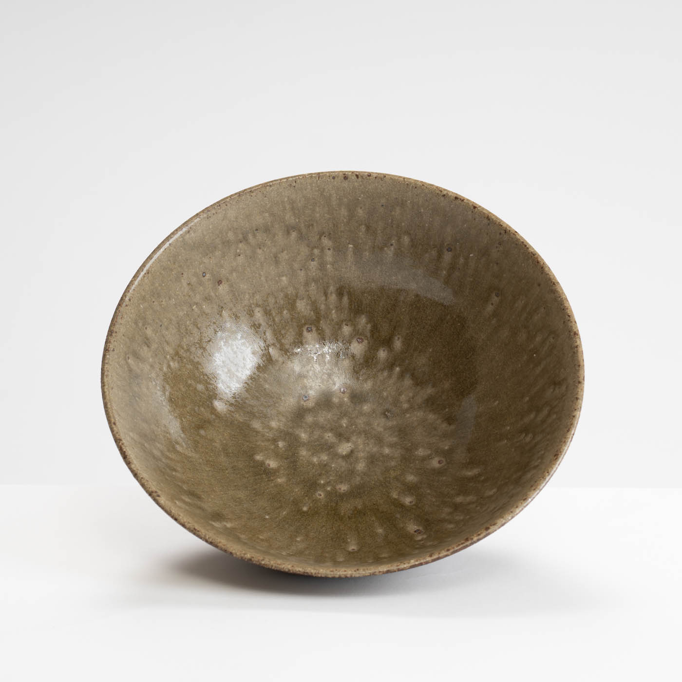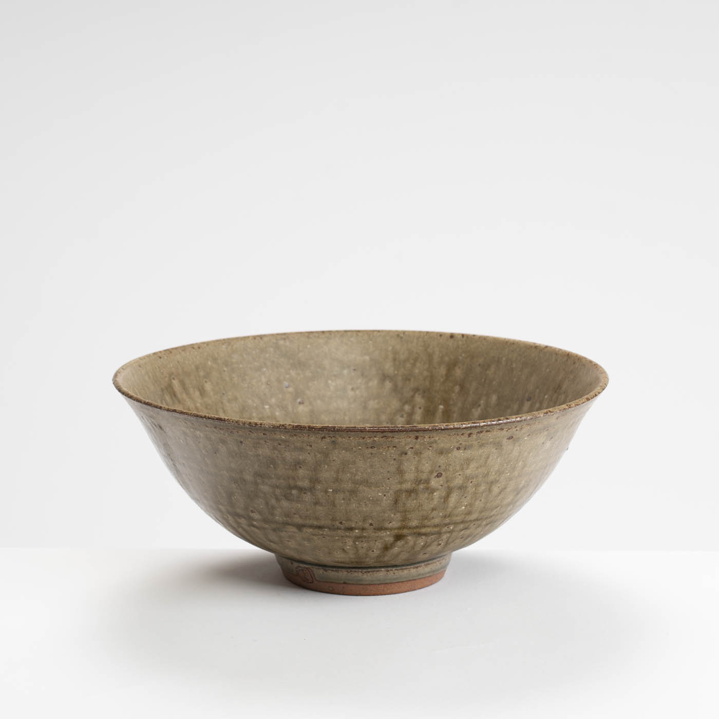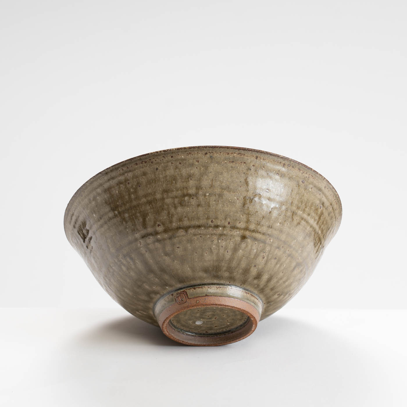 This bowl is thrown on a momentum wheel with lightly grogged and sanded stoneware clay. It is decorated with a natural glaze containing ash wood ash, and reduction fired in either a gas or wood kiln. Tom aims for a style of refined ‘country’ pottery robust enough for everyday use.
