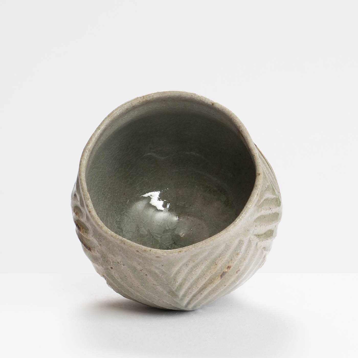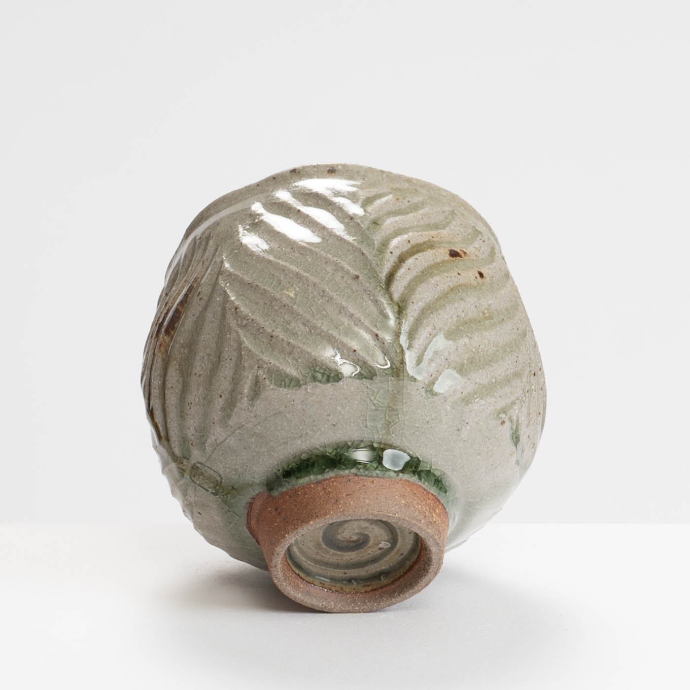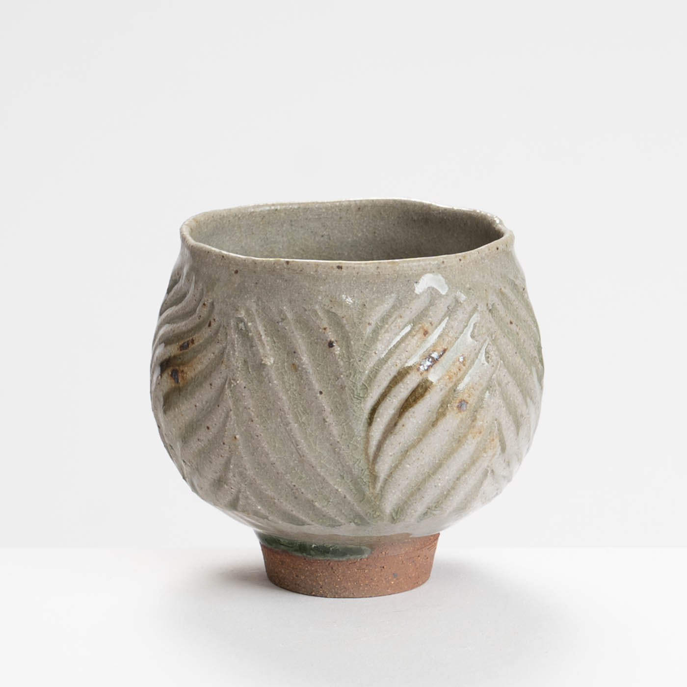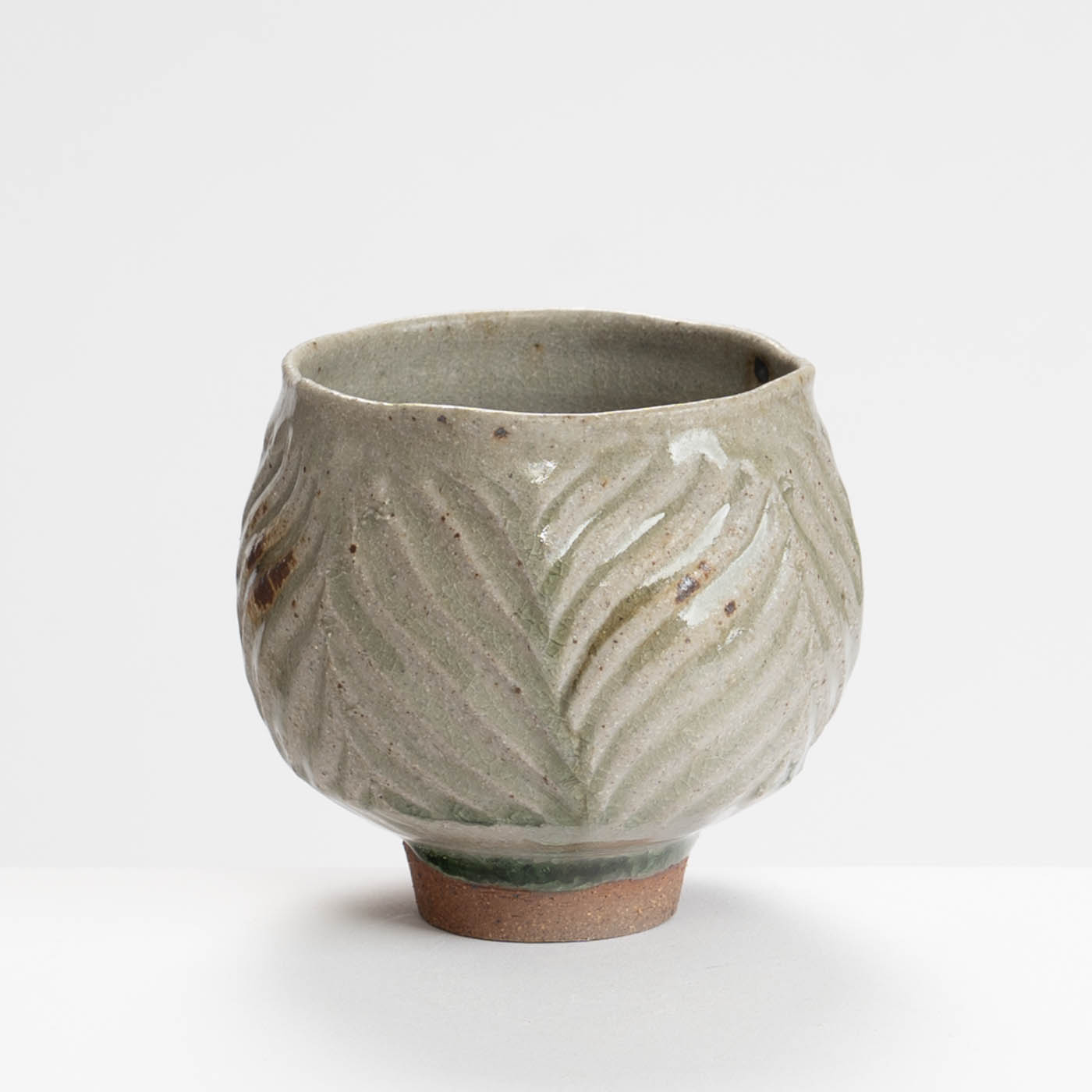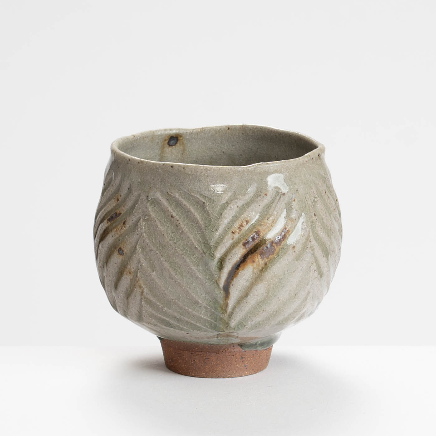 This teabowl is thrown on a momentum wheel with lightly grogged and sanded stoneware clay. It is wire textured and decorated with a natural glaze containing apple wood ash and iron inclusions, and reduction fired in either a gas or wood kiln. Tom aims for a style of refined ‘country’ pottery robust enough for everyday use.