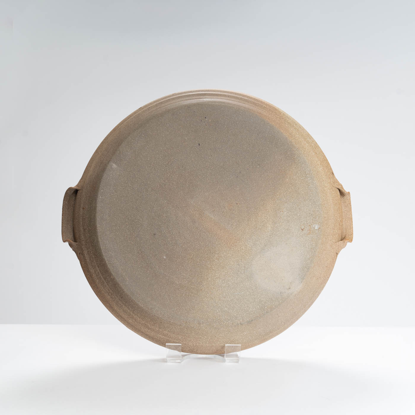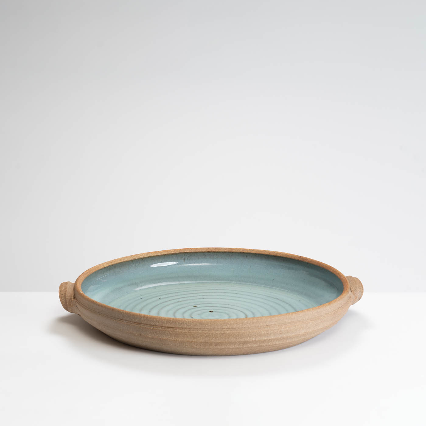 This large handled platter is thrown on a momentum wheel with lightly grogged and sanded stoneware clay. It is decorated with a natural Chun glaze, and reduction fired in either a gas or wood kiln. Tom aims for a style of refined ‘country’ pottery robust enough for everyday use.