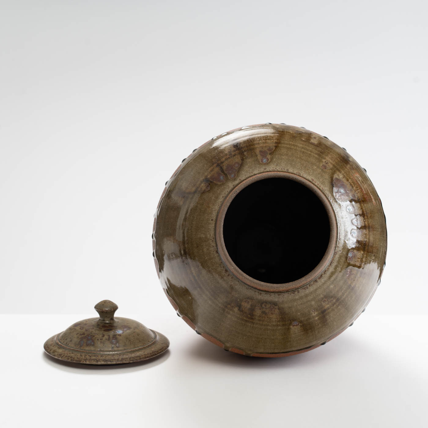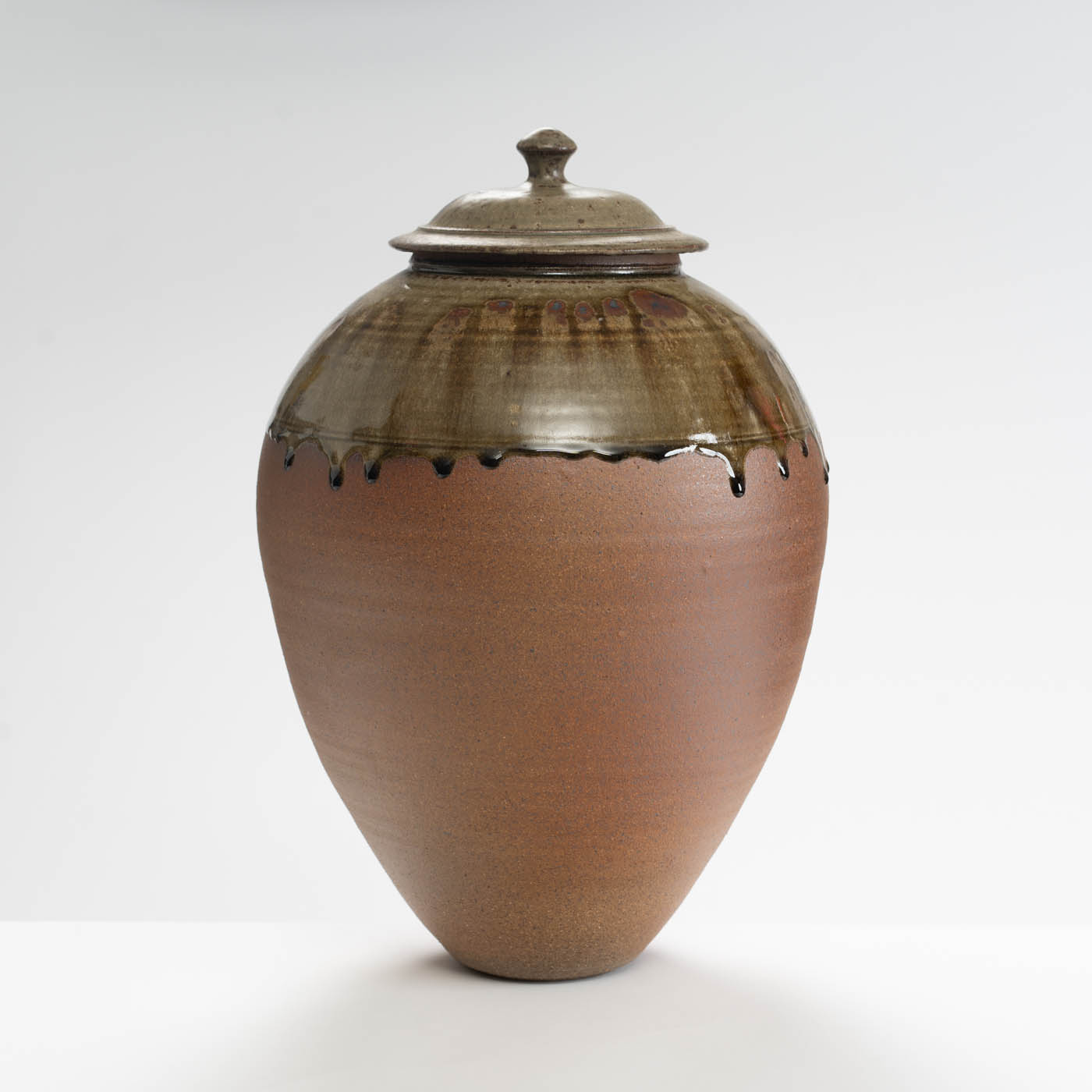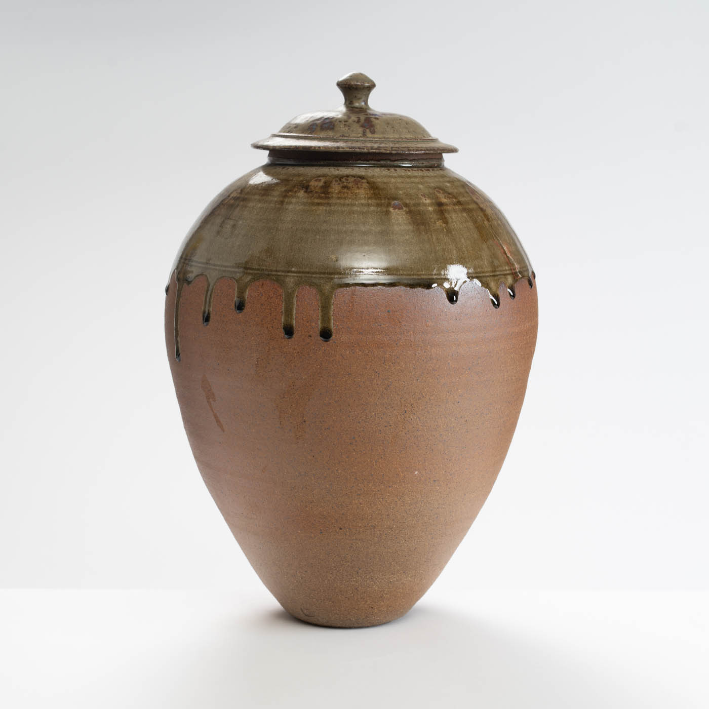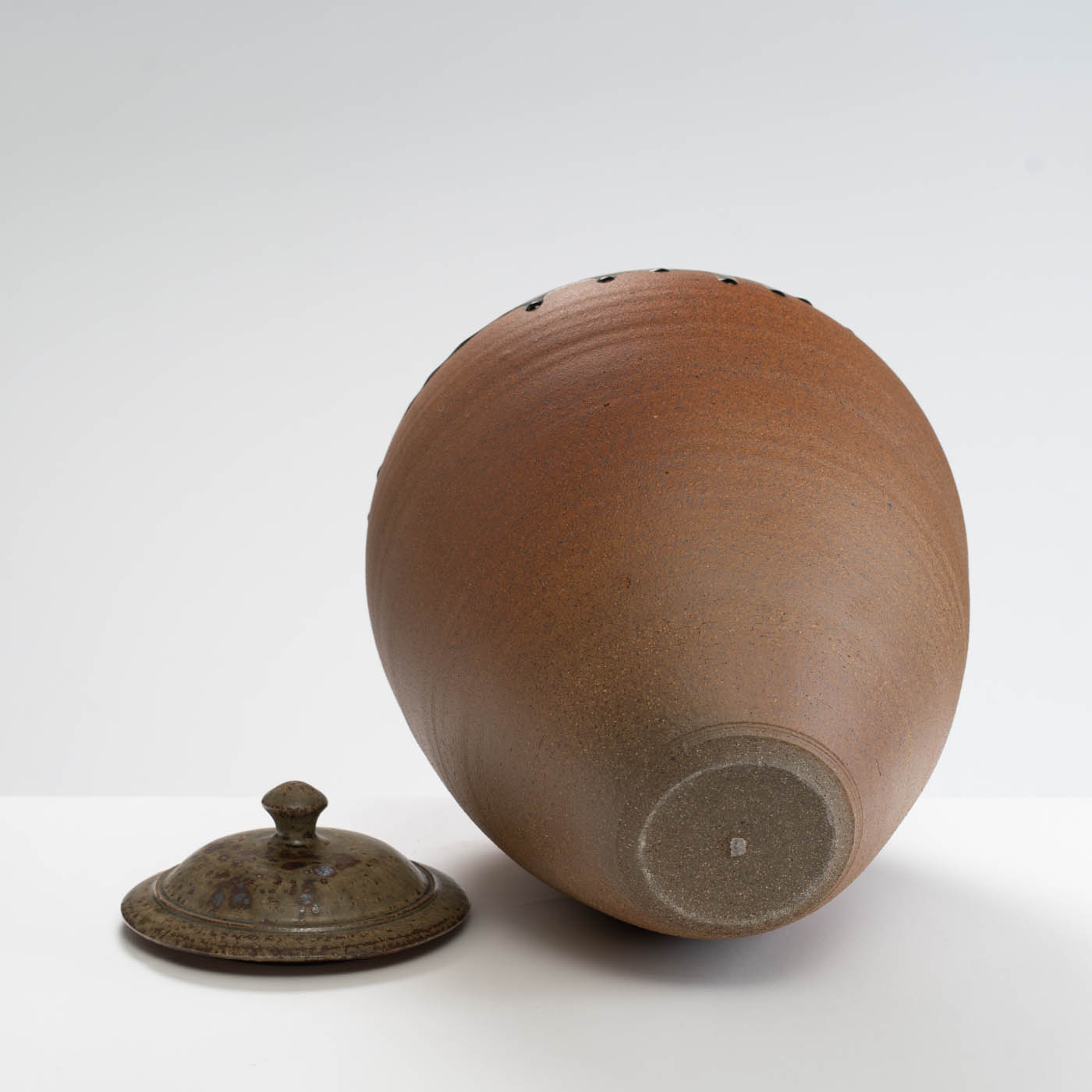 This lidded jar is thrown on a momentum wheel with lightly grogged and sanded stoneware clay. It is decorated with a natural glaze containing mixed wood ash with iron inclusions, and reduction fired in either a gas or wood kiln. Tom aims for a style of refined ‘country’ pottery robust enough for everyday use.