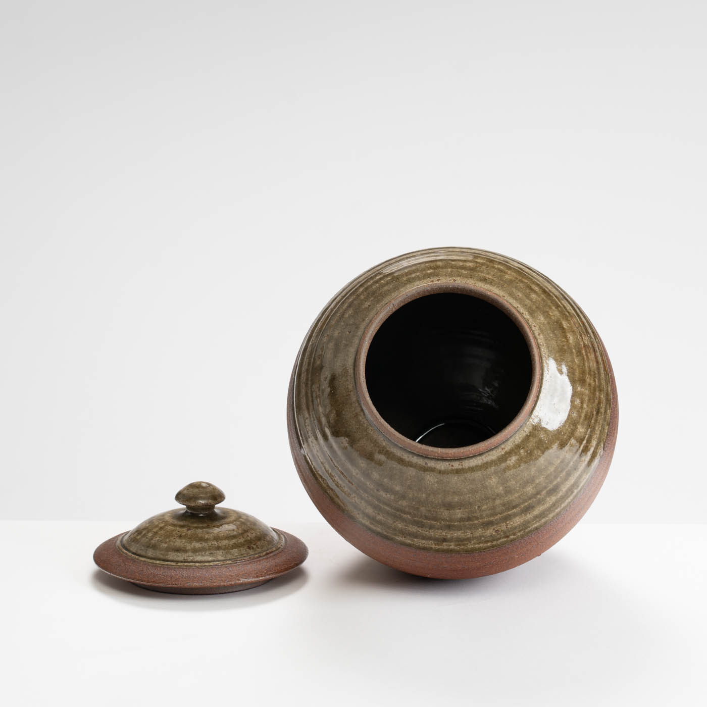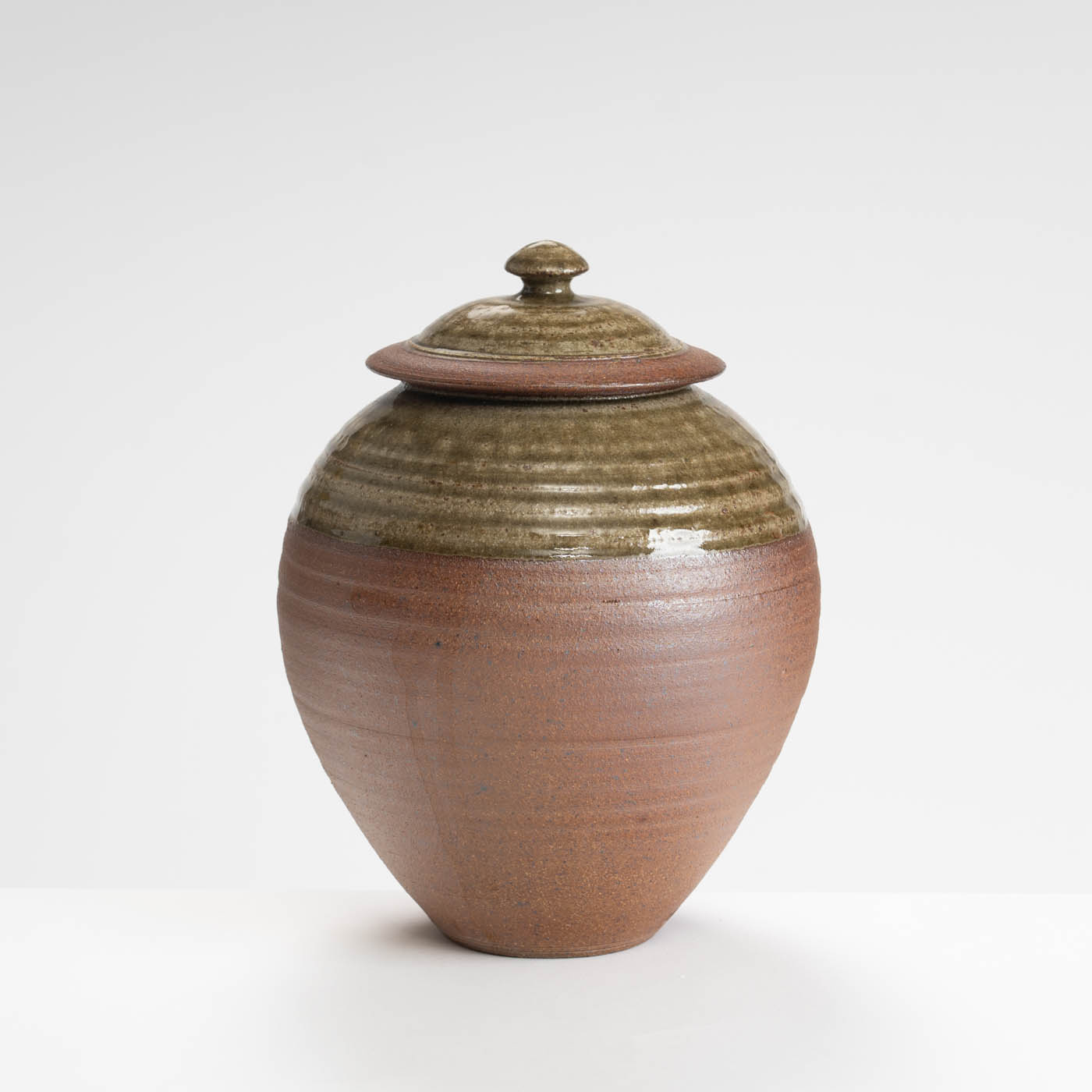 This lidded jar is thrown on a momentum wheel with lightly grogged and sanded stoneware clay. It is decorated with a natural glaze containing mixed wood ash, and reduction fired in either a gas or wood kiln. Tom aims for a style of refinedcountry’ pottery robust enough for everyday use.