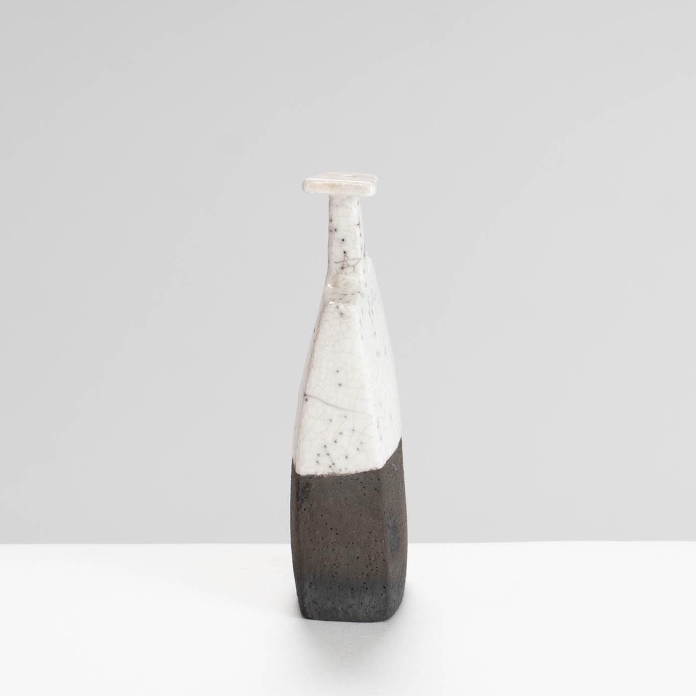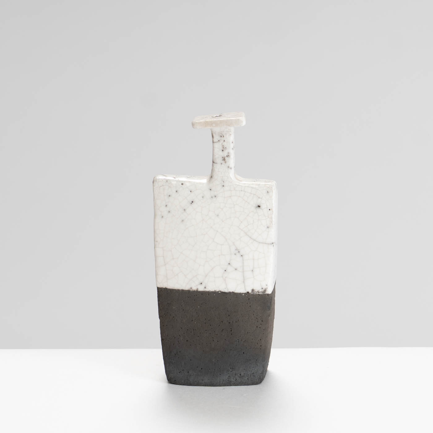 This bottle form is slab-built using Earthstone handbuilding clay and after bisque firing, raku fired which turns all unglazed areas, including the cracks, black.