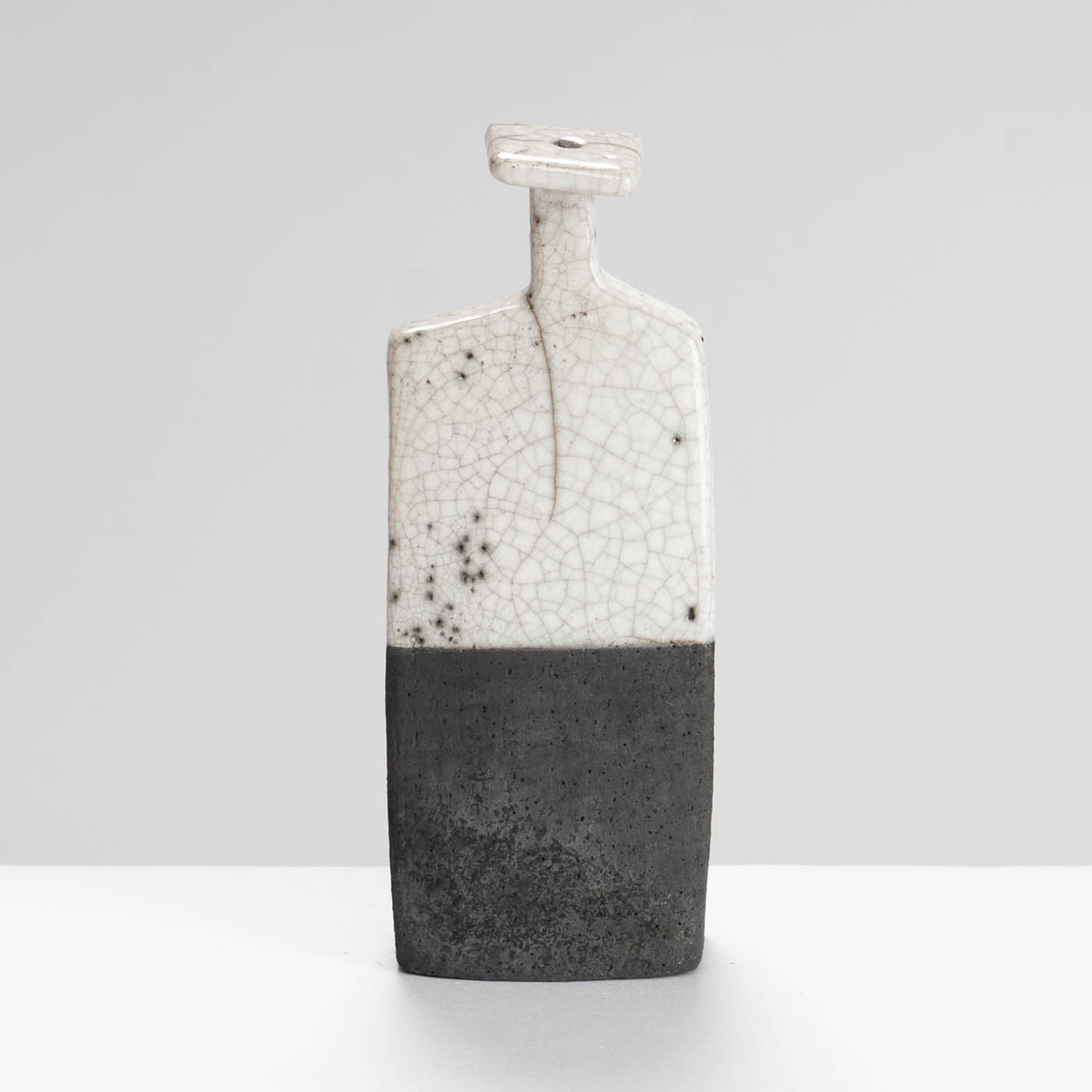 This bottle form is slab-built using Earthstone handbuilding clay and after bisque firing, raku fired which turns all unglazed areas, including the cracks, black.